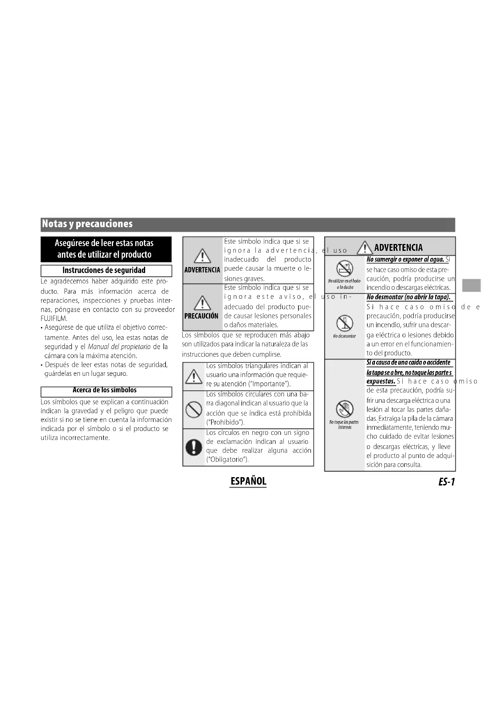 ADVERTENCIA ADVERTENCIA No utilizar en el baño o la ducha No sumergir o exponer al agua. Si se hace caso omiso de esta pre- caución, podría producirse un incendio o descargas eléctricas. No desmontar No desmontar (no abrir la tapa). Si hace caso omiso de esta precaución, podría producirse un incendio, sufrir una descar- ga eléctrica o lesiones debido a un error en el funcionamien- to del producto. No toque las partes internas Si a causa de una caída o accidente la tapa se a bre, no toque las parte s expuestas. Si hace caso omiso de esta precaución, podría su- frir una descarga eléctrica o una lesión al tocar las partes daña- das. Extraiga la pila de la cámara inmediatamente, teniendo mu- cho cuidado de evitar lesiones o descargas eléctricas, y lleve el producto al punto de adqui- sición para consulta.ES-2 ESPAÑOL
