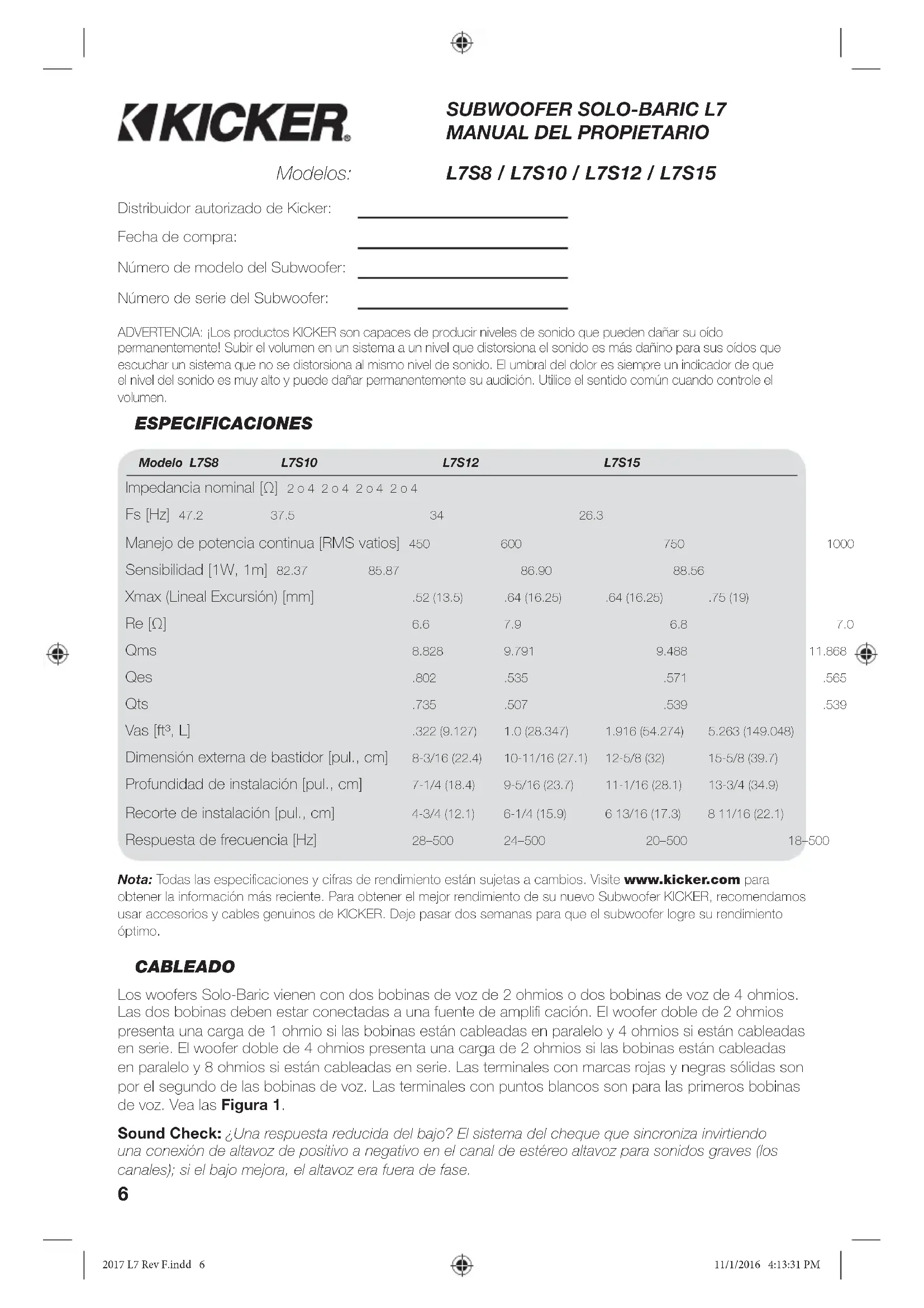 Distribuidor autorizado de Kicker: Fecha de compra: Número de modelo del Subwoofer: Número de serie del Subwoofer: Modelo L7S8 L7S10 L7S12 L7S15 Impedancia nominal [Ω] 2 o 4 2 o 4 2 o 4 2 o 4 Fs [Hz] 47.2 37.5 34 26.3 Manejo de potencia continua [RMS vatios] 450 600 750 1000 Sensibilidad [1W, 1m] 82.37 85.87 86.90 88.56 Xmax (Lineal Excursión) [mm] .52 (13.5) .64 (16.25) .64 (16.25) .75 (19) Re [Ω] 6.6 7.9 6.8 7.0 Qms 8.828 9.791 9.488 11.868 Qes .802 .535 .571 .565 Qts .735 .507 .539 .539 Vas [ft³, L] .322 (9.127) 1.0 (28.347) 1.916 (54.274) 5.263 (149.048) Dimensión externa de bastidor [pul., cm] 8-3/16 (22.4) 10-11/16 (27.1) 12-5/8 (32) 15-5/8 (39.7) Profundidad de instalación [pul., cm] 7-1/4 (18.4) 9-5/16 (23.7) 11-1/16 (28.1) 13-3/4 (34.9) Recorte de instalación [pul., cm] 4-3/4 (12.1) 6-1/4 (15.9) 6 13/16 (17.3) 8 11/16 (22.1) Respuesta de frecuencia [Hz] 28–500 24–500 20–500 18–500 L7S8 / L7S10 / L7S12 / L7S15Modelos: Nota: Todas las especifi caciones y cifras de rendimiento están sujetas a cambios. Visite www.kicker.com para obtener la información más reciente. Para obtener el mejor rendimiento de su nuevo Subwoofer KICKER, recomendamos usar accesorios y cables genuinos de KICKER. Deje pasar dos semanas para que el subwoofer logre su rendimiento óptimo. Sound Check: ¿Una respuesta reducida del bajo? El sistema del cheque que sincroniza invirtiendo una conexión de altavoz de positivo a negativo en el canal de estéreo altavoz para sonidos graves (los canales); si el bajo mejora, el altavoz era fuera de fase. ADVERTENCIA: ¡Los productos KICKER son capaces de producir niveles de sonido que pueden dañar su oído permanentemente! Subir el volumen en un sistema a un nivel que distorsiona el sonido es más dañino para sus oídos que escuchar un sistema que no se distorsiona al mismo nivel de sonido. El umbral del dolor es siempre un indicador de que el nivel del sonido es muy alto y puede dañar permanentemente su audición. Utilice el sentido común cuando controle el volumen. 2017 L7 Rev F.indd 62017 L7 Rev F.indd 6 11/1/2016 4:13:31 PM11/1/2016 4:13:31 PM7