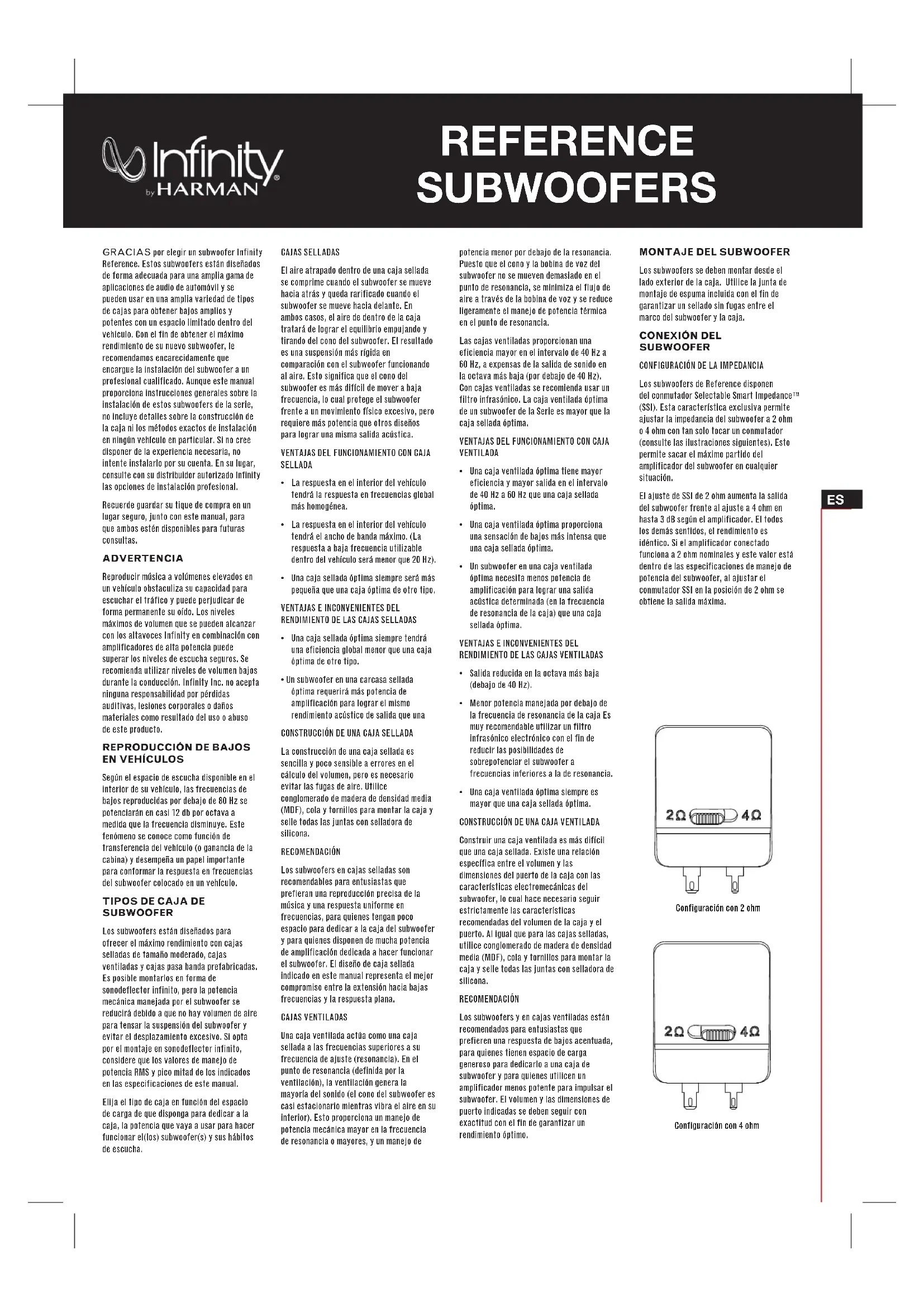 5-5/8" (142mm)9" (228mm)10-3/4" (272mm)11/16" (17 mm)6-1/2" (165mm)11-1/4" (285mm)12-15/16" (328mm)11/16" (17 mm)BRANCHEMENT DEL'AMPLIFICATEUR Les connecteurs du caisson de basses sont compatibles avec des connexions rapides (non fournies) ou brasées. La section de fil recommandée est entre 2,08 mm² et 8,37 mm², en fonction de la longueur du câble entre l'amplificateur et le haut-parleur de graves. Une section de fil plus importante est préférable au-delà de 2 m. La borne plus large est le positif et la plus étroite est le négatif (le capuchon de la borne porte également une marque). REMARQUE : Si vous utilisez un fil dénudé non étamé, veillez à ce que les brins des côtés + et - ne se touchent pas. Des brins en contact peuvent créer un court-circuit, qui peut endommager votre amplificateur.ES GRACIAS por elegir un subwoofer Infinity Reference. Estos subwoofers están diseñados de forma adecuada para una amplia gama de aplicaciones de audio de automóvil y se pueden usar en una amplia variedad de tipos de cajas para obtener bajos amplios y potentes con un espacio limitado dentro del vehículo. Con el fin de obtener el máximo rendimiento de su nuevo subwoofer, le recomendamos encarecidamente que encargue la instalación del subwoofer a un profesional cualificado. Aunque este manual proporciona instrucciones generales sobre la instalación de estos subwoofers de la serie, no incluye detalles sobre la construcción de la caja ni los métodos exactos de instalación en ningún vehículo en particular. Si no cree disponer de la experiencia necesaria, no intente instalarlo por su cuenta. En su lugar, consulte con su distribuidor autorizado Infinity las opciones de instalación profesional. Recuerde guardar su tique de compra en un lugar seguro, junto con este manual, para que ambos estén disponibles para futuras consultas. ADVERTENCIA Reproducir música a volúmenes elevados en un vehículo obstaculiza su capacidad para escuchar el tráfico y puede perjudicar de forma permanente su oído. Los niveles máximos de volumen que se pueden alcanzar con los altavoces Infinity en combinación con amplificadores de alta potencia puede superar los niveles de escucha seguros. Se recomienda utilizar niveles de volumen bajos durante la conducción. Infinity Inc. no acepta ninguna responsabilidad por pérdidas auditivas, lesiones corporales o daños materiales como resultado del uso o abuso de este producto.