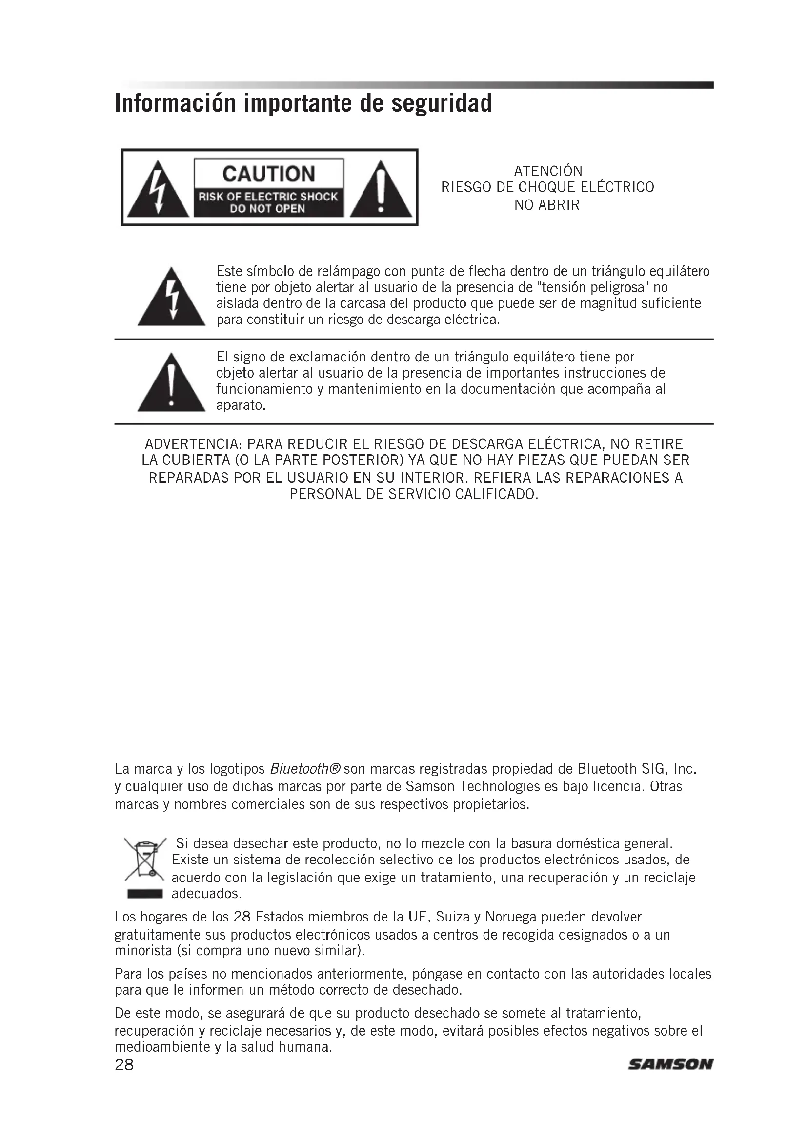 Technische Daten Frequenzgang (Level@Max, Einheitsverstärkung +1/-3dB) Mikrofon zu Hauptanschluss 30Hz~30KHz T.H.D (Level@Max, Einheitsverstärkung, 20Hz~30KHz A-bewertet) Mikrofon/Line zu Hauptanschluss <0,02%. Line zu Hauptanschluss <0,02%. Äquivalentes Eingangsrauschen Mikrofon (Level@Max) <-75dB 20Hz~30KHz A-bewertet Maximale Spannungsverstärkung Mikrofon zu Hauptanschluss 32dB Line zu Hauptanschluss 8dB (Cinch-Eingang) Stereo Line zu Hauptanschluss 8dB (1/4-Zoll-,1/8-Zoll-Eingang) Restrauschen (30kHz LPF, alle Regler Min.) Hauptanschluss (alle Pegel Min.) -110dB Übersprechen (@1kHz mit 30kHz LPF) Eingang vs. Ausgang (Einheitsverstärkung, Pegeleinstellung min.) >82dB Eingang vs. Ausgang (max. Ausgang, Pegeleinstellung min.) >70dB Maximaler Eingangspegel (@1kHz) Mikrofoneingang -18dB Maximaler Ausgangspegel (@1kHz) Mikrofonausgang +14dB Eingangskanal-Equalizer (±3dB) Hoch ±12dB bei 12KHz Niedrig ±10dB bei 80Hz USB-Ausgangsleistung USB 3.0 +5V DC 0,2A max. Phantomspeisung 15Volt DC Leistungsbedarf DC 15V 800mA Bluetooth Bluetooth V4.0, A2DP Arbeitsfrequenz 2,402GHz ~ 2,480GHz HF-Leistung <10mW EIRP Abmessungen und Gewicht Abmessungen 223mm x 138mm x 43mm 8,78Zoll x 5,43Zoll x 1,69Zoll Gewicht 0,8kg/1,76lbs28 La marca y los logotipos Bluetooth® son marcas registradas propiedad de Bluetooth SIG, Inc. y cualquier uso de dichas marcas por parte de Samson Technologies es bajo licencia. Otras marcas y nombres comerciales son de sus respectivos propietarios. Información importante de seguridad Si desea desechar este producto, no lo mezcle con la basura doméstica general. Existe un sistema de recolección selectivo de los productos electrónicos usados, de acuerdo con la legislación que exige un tratamiento, una recuperación y un reciclaje adecuados. Los hogares de los 28 Estados miembros de la UE, Suiza y Noruega pueden devolver gratuitamente sus productos electrónicos usados a centros de recogida designados o a un minorista (si compra uno nuevo similar). Para los países no mencionados anteriormente, póngase en contacto con las autoridades locales para que le informen un método correcto de desechado. De este modo, se asegurará de que su producto desechado se somete al tratamiento, recuperación y reciclaje necesarios y, de este modo, evitará posibles efectos negativos sobre el medioambiente y la salud humana. ADVERTENCIA: PARA REDUCIR EL RIESGO DE DESCARGA ELÉCTRICA, NO RETIRE LA CUBIERTA (O LA PARTE POSTERIOR) YA QUE NO HAY PIEZAS QUE PUEDAN SER REPARADAS POR EL USUARIO EN SU INTERIOR. REFIERA LAS REPARACIONES A PERSONAL DE SERVICIO CALIFICADO. Este símbolo de relámpago con punta de flecha dentro de un triángulo equilátero tiene por objeto alertar al usuario de la presencia de "tensión peligrosa" no aislada dentro de la carcasa del producto que puede ser de magnitud suficiente para constituir un riesgo de descarga eléctrica. El signo de exclamación dentro de un triángulo equilátero tiene por objeto alertar al usuario de la presencia de importantes instrucciones de funcionamiento y mantenimiento en la documentación que acompaña al aparato. ATENCIÓN
