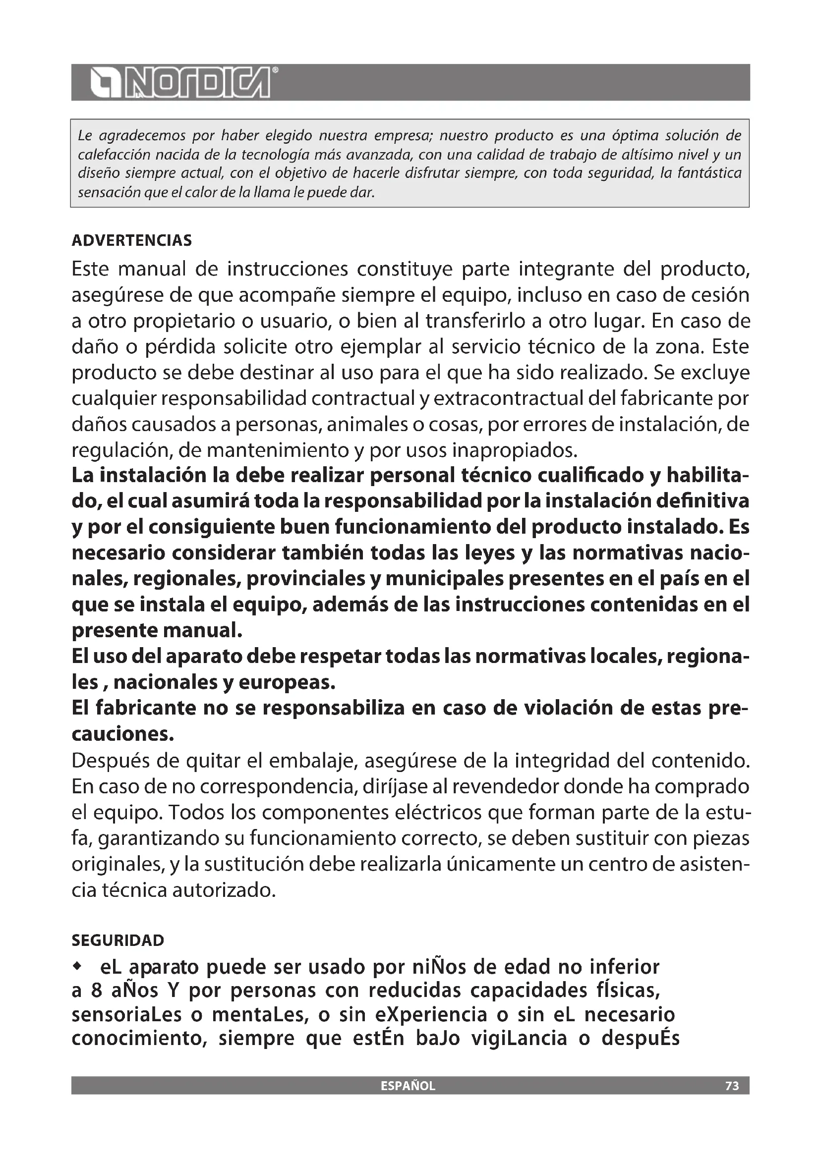 - La instalación debe permitir el acceso para la limpieza y el mantenimiento del producto y de la chimenea. A EMPRESA LANORDICA S.P.A. DECLINA TODA RESPONSABILIDAD POR DAÑOS, CAUSADOS POR LA INSTALACIÓN, A COSAS Y/O PERSONAS. ADEMÁS NO SE RESPONSABILIZA DE MODIFICACIONES DEL PRODUCTO EFECTUADAS SIN AUTORIZACIÓN, ASÍ COMO DEL USO DE REPUESTOS NO ORIGINALES. INFORME AL DESHOLLINADOR HABITUAL LOCAL ACERCA DE LA INSTALACIÓN DEL PRODUCTO, PARA QUE PUEDA COMPROBAR LA CORRECTA INSTALACIÓN Y LA EFICIENCIA DE LA CONEXIÓN AL CONDUCTO DE SALIDA DE HUMOS. 76ESPAÑOL SEGURIDAD ANTIINCENDIO DURANTE LA INSTALACIÓN DEL PRODUCTO SE DEBEN CUMPLIR LAS SIGUIENTES MEDIDAS DE SEGURIDAD: a) para asegurar un aislamiento térmico adecuado, debe respetarse la distancia mínima de seguridad desde la parte trasera y desde ambos lados de construcciones y objetos inamables y sensibles al calor (muebles, revestimientos de madera, telas, etc.) (véase Figura 4 - A-B). TODAS LAS DISTANCIAS MÍNIMAS DE SEGURIDAD SE MUESTRAN EN LA PLACA TÉCNICA DEL PRODUCTO Y NO DEBEN SER EMPLEADAS MEDIDAS INFERIORES A ESTAS (Véase DECLARACIÓN DE PRESTACIÓN). b) Delante de la puerta del fogón, en el área de radiación de la misma no debe haber ningún objeto o material de construcción inamable y sensible al calor a menos de véase Figura 4 - A de distancia. Dicha distancia puede reducirse a 40 cm si se instala una protección, ventilada en el respaldo y resistente al calor, que cubra por completo el objeto entero que se ha de proteger. c) En caso el producto sea instalado sobre un PISO DE MATERIAL INFLAMABLE, DEBERÁ SER APLICADA UNA SUBCAPA IGNÍFUGA. PISOS ECHOS EN MATERIAL INFLAMABLE, como moquette, parquet o corcho etc, DEBERÁN SER CUBIERTOS POR UNA CAPA DE MATERIAL NO INFLAMABLE, por ejemplo cerámica o piedra, vidrio o acero etc. (dimensiones según cada norma local). La subcapa debe sobresalir por atraz de almenos 30 cm por lado y por adelante 50 cm mas allá de la abertura de la puerta de carga (Figura 4 - B). D NO DEBEN COLOCARSE ENCIMA DEL PRODUCTO COMPONENTES INFLAMABLES (como muebles o armarios suspendidos). EL PRODUCTO DEBE FUNCIONAR SIEMPRE CON EL CENICERO INTRODUCIDO. LOS RESIDUOS SÓLIDOS DE LA COMBUSTIÓN CENIZAS DEBEN RECOGERSE EN UN RECIPIENTE HERMÉTICO Y RESISTENTE AL FUEGO. NUNCA ENCIENDA LA ESTUFA SI HAY EMISIONES DE GAS O VAPORES COMO COLA PARA LINÓLEO, GASOLINA ETC.. NO DEPOSITE MATERIALES INFLAMABLES CERCA DE ELLA. DURANTE LA COMBUSTIÓN SE DESARROLLA UNA ENERGÍA TÉRMICA QUE IMPLICA UN MARCADO CALENTAMIENTO DE LAS SUPERFICIES, DE LA PUERTA Y DEL CRISTAL DEL HOGAR, ASÍ COMO DE LAS MANILLAS DE LAS PUERTAS O DE LOS MANDOS, DEL TUBO DE HUMOS Y DE LA PARTE ANTERIOR DEL APARATO. EVITE EL CONTACTO CON DICHOS ELEMENTOS SIN EL ADECUADO VESTUARIO O ACCESORIOS DE PROTECCIÓN GUANTES RESISTENTES AL CALOR, DISPOSITIVOS DE MANDO.INFORME A LOS NIÑOS ACERCA DE ESTOS PELIGROS Y MANTÉNGALOS LEJOS DEL HOGAR MIENTRAS ESTÉ FUNCIONANDO. SI SE UTILIZA UN COMBUSTIBLE EQUIVOCADO O DEMASIADO HÚMEDO, PUEDEN FORMARSE SEDIMENTOS CREOSOTA EN EL CONDUCTO DE SALIDA DE HUMOS, Y POR CONSIGUIENTE EL POSIBLE INCENDIO DEL CONDUCTO MISMO.