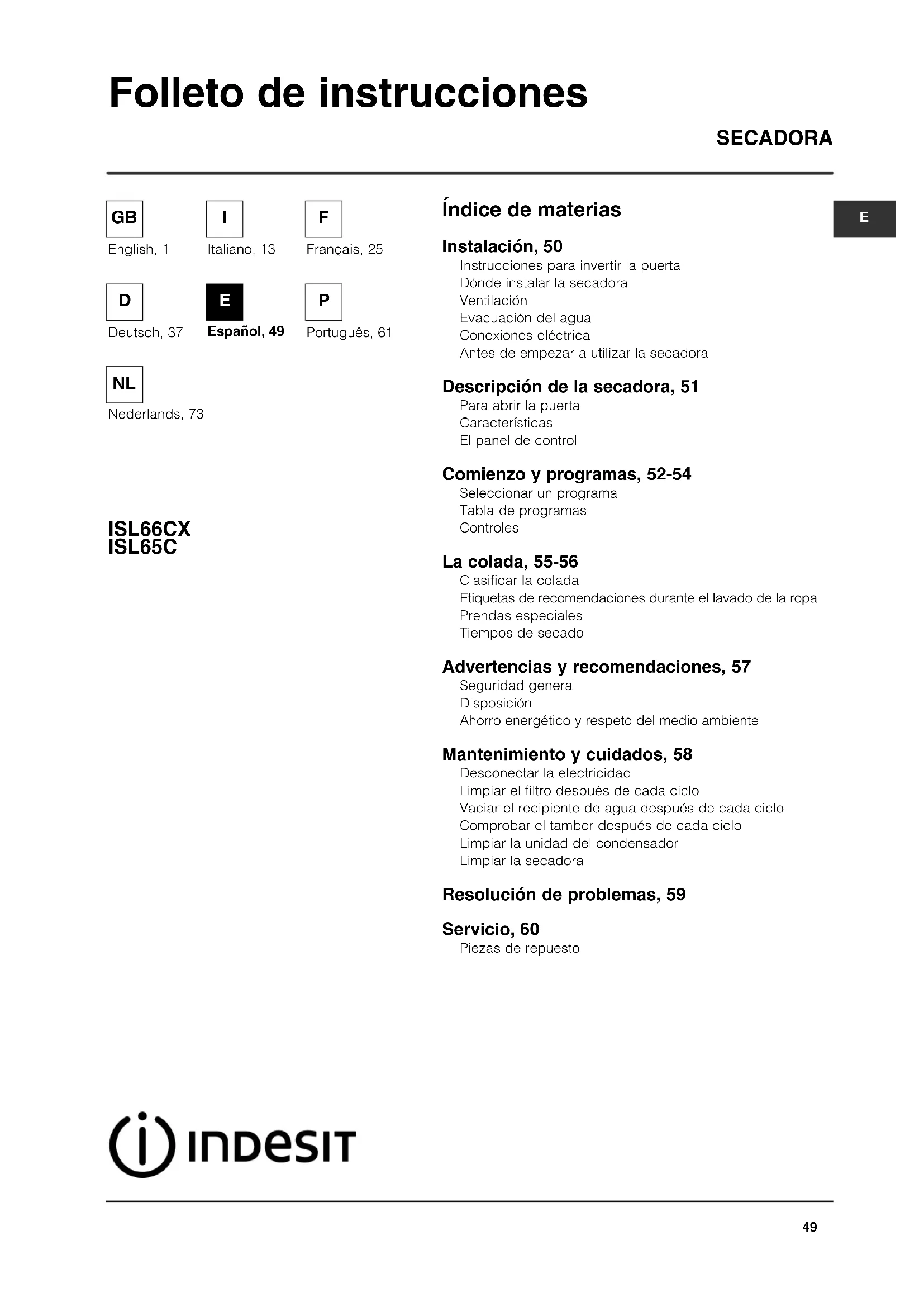 Für Vergleichstests gemäß EN61121 empfohlene Programme ! Hinweis: Hierbei handelt es sich nicht um eine vollständige Liste aller Programmoptionen (siehe Start und Programme). Programm Auszuwählendes Programm Ladung (EN61121) Baumwolle trocken 2 Baumwolle - Kleiderbügel trocken 6 kg Baumwolle bügeltrocken 3 Baumwolle - Bügeltrocken 6 kg Pflegeleichtes Gewebe 4 Synthetik - Schranktrocken 3 kgÍndice de materias SECADORA ISL66CX ISL65C Folleto de instrucciones Instalación, 50 Instrucciones para invertir la puerta Dónde instalar la secadora Ventilación Evacuación del agua Conexiones eléctrica Antes de empezar a utilizar la secadora Descripción de la secadora, 51 Para abrir la puerta Características El panel de control Comienzo y programas, 52-54 Seleccionar un programa Tabla de programas Controles La colada, 55-56 Clasificar la colada Etiquetas de recomendaciones durante el lavado de la ropa Prendas especiales Tiempos de secado Advertencias y recomendaciones, 57 Seguridad general Disposición Ahorro energético y respeto del medio ambiente Mantenimiento y cuidados, 58 Desconectar la electricidad Limpiar el filtro después de cada ciclo Vaciar el recipiente de agua después de cada ciclo Comprobar el tambor después de cada ciclo Limpiar la unidad del condensador Limpiar la secadora Resolución de problemas, 59 Servicio, 60 Piezas de repuesto