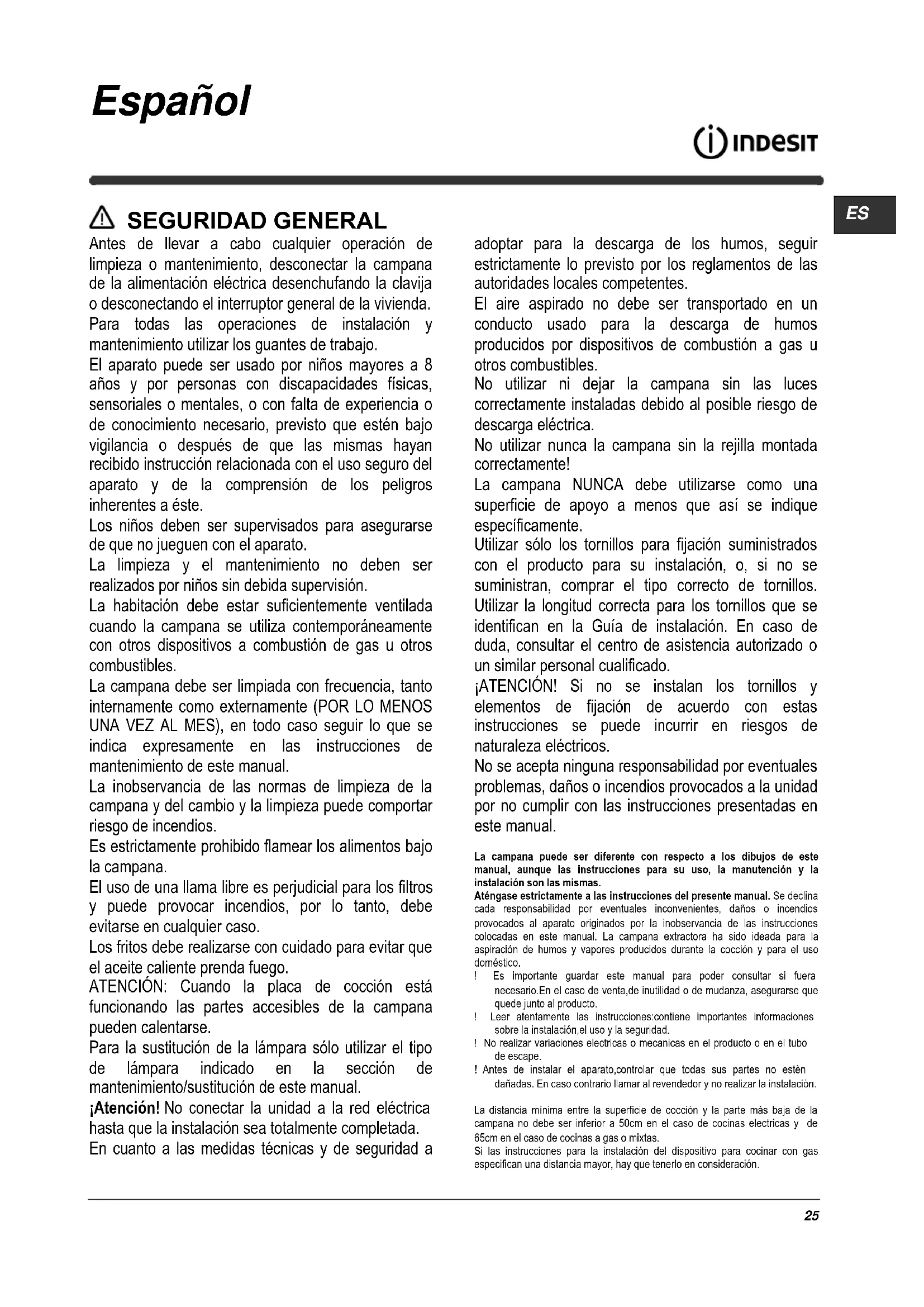 SEGURIDAD GENERAL Antes de llevar a cabo cualquier operación de limpieza o mantenimiento, desconectar la campana de la alimentación eléctrica desenchufando la clavija o desconectando el interruptor general de la vivienda. Para todas las operaciones de instalación y mantenimiento utilizar los guantes de trabajo. El aparato puede ser usado por niños mayores a 8 años y por personas con discapacidades físicas, sensoriales o mentales, o con falta de experiencia o de conocimiento necesario, previsto que estén bajo vigilancia o después de que las mismas hayan recibido instrucción relacionada con el uso seguro del aparato y de la comprensión de los peligros inherentes a éste. Los niños deben ser supervisados para asegurarse de que no jueguen con el aparato. La limpieza y el mantenimiento no deben ser realizados por niños sin debida supervisión. La habitación debe estar suficientemente ventilada cuando la campana se utiliza contemporáneamente con otros dispositivos a combustión de gas u otros combustibles. La campana debe ser limpiada con frecuencia, tanto internamente como externamente (POR LO MENOS UNA VEZ AL MES), en todo caso seguir lo que se indica expresamente en las instrucciones de mantenimiento de este manual. La inobservancia de las normas de limpieza de la campana y del cambio y la limpieza puede comportar riesgo de incendios. Es estrictamente prohibido flamear los alimentos bajo la campana. El uso de una llama libre es perjudicial para los filtros y puede provocar incendios, por lo tanto, debe evitarse en cualquier caso. Los fritos debe realizarse con cuidado para evitar que el aceite caliente prenda fuego. ATENCIÓN: Cuando la placa de cocción está funcionando las partes accesibles de la campana pueden calentarse. Para la sustitución de la lámpara sólo utilizar el tipo de lámpara indicado en la sección de mantenimiento/sustitución de este manual. ¡Atención! No conectar la unidad a la red eléctrica hasta que la instalación sea totalmente completada. En cuanto a las medidas técnicas y de seguridad a adoptar para la descarga de los humos, seguir estrictamente lo previsto por los reglamentos de las autoridades locales competentes. El aire aspirado no debe ser transportado en un conducto usado para la descarga de humos producidos por dispositivos de combustión a gas u otros combustibles. No utilizar ni dejar la campana sin las luces correctamente instaladas debido al posible riesgo de descarga eléctrica. No utilizar nunca la campana sin la rejilla montada correctamente! La campana NUNCA debe utilizarse como una superficie de apoyo a menos que así se indique específicamente. Utilizar sólo los tornillos para fijación suministrados con el producto para su instalación, o, si no se suministran, comprar el tipo correcto de tornillos. Utilizar la longitud correcta para los tornillos que se identifican en la Guía de instalación. En caso de duda, consultar el centro de asistencia autorizado o un similar personal cualificado. ¡ATENCIÓN! Si no se instalan los tornillos y elementos de fijación de acuerdo con estas instrucciones se puede incurrir en riesgos de naturaleza eléctricos. No se acepta ninguna responsabilidad por eventuales problemas, daños o incendios provocados a la unidad por no cumplir con las instrucciones presentadas en este manual. La campana puede ser diferente con respecto a los dibujos de este manual, aunque las instrucciones para su uso, la manutención y la instalación son las mismas. Aténgase estrictamente a las instrucciones del presente manual. Se declina cada responsabilidad por eventuales inconvenientes, daños o incendios provocados al aparato originados por la inobservancia de las instrucciones colocadas en este manual. La campana extractora ha sido ideada para la aspiración de humos y vapores producidos durante la cocción y para el uso doméstico. ! Es importante guardar este manual para poder consultar si fuera necesario.En el caso de venta,de inutilidad o de mudanza, asegurarse que quede junto al producto. ! Leer atentamente las instrucciones:contiene importantes informaciones sobre la instalación,el uso y la seguridad. ! No realizar variaciones electricas o mecanicas en el producto o en el tubo de escape. ! Antes de instalar el aparato,controlar que todas sus partes no estèn dañadas. En caso contrario llamar al revendedor y no realizar la instalaciòn. La distancia mínima entre la superficie de cocción y la parte más baja de la campana no debe ser inferior a 50cm en el caso de cocinas electricas y de 65cm en el caso de cocinas a gas o mixtas. Si las instrucciones para la instalación del dispositivo para cocinar con gas especifican una distancia mayor, hay que tenerlo en consideración.26