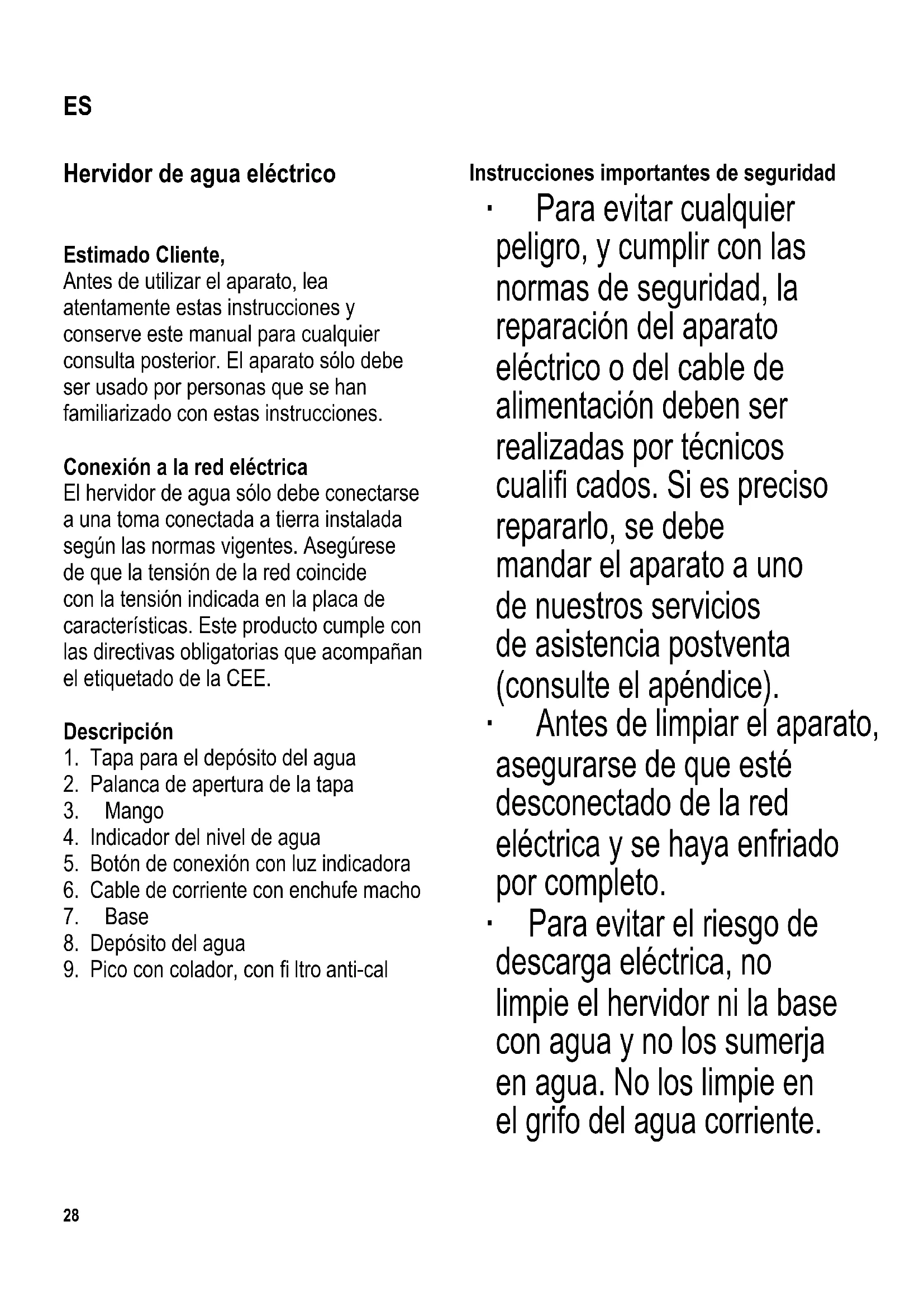 Instrucciones importantes de seguridad ∙ Para evitar cualquier peligro, y cumplir con las normas de seguridad, la reparación del aparato eléctrico o del cable de alimentación deben ser realizadas por técnicos cualifi cados. Si es preciso repararlo, se debe mandar el aparato a uno de nuestros servicios de asistencia postventa (consulte el apéndice). ∙ Antes de limpiar el aparato, asegurarse de que esté desconectado de la red eléctrica y se haya enfriado por completo. ∙ Para evitar el riesgo de descarga eléctrica, no limpie el hervidor ni la base con agua y no los sumerja en agua. No los limpie en el grifo del agua corriente. ES29 ∙ El aparato se debe descalcifi car con regularidad. Limpie el depósito de agua con un paño húmedo, cuando sea necesario. ∙ Se incluye información detallada sobre la limpieza del aparato en la sección Limpieza y mantenimiento. ∙ Este aparato podrá ser utilizado por niños (mayores de 8 años) y personas con reducidas facultades físicas, sensoriales o mentales, o sin experiencia ni conocimiento del producto, siempre que hayan recibido la supervisión o instrucciones referentes al uso del aparato y entiendan por completo el peligro y las precauciones de seguridad. ∙ Los niños no deben jugar con el aparato. ∙ No se debe permitir que los niños realicen ningún trabajo de limpieza o mantenimiento del aparato a menos que esté bajo vigilancia y tengan más de 8 años. ∙ El aparato y su cable eléctrico siempre se deben mantener fuera del alcance de niños menores de 8 años. ∙ Este aparato ha sido diseñado para el uso doméstico u otra aplicación similar, por ejemplo - en cocinas de personal, en ofi cinas y otros puntos comerciales, - en empresas agrícolas, - por los clientes de hoteles, pensiones, etc. y alojamientos similares, - en casas rurales. ∙ Las superfi cies exteriores30 se calientan durante el uso y se mantendrán calientes durante cierto tiempo. ∙ No deje el hervidor de agua desatendido cuando lo esté utilizando. Utilice solo agua pura para llenar el depósito hasta el nivel deseado, respetando las señales de nivel Min. (0.5 l) y Max. (1.7 l) del indicador. Si sobrepasa la capacidad del depósito puede haber peligro de que el agua salga al hervir. ∙ Tenga también cuidado de no quemarse con el vapor muy caliente generado. Por ello, no debe tocar ninguna pieza del aparato excepto el asa durante su utilización. ∙ Cuidado: Durante el proceso de ebullición del agua y cuando sirva el agua caliente, debe mantener la tapa cerrada en todo momento. ∙ El hervidor sólo puede usarse con la base suministrada. ∙ No separe nunca el recipiente de agua de la base (o vuelva a colocarlo) mientras el aparato está encendido. ∙ Si el recipiente de agua no está en su base, asegúrese de que no resbalará sobre cualquier superfi cie lisa. ∙ Las conexiones eléctricas de la base se deben proteger siempre para evitar su contacto con agua. ∙ Precaución: El uso incorrecto puede provocar lesiones personales graves. ∙ Precaución: Mantenga a los niños alejados del material de embalaje, porque podría ser peligroso, existe el peligro de asfi xia.31 ∙ Antes de utilizar el aparato, siempre se debe comprobar que tanto la unidad principal, el cable de alimentación como cualquier accesorio no están defectuosos. En caso de que el aparato haya caído sobre una superfi cie dura, o se haya tirado en exceso del cable de alimentación, no se deberá utilizar de nuevo: incluso los desperfectos no visibles pueden tener efectos adversos sobre la seguridad en el uso del aparato. ∙ El aparato sólo se debe utilizar sobre una superfi cie nivelada, resistente al calor. ∙ No ponga el aparato en funcionamiento debajo de un armario empotrado u objeto similar; el vapor emitido podría quedar acumulado debajo del armario. ∙ No deje que la carcasa ni el cable entren en contacto con llamas ni con ninguna superfi cie caliente tales como platos muy calientes. ∙ No deje que el cable de la corriente cuelgue suelto y manténgalo bien alejado de las partes calientes de la carcasa. ∙ Tenga mucho cuidado cuando transporte el recipiente con agua caliente en su interior. ∙ Desenchufe siempre el hervidor - después del uso, - si hay una avería y, - antes de limpiarlo. Utilización correcta ∙ Este aparato ha sido diseñado exclusivamente para calentar agua limpia y fresca. Cualquier otra utilización debe ser considerada inapropiada y puede provocar lesiones personales o daños materiales. ∙ No es adecuado para calentar leche, té u otros alimentos y bebidas. Desconexión térmica de seguridad El dispositivo de desconexión térmica de seguridad evita el sobrecalentamiento de la resistencia, en caso de que el aparato se encienda accidentalmente sin agua, o la resistencia térmica esté calcifi cada. Una vez que la desconexión de seguridad haya apagado el hervidor, se deberá dejar que el hervidor se enfríe sufi ciente, o se deberá descalcifi car antes de enchufarlo de nuevo. Antes de usarlo por primera vez Para garantizar la limpieza total, hierva y tire el agua hervida por primera vez. Para hervir agua ∙ Retire el depósito del agua de su base. ∙ Pulse la palanca de apertura en el mango para abrir la tapa, y llene el depósito de agua hasta el nivel deseado, respetando las señales de nivel Mín (0.5 l) y Máx (1.7 l). ∙ Cierre la tapa y vuelva a colocar el recipiente sobre la base. ∙ Enchúfelo en una toma de pared apropiada y pulse el botón de conexión. Se enciende la luz indicadora.32 ∙ Empieza el proceso de ebullición. Una vez que ha llegado al punto de ebullición, el aparato se apaga automáticamente con el dispositivo de corte de corriente de vapor integrado. La luz indicadora se apaga. ∙ Si quiere interrumpir el proceso de ebullición, apague el aparato con el botón de conexión. ∙ Para servir el agua, retire el depósito de su base. ∙ Para evitar la emisión de vapor, asegúrese de que la tapa está bien