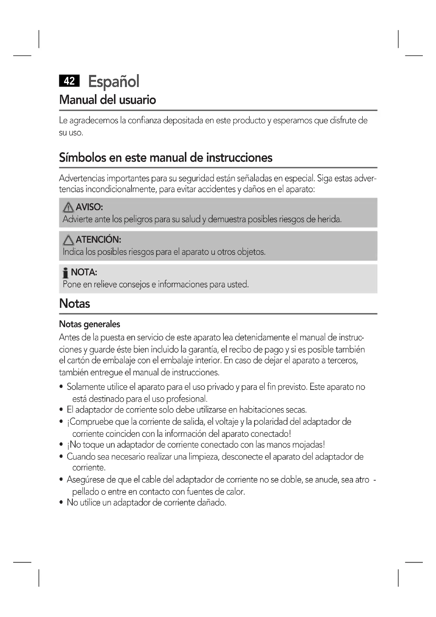Manual del usuario Le agradecemos la confianza depositada en este producto y esperamos que disfrute de su uso. Símbolos en este manual de instrucciones Advertencias importantes para su seguridad están señaladas en especial. Siga estas adver- tencias incondicionalmente, para evitar accidentes y daños en el aparato: AVISO: Advierte ante los peligros para su salud y demuestra posibles riesgos de herida. ATENCIÓN: Indica los posibles riesgos para el aparato u otros objetos. NOTA: Pone en relieve consejos e informaciones para usted. Notas Notas generales Antes de la puesta en servicio de este aparato lea detenidamente el manual de instruc