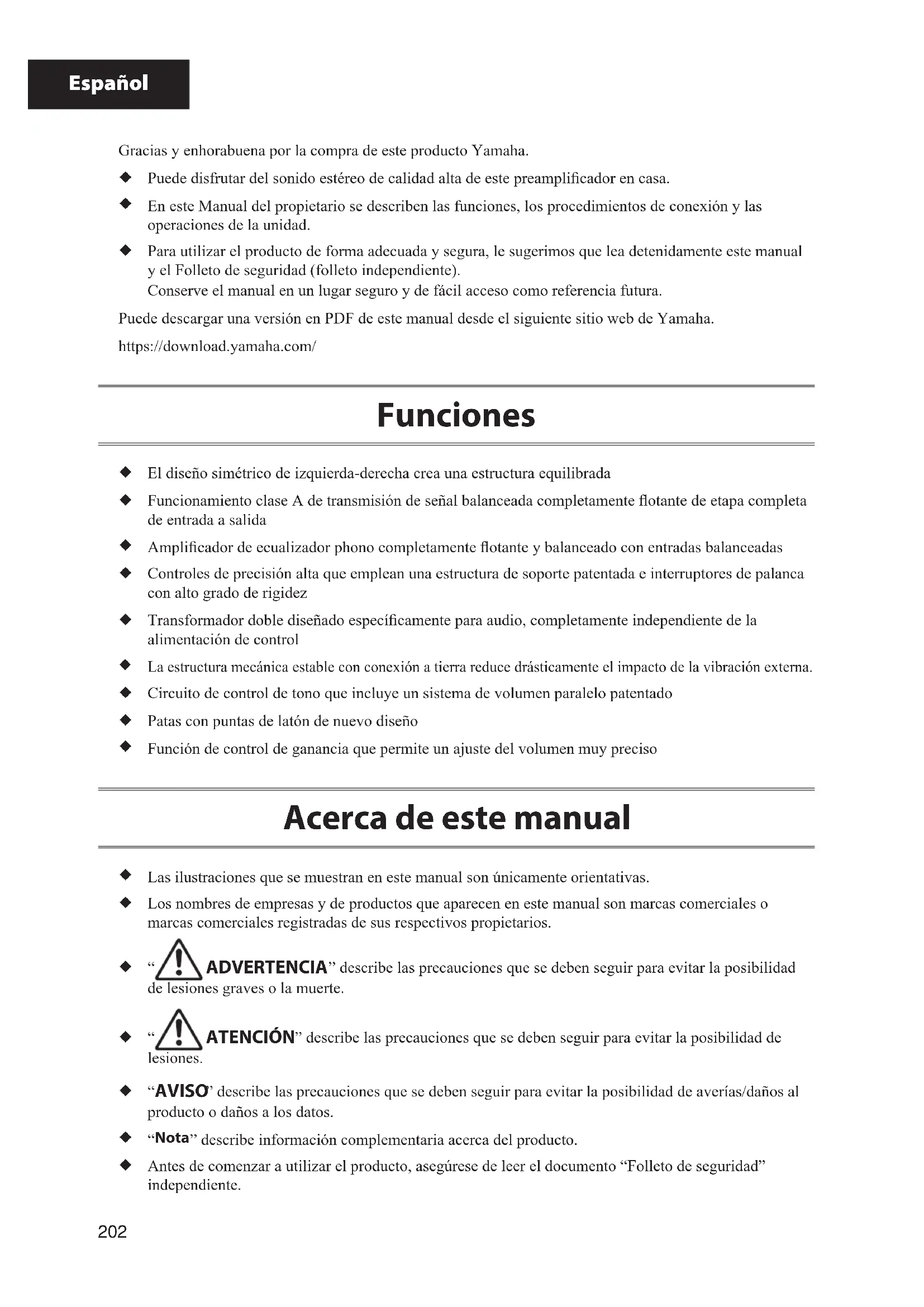 Para utilizar el producto de forma adecuada y segura, le sugerimos que lea detenidamente este manual y el Folleto de seguridad (folleto independiente). Conserve el manual en un lugar seguro y de fácil acceso como referencia futura.Puede descargar una versión en PDF de este manual desde el siguiente sitio web de Yamaha.https://download.yamaha.com/ Funciones