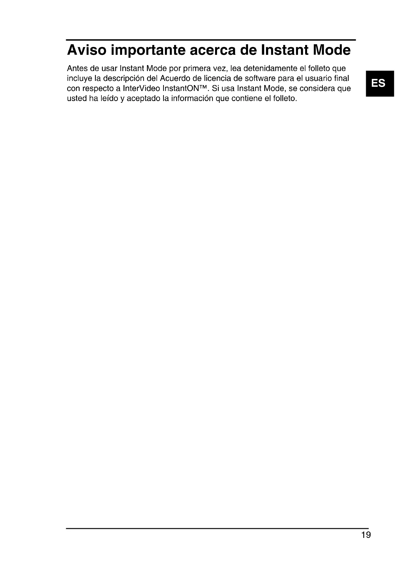 Antes de usar Instant Mode por primera vez, lea detenidamente el folleto que incluye la descripción del Acuerdo de licencia de software para el usuario final con disrespect a InterVideo InstantON™. Si usa Instant Mode, se considera queusted ha leído yaceptado la información que contiene el folleto.