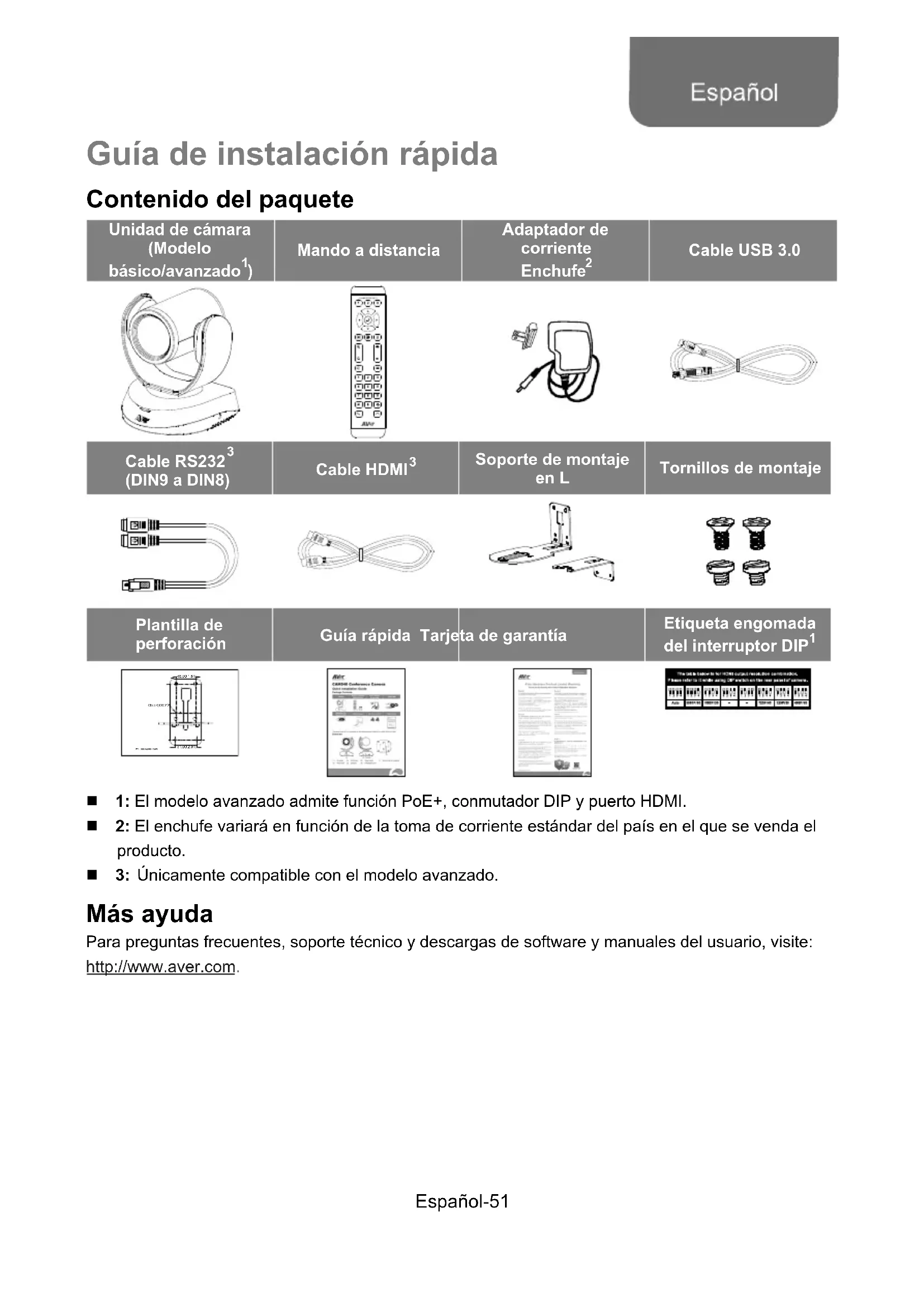 1: El modelo avanzado admite función PoE+, conmutador DIP y puerto HDMI. 2: El enchufe variará en función de la toma de corriente estándar del país en el que se venda el producto. 3: Únicamente compatible con el modelo avanzado. Más ayuda Para preguntas frecuentes, soporte técnico y descargas de software y manuales del usuario, visite: http://www.aver.com. Español-52 Información general