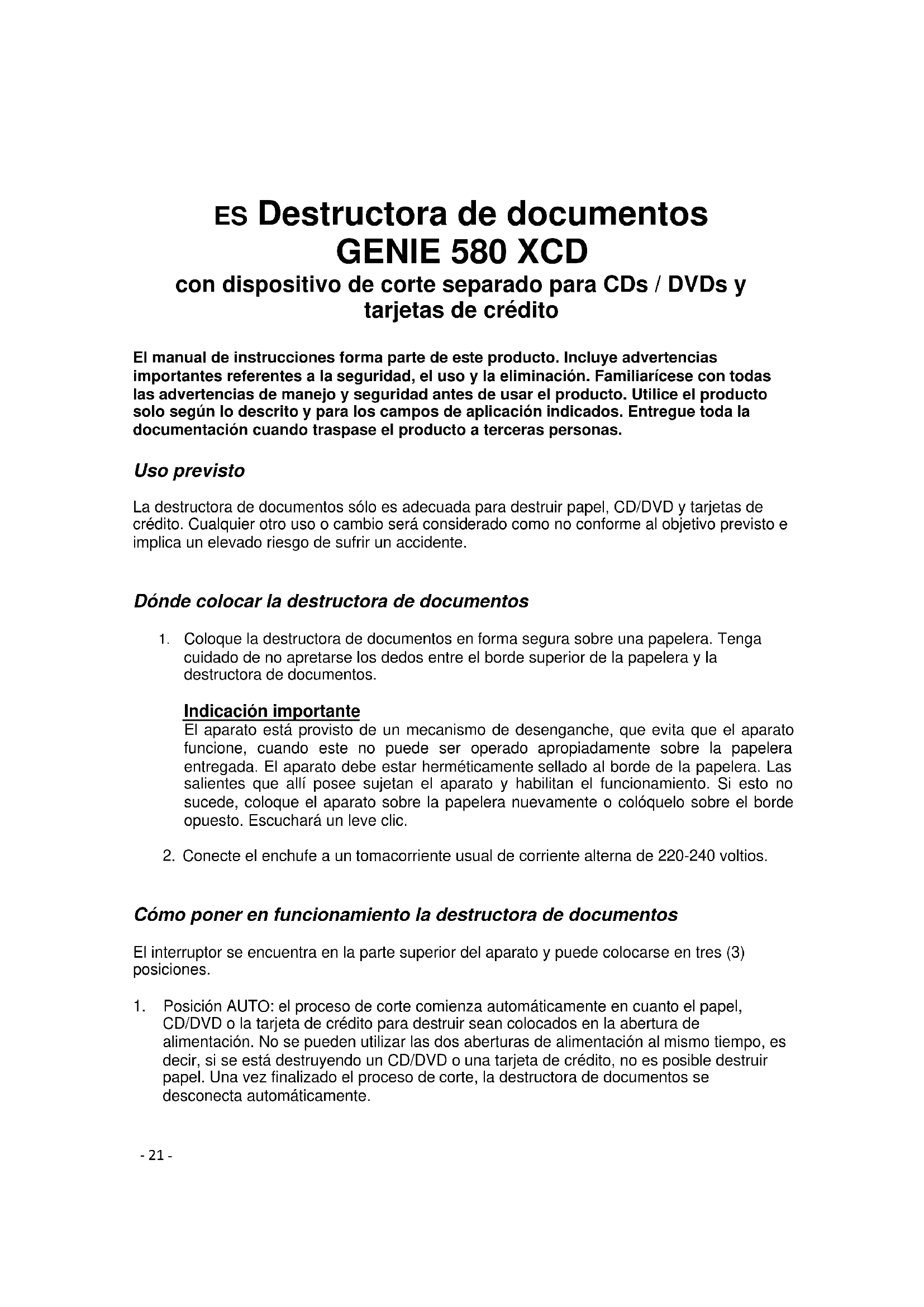 Fabricant GO Europe GmbH Zum Kraftwerk 1 D-45527 Hattingen Allemagne- 21 - ES Destructora de documentos GENIE 580 XCD con dispositivo de corte separado para CDs / DVDs y tarjetas de crédito El manual de instrucciones forma parte de este producto. Incluye advertencias importantes referentes a la seguridad, el uso y la eliminación. Familiarícese con todas las advertencias de manejo y seguridad antes de usar el producto. Utilice el producto solo según lo descrito y para los campos de aplicación indicados. Entregue toda la documentación cuando traspase el producto a terceras personas.