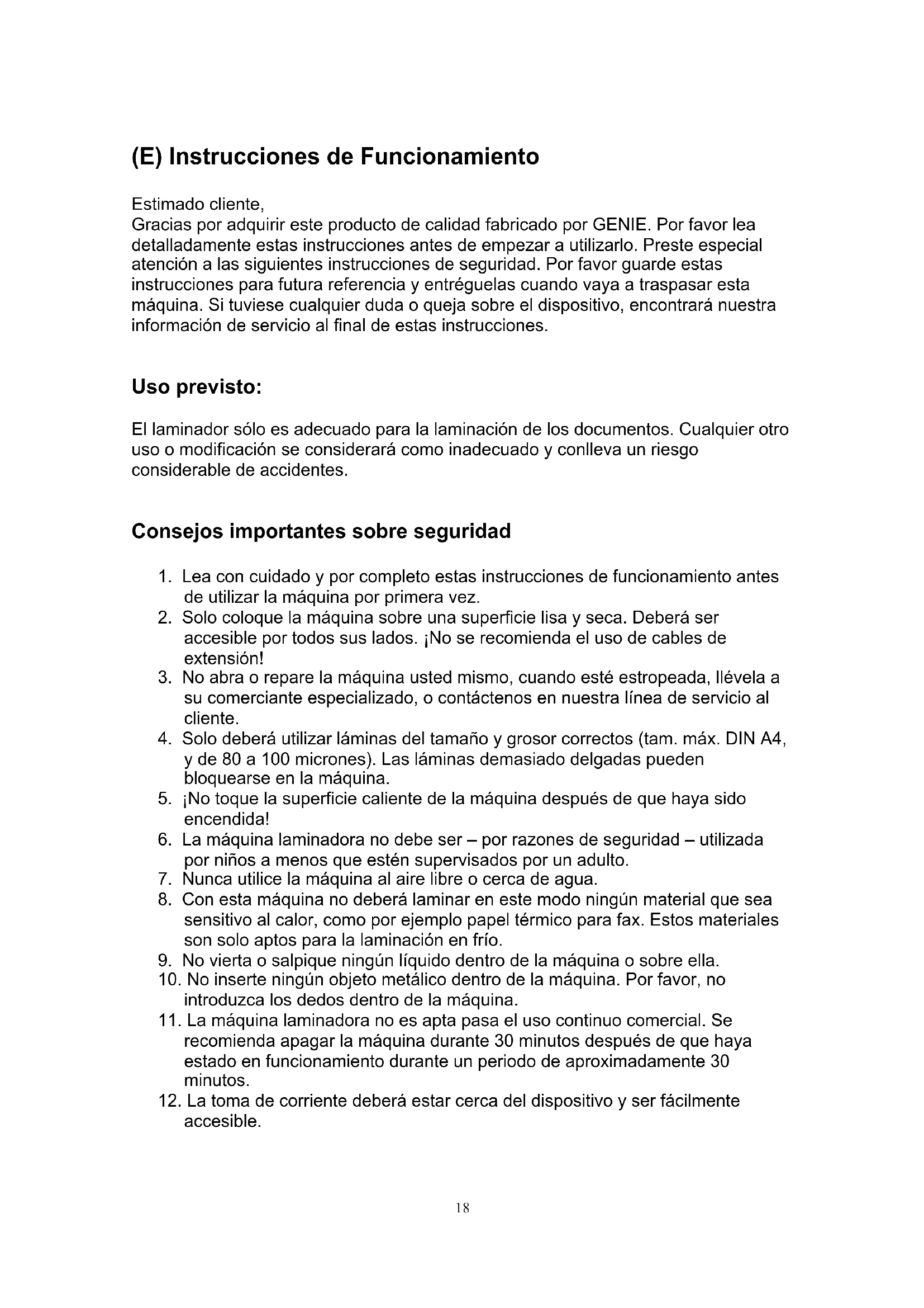 Importateur: GENIE GmbH & o. KG Berta-Cramer-Ring 22 65205 Wiesbaden, Germany18 (E) Instrucciones de Funcionamiento Estimado cliente, Gracias por adquirir este producto de calidad fabricado por GENIE. Por favor lea detalladamente estas instrucciones antes de empezar a utilizarlo. Preste especial atención a las siguientes instrucciones de seguridad. Por favor guarde estas instrucciones para futura referencia y entréguelas cuando vaya a traspasar esta máquina. Si tuviese cualquier duda o queja sobre el dispositivo, encontrará nuestra información de servicio al final de estas instrucciones.