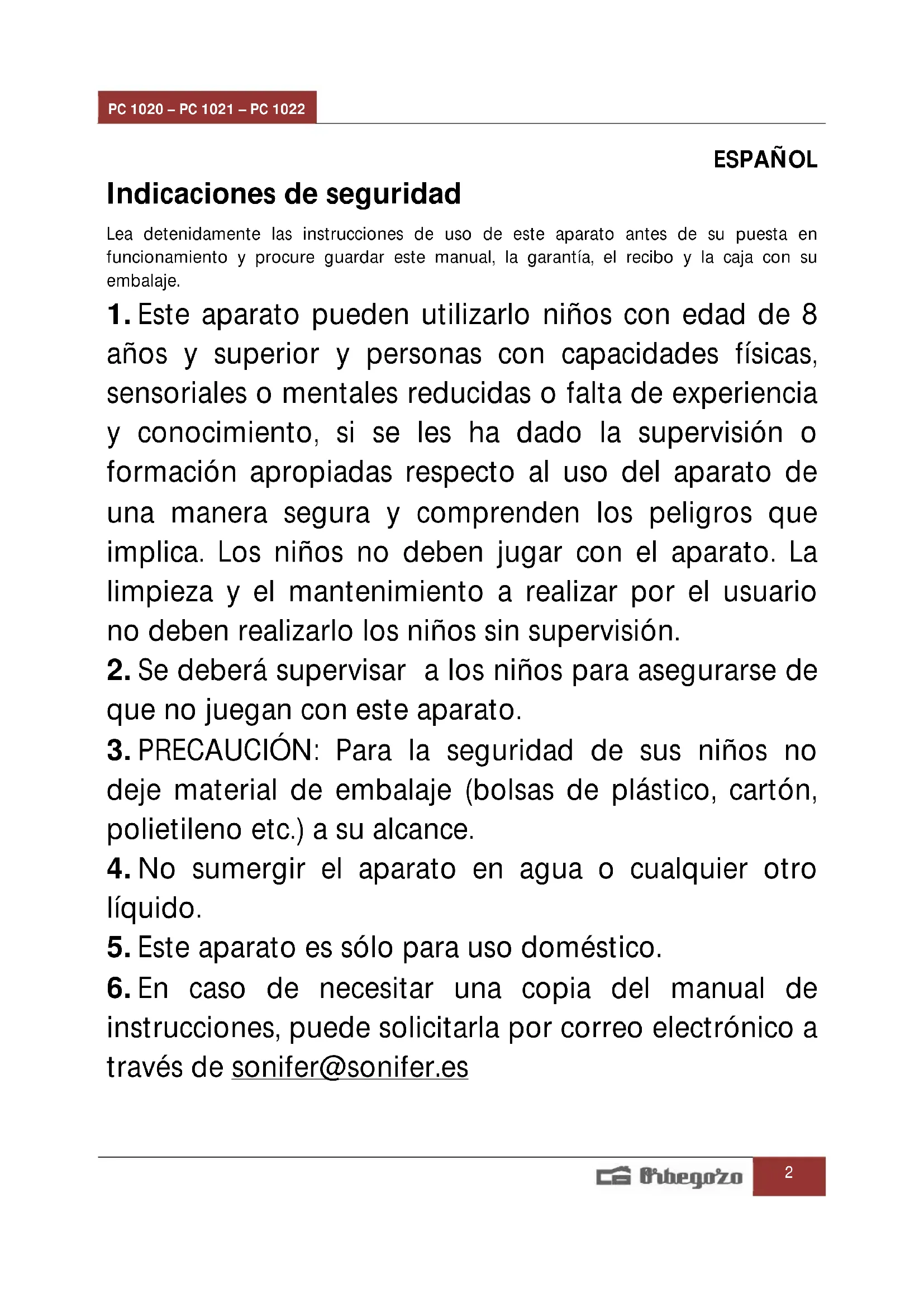 instrucciones, puede solicitarla por correo electrónico a través de sonifer@sonifer.esPC 1020 – PC 1021 – PC 1022