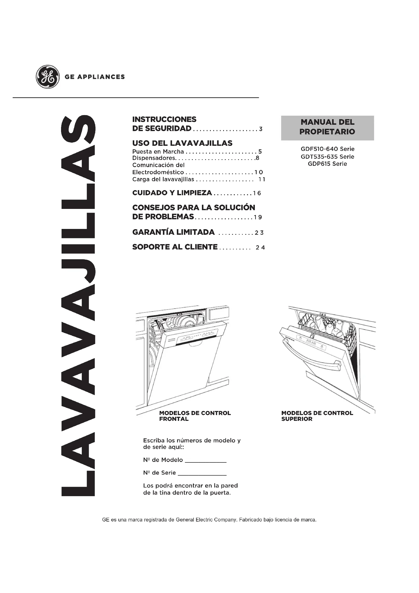 Esta lavadora se deberá instalar y ubicar de acuerdo con las Instrucciones de Instalación antes de ser usada. Si no recibió una ficha de Instrucciones de Instalación con su lavavajillas, podrá acceder a una visitando nuestro sitio web en GEAppliances.com.Ŷ &RQHFWHHOODYDYDMLOODVHOHFWURGRPpVWLFRDXQsistema de cableado de metal permanente con conexión a tierra o se debe tender un conducto para la conexión a tierra del equipo con los conductores del circuito y conectado al terminal de tierra del equipo o al conductor de suministro del electrodoméstico.Ŷ 8QDFRQH[LyQLQDSURSLDGDGHOFRQGXFWRUGHFRQH[LyQa tierra del equipo puede provocar riesgos de descargas eléctricas. Consulte a un electricista calificado o personal del servicio técnico si tiene dudas de que el electrodoméstico se encuentre conectado a tierra apropiadamente.Ŷ 'HVKiJDVHGHIRUPDFRUUHFWDGHHOHFWURGRPpVWLFRVy materiales de envío o embalajes descargados.Ŷ 1RLQWHQWHUHSDUDURUHHPSOD]DUQLQJXQDSDUWHde la cocina, a menos que se lo recomiende específicamente en este manual. Cualquier otra reparación deberá ser realizada por un técnico calificado.Ŷ 8VHVyORHONLWGHFDEOHV:;;RFDEOHVduros para la conexión eléctrica. Si no se siguen estas instrucciones, se pueden producir riesgos de incendio y lesiones personales.Ŷ $ILQGHPLQLPL]DUODSRVLELOLGDGGHGHVFDUJDVeléctricas, desconecte este electrodoméstico del suministro de corriente antes de intentar cualquier mantenimiento. NOTA: Apagar el lavavajillas no desconecta el electrodoméstico del suministro de corriente. Le recomendamos que el servicio técnico de su electrodoméstico sea realizado por un técnico calificado. ADVERTENCIA AL USAR SU LAVAVAJILLAS, SIGA LAS PRECAUCIONES BÁSICAS, INCLUYENDO LO SIGUIENTE: Ŷ 8VHHVWHHOHFWURGRPpVWLFRVyORSDUDVXSURSyVLWRoriginal, como se describe en el Manual del Propietario.Ŷ 8VHVyORGHWHUJHQWHVRDJHQWHVKXPHFWDQWHVrecomendados para use con un lavavajillas y mantenga los mismos fuera del alcance de los niños. El uso de un detergente que no esté diseñado específicamente para lavavajillas hará que este último se llene de agua con jabón.Ŷ 8ELTXHDUWtFXORVSXQWLDJXGRVGHPRGRTXHQRKD\Dposibilidades de daños sobre el sellador de la puertal.Ŷ &DUJXHORVFXFKLOORVSXQWLDJXGRVFRQORVPDQJRVhacia arriba, a fin de reducir el riesgo de lesiones por cortes.Ŷ 1RODYHSURGXFWRVGHSOiVWLFRDPHQRVTXHcontengan una marca de seguridad en lavavajillas o su equivalente. Cuando se trate de productos de plástico que no estén marcados de esta manera, consulte las recomendaciones del fabricante.Ŷ /DVLQVWUXFFLRQHVGHWDOODGDVGHFRQH[LyQDWLHUUDVHSXHGHQHQFRQWUDUHQODVHFFLyQ³35(3$5$&,Ï1'(/&$%/($'2(/e&75,&2´GHODV,QVWUXFFLRQHVde instalación.Ŷ 1RWRTXHHOHOHPHQWRGHFDOHIDFFLyQGXUDQWHRinmediatamente después del uso.Ŷ 1RXVHVXODYDYDMLOODVDPHQRVTXHWRGRVORVpaneles de cercamiento estén correctamente en sus lugares.Ŷ 1RPDQLSXOHLQGHELGDPHQWHORVFRQWUROHVŶ 1RDEXVHQRVHVLHQWHQRVHVRVWHQJDQLVHSDUHsobre la puerta o la bandeja del plato del lavavajillas.Ŷ $ILQGHUHGXFLUHOULHVJRGHLQFHQGLRVQRSHUPLWDque los niños jueguen con, sobre o dentro de este electrodoméstico en cualquier momento.Ŷ 1RJXDUGHQLXVHPDWHULDOHVFRPEXVWLEOHVincluyendo gasolina u otros líquidos o vapores inflamables cerca de éste o de otros electrodomésticos.Ŷ /DVSLH]DVSHTXHxDVWDOHVFRPRORVVXMHWDGRUHVGHestantes y los pivotes de retención de filtros, pueden generar riesgos de asfixia en niños pequeños si son retirados del lavavajillas. Mantenga los mismos fuera del alcance de los niños pequeños.4 49-55122-4