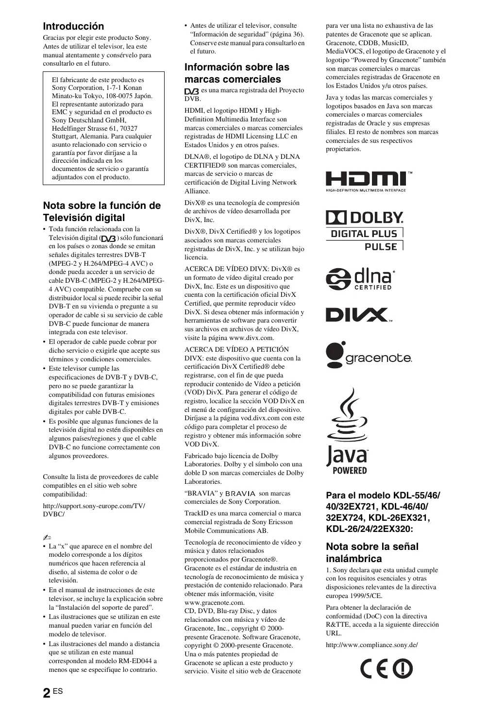 Gracias por elegir este producto Sony. Antes de utilizar el televisor, lea este manual atentamente y consérvelo para consultarlo en el futuro. El fabricante de este producto es Sony Corporation, 1-7-1 Konan Minato-ku Tokyo, 108-0075 Japón. El representante autorizado para EMC y seguridad en el producto es Sony Deutschland GmbH, Hedelfinger Strasse 61, 70327 Stuttgart, Alemania. Para cualquier asunto relacionado con servicio o garantía por favor diríjase a la dirección indicada en los documentos de servicio o garantía adjuntados con el producto.