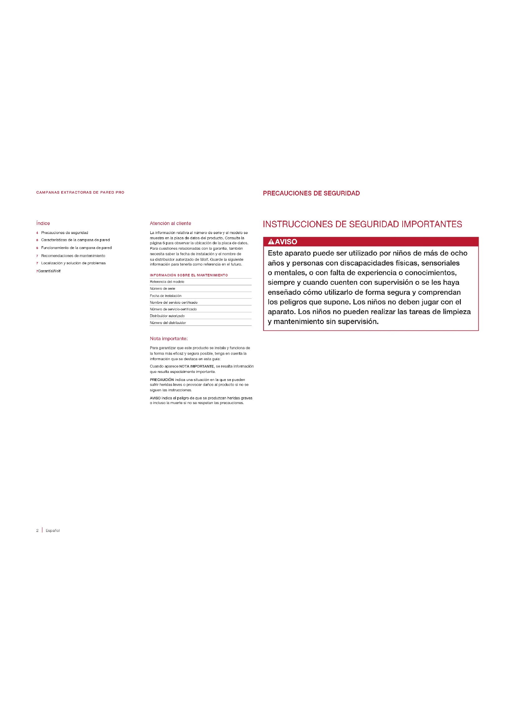 AVISO Este aparato puede ser utilizado por niños de más de ocho años y personas con discapacidades físicas, sensoriales o mentales, o con falta de experiencia o conocimientos, siempre y cuando cuenten con supervisión o se les haya enseñado cómo utilizarlo de forma segura y comprendan los peligros que supone. Los niños no deben jugar con el aparato. Los niños no pueden realizar las tareas de limpieza y mantenimiento sin supervisión. Índice 4 Precauciones de seguridad6 Características de la campana de pared6 Funcionamiento de la campana de pared7 Recomendaciones de mantenimiento7 Localización y solución de problemas7 Garantía WolfCAMPANAS EXTRACTORAS DE PARED PRO Atención al cliente La información relativa al número de serie y el modelo se muestra en la placa de datos del producto. Consulte la página 6 para observar la ubicación de la placa de datos. Para cuestiones relacionadas con la garantía, también necesita saber la fecha de instalación y el nombre de su distribuidor autorizado de Wolf. Guarde la siguiente información para tenerla como referencia en el futuro.INFORMACIÓN SOBRE EL MANTENIMIENTOReferencia del modeloNúmero de serieFecha de instalaciónNombre del servicio certicadoNúmero de servicio certicadoDistribuidor autorizadoNúmero del distribuidor Nota importante: Para garantizar que este producto se instala y funciona de la forma más ecaz y segura posible, tenga en cuenta la información que se destaca en esta guía:Cuando aparece NOTA IMPORTANTE, se resalta información que resulta especialmente importante. PRECAUCIÓN indica una situación en la que se pueden sufrir heridas leves o provocar daños al producto si no se siguen las instrucciones.AVISO indica el peligro de que se produzcan heridas graves o incluso la muerte si no se respetan las precauciones. PRECAUCIONES DE SEGURIDADwolfappliance.com