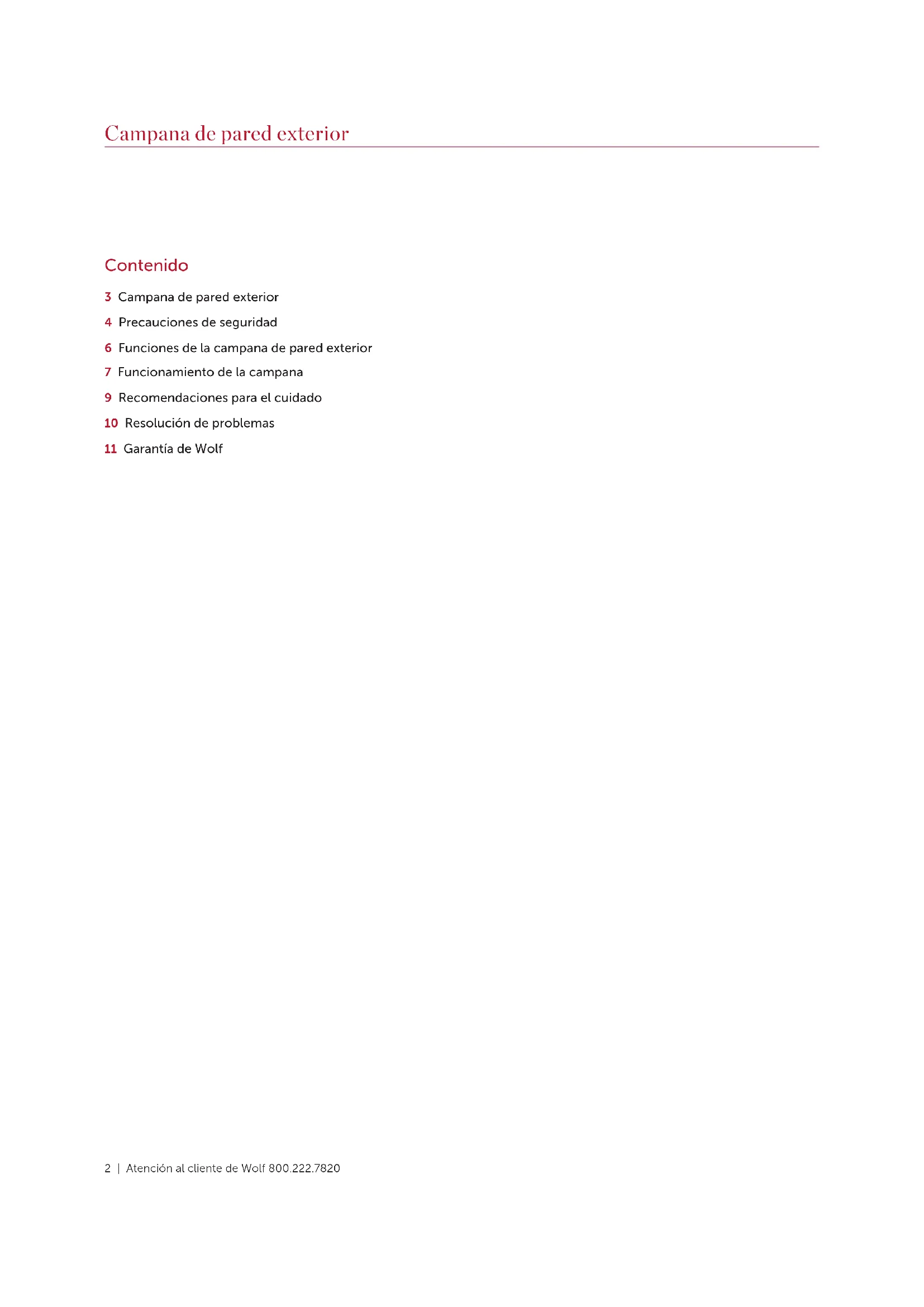 CALIFORNIA Cáncer y Daño Reproductivo— www.P65Warnings.ca.gov Precauciones de seguridad6 | Atención al cliente de Wolf 800.222.7820 Funciones de la campana de pared exterior Funciones de la campana de pared exterior FUNCIONES