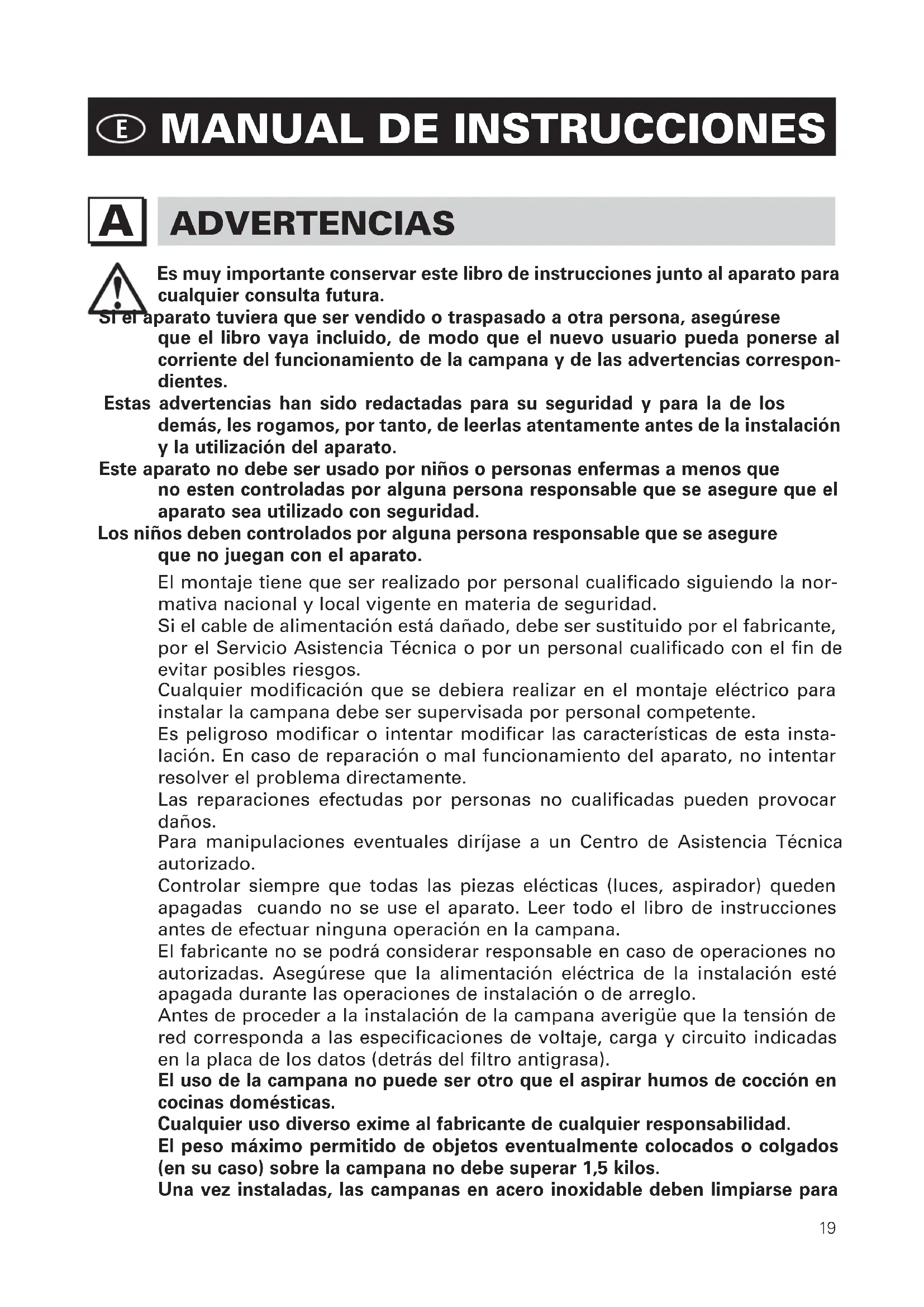 Es muy importante conservar este libro de instrucciones junto al aparato para cualquier consulta futura. Si el aparato tuviera que ser vendido o traspasado a otra persona, asegúrese que el libro vaya incluido, de modo que el nuevo usuario pueda ponerse al corriente del funcionamiento de la campana y de las advertencias correspon- dientes. Estas advertencias han sido redactadas para su seguridad y para la de los demás, les rogamos, por tanto, de leerlas atentamente antes de la instalación y la utilización del aparato. Este aparato no debe ser usado por niños o personas enfermas a menos que no esten controladas por alguna persona responsable que se asegure que el aparato sea utilizado con seguridad. Los niños deben controlados por alguna persona responsable que se asegure que no juegan con el aparato. El montaje tiene que ser realizado por personal cualificado siguiendo la nor- mativa nacional y local vigente en materia de seguridad. Si el cable de alimentación está dañado, debe ser sustituido por el fabricante, por el Servicio Asistencia Técnica o por un personal cualificado con el fin de evitar posibles riesgos. Cualquier modificación que se debiera realizar en el montaje eléctrico para instalar la campana debe ser supervisada por personal competente. Es peligroso modificar o intentar modificar las características de esta insta- lación. En caso de reparación o mal funcionamiento del aparato, no intentar resolver el problema directamente. Las reparaciones efectudas por personas no cualificadas pueden provocar daños. Para manipulaciones eventuales diríjase a un Centro de Asistencia Técnica autorizado. Controlar siempre que todas las piezas elécticas (luces, aspirador) queden apagadas cuando no se use el aparato. Leer todo el libro de instrucciones antes de efectuar ninguna operación en la campana. El fabricante no se podrá considerar responsable en caso de operaciones no autorizadas. Asegúrese que la alimentación eléctrica de la instalación esté apagada durante las operaciones de instalación o de arreglo. Antes de proceder a la instalación de la campana averigüe que la tensión de red corresponda a las especificaciones de voltaje, carga y circuito indicadas en la placa de los datos (detrás del filtro antigrasa). El uso de la campana no puede ser otro que el aspirar humos de cocción en cocinas domésticas. Cualquier uso diverso exime al fabricante de cualquier responsabilidad. El peso máximo permitido de objetos eventualmente colocados o colgados (en su caso) sobre la campana no debe superar 1,5 kilos. Una vez instaladas, las campanas en acero inoxidable deben limpiarse para20 eliminar los resíduos de plásticos protecto y eventuales manchas de grasa y aceite. Para esta operación aconsejamos la utilización de nuestro producto específico disponible a la venta. La utilización de otra tipologia de detergentes exime al fabricante de la re- sponsabilidad de los daños que se puedan derivar.