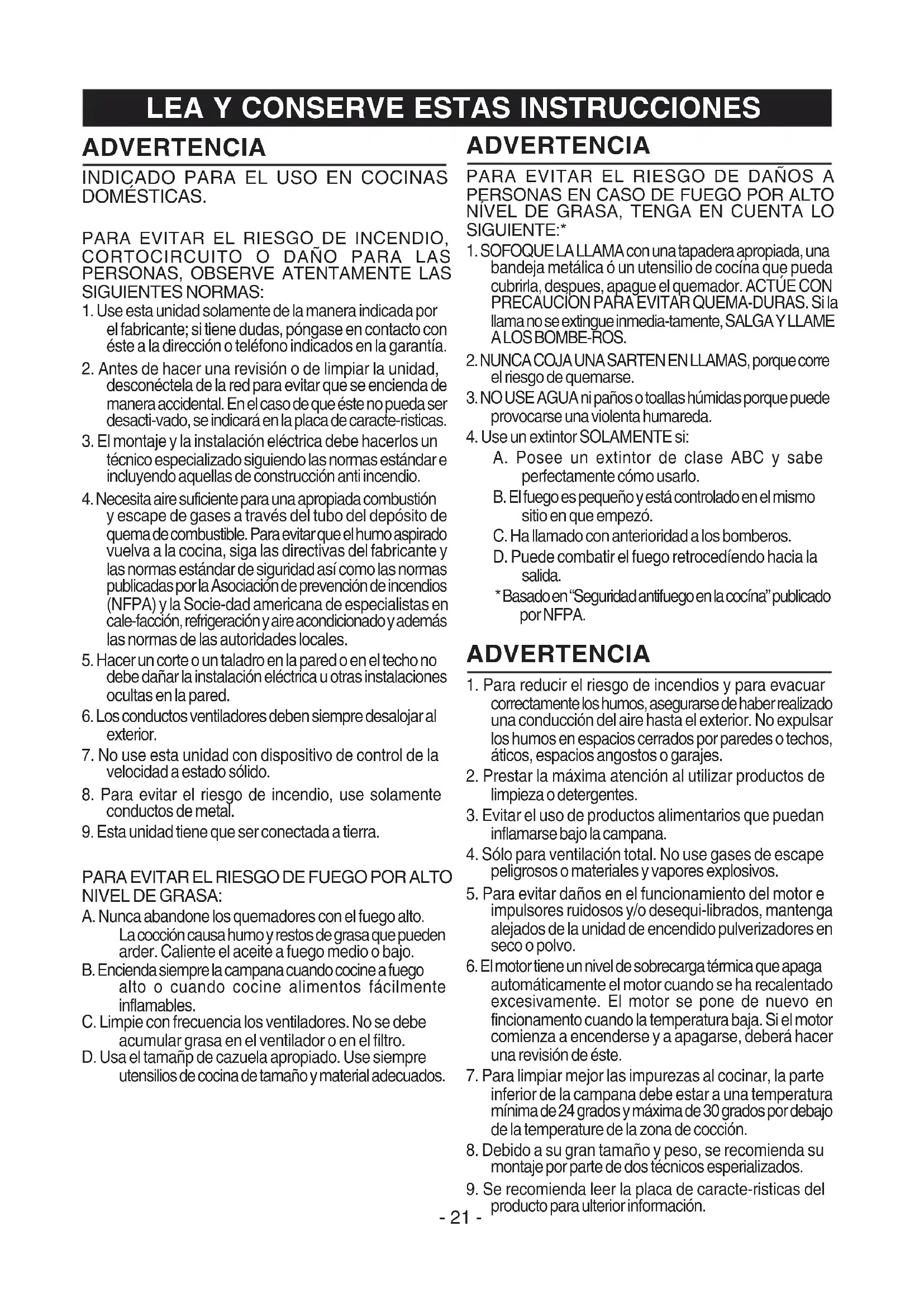 - Basado en “Seguridad antifuego en la cocína” publicado por NFPA. ADVERTENCIA
