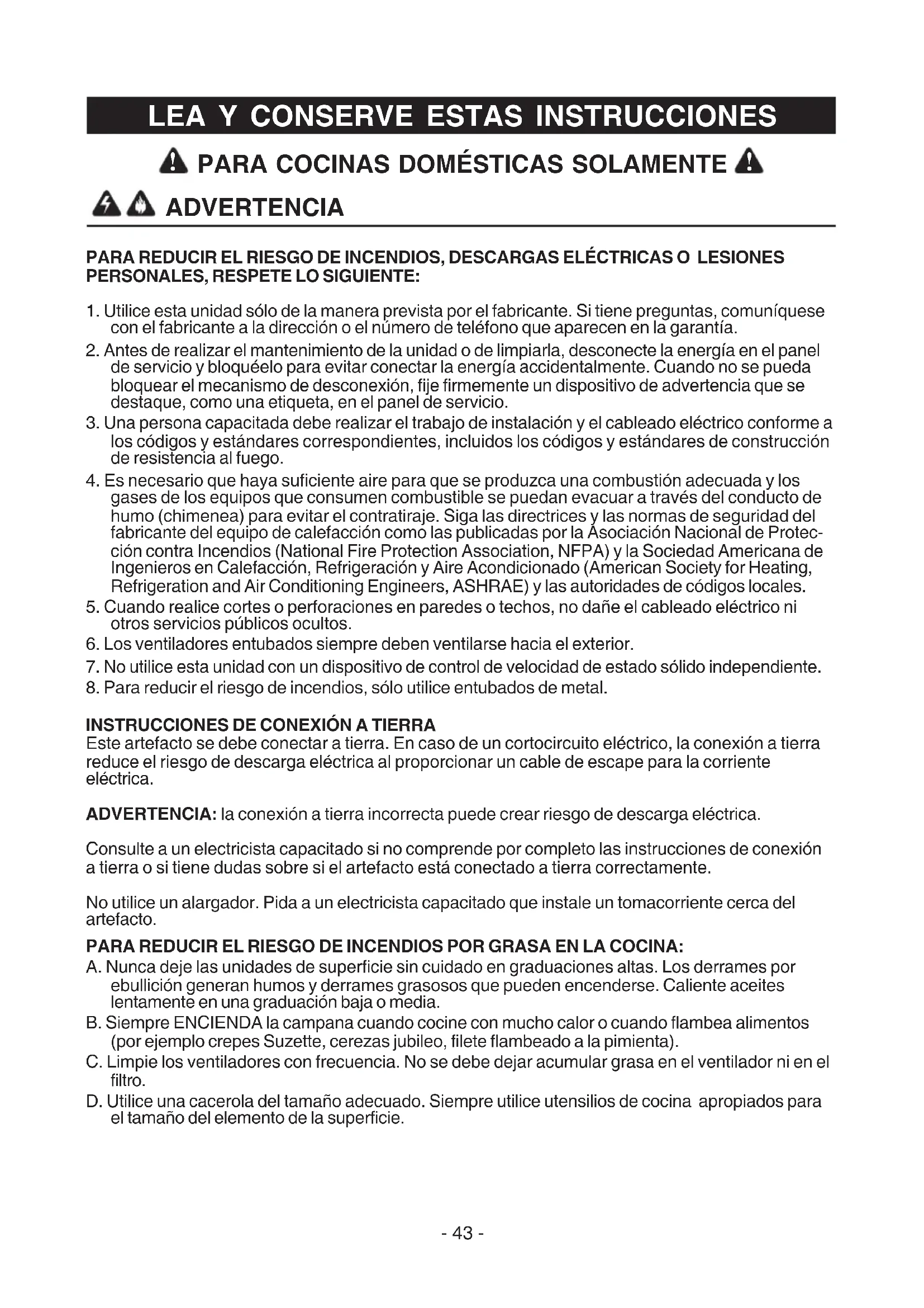 PARA REDUCIR EL RIESGO DE LESIONES PERSONALES EN CASO DE UN INCENDIO POR GRASA EN LA COCINA, RESPETE LO SIGUIENTE: