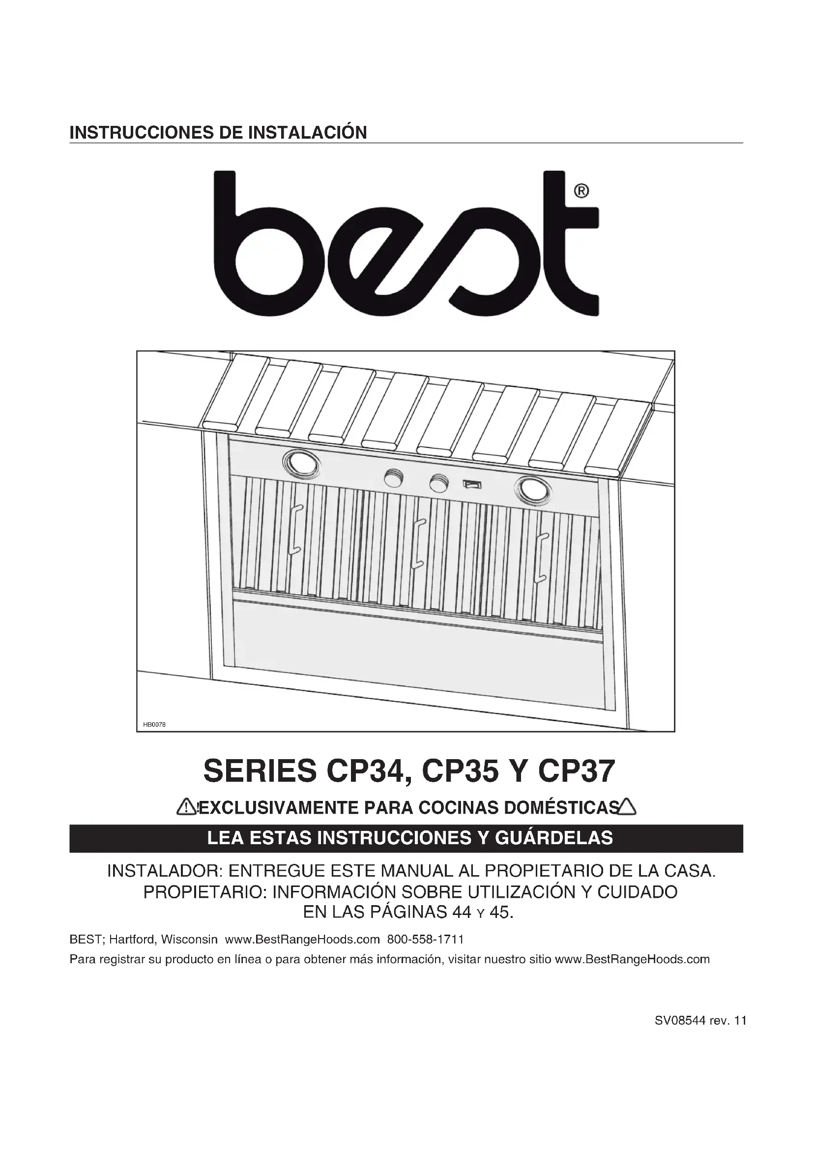 BEST; Hartford, Wisconsin www.BestRangeHoods.com 800-558-1711 Para registrar su producto en línea o para obtener más información, visitar nuestro sitio www.BestRangeHoods.com SV08544 rev. 11 ! !34 PARA REDUCIR EL RIESGO DE INCENDIO, DESCARGA ELÉCTRICA O LESIÓN CORPORAL, RESPETE LAS SIGUIENTES INDICACIONES: