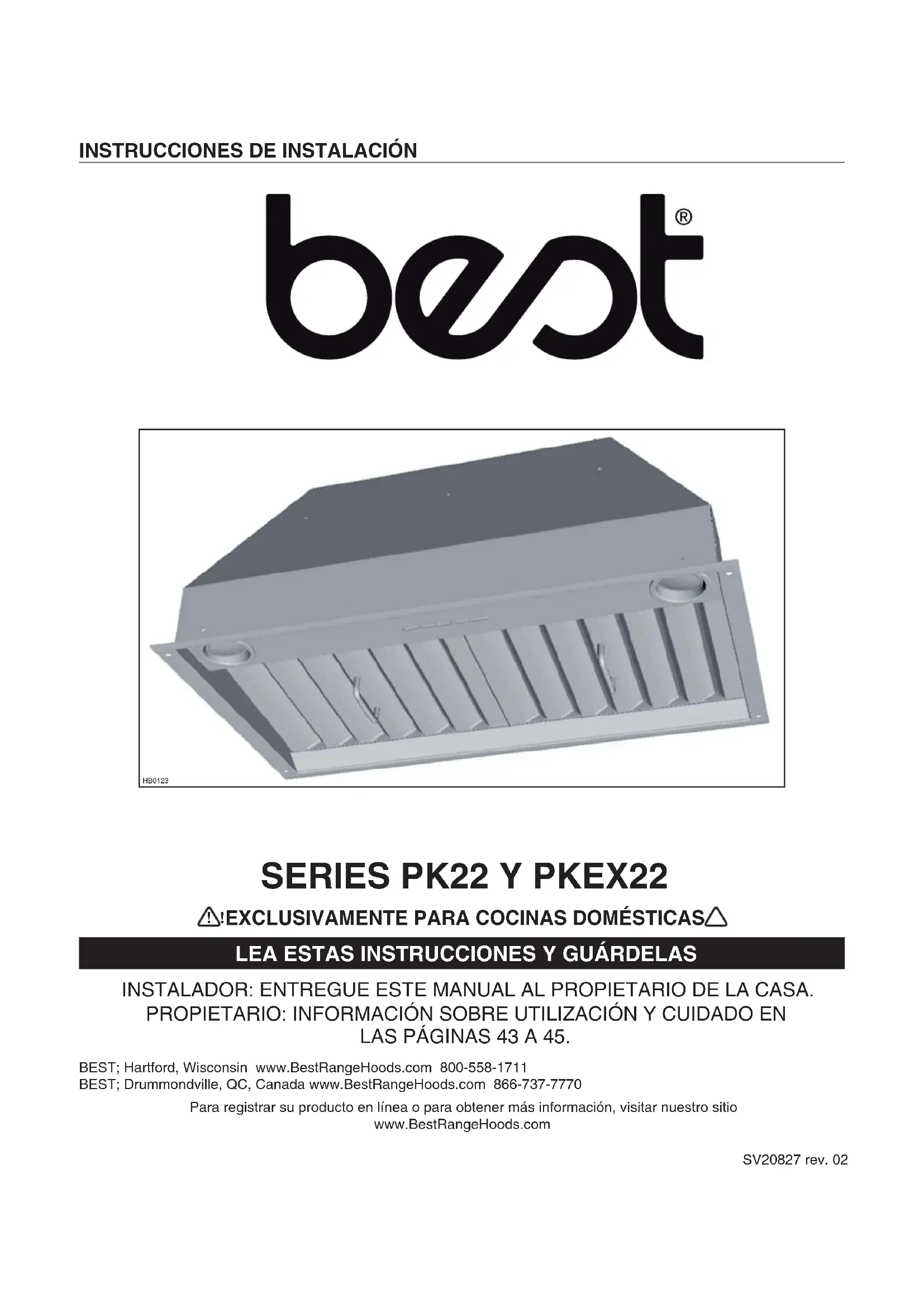 Para reducir el riesgo de incendio y deCHOque eletrico, los modelos de las series PK22 de Best deben instalarse unicamente con sus propios ventiladores incorporedos. Los modelos de la serie PKEX22 solo deben instalarse con los modelos de ventiladores externos EB6, EB9, EB12 o EB15 de Best, o con los modelos de ventiladores en linea ILB3, ILB6, ILB9 o ILB11 de Best. No empleethers ventiladores.