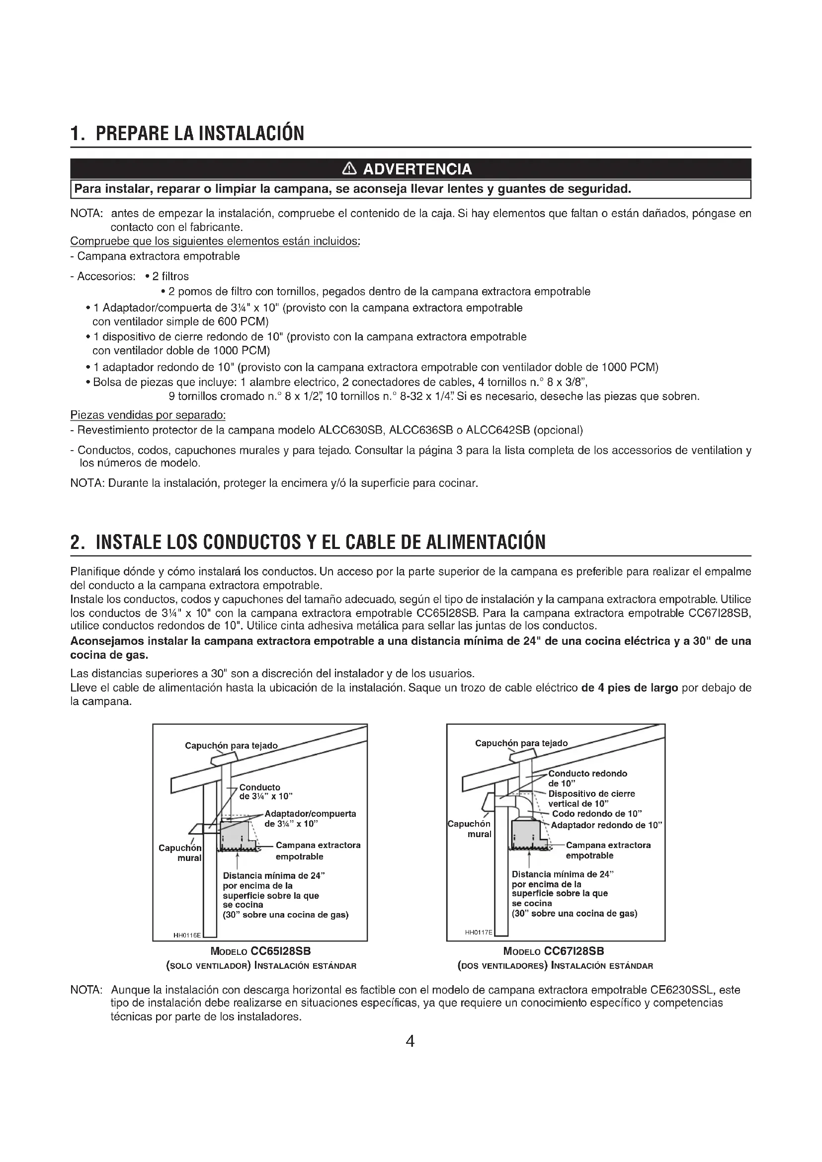 - Bolsa de piezas que incluye: 1 alambre electrico, 2 conectadores de cables, 4 tornillos n.° 8 x 3/8”, 9 tornillos cromado n.° 8 x 1/2”, 10 tornillos n.° 8-32 x 1/4”. Si es necesario, deseche las piezas que sobren. Piezas vendidas por separado: - Revestimiento protector de la campana modelo ALCC630SB, ALCC636SB o ALCC642SB (opcional) - Conductos, codos, capuchones murales y para tejado. Consultar la página 3 para la lista completa de los accessorios de ventilation y los números de modelo. NOTA: Durante la instalación, proteger la encimera y/ó la superficie para cocinar. NOTA: Aunque la instalación con descarga horizontal es factible con el modelo de campana extractora empotrable CE6230SSL, este tipo de instalación debe realizarse en situaciones específicas, ya que requiere un conocimiento específico y competencias técnicas por parte de los instaladores.