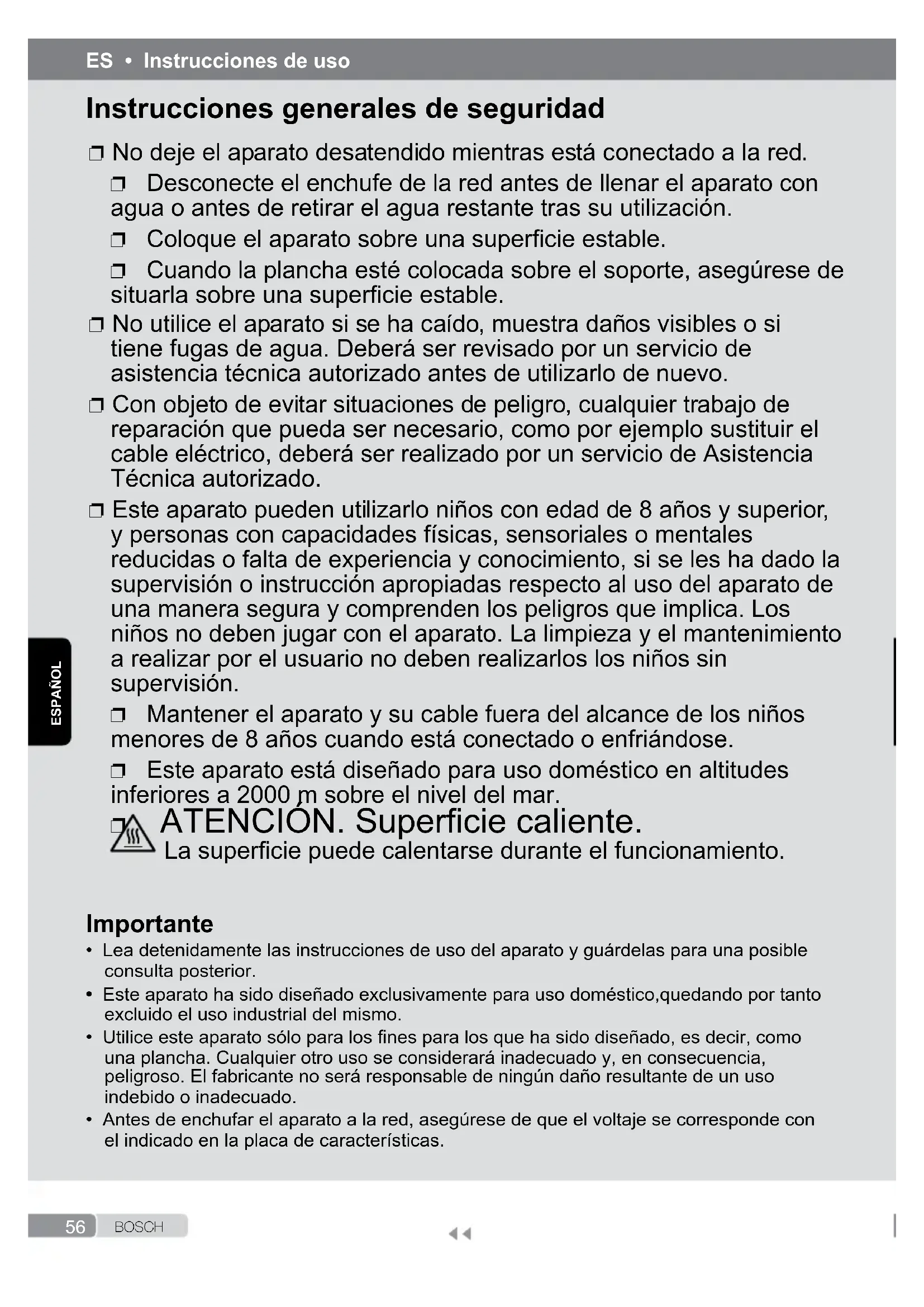 - Lea detenidamente las instrucciones de uso del aparato y guárdelas para una posible consulta posterior.• Este aparato ha sido diseñado exclusivamente para uso doméstico,quedando por tanto excluido el uso industrial del mismo.• Utilice este aparato sólo para los nes para los que ha sido diseñado, es decir, como una plancha. Cualquier otro uso se considerará inadecuado y, en consecuencia, peligroso. El fabricante no será responsable de ningún daño resultante de un uso indebido o inadecuado.• Antes de enchufar el aparato a la red, asegúrese de que el voltaje se corresponde con el indicado en la placa de características. Instrucciones generales de seguridad ❐ No deje el aparato desatendido mientras está conectado a la red. ❐ Desconecte el enchufe de la red antes de llenar el aparato con agua o antes de retirar el agua restante tras su utilización. ❐ Coloque el aparato sobre una supercie estable. ❐ Cuando la plancha esté colocada sobre el soporte, asegúrese de situarla sobre una supercie estable. ❐ No utilice el aparato si se ha caído, muestra daños visibles o si tiene fugas de agua. Deberá ser revisado por un servicio de asistencia técnica autorizado antes de utilizarlo de nuevo. ❐ Con objeto de evitar situaciones de peligro, cualquier trabajo de reparación que pueda ser necesario, como por ejemplo sustituir el cable eléctrico, deberá ser realizado por un servicio de Asistencia Técnica autorizado. ❐ Este aparato pueden utilizarlo niños con edad de 8 años y superior, y personas con capacidades físicas, sensoriales o mentales reducidas o falta de experiencia y conocimiento, si se les ha dado la supervisión o instrucción apropiadas respecto al uso del aparato de una manera segura y comprenden los peligros que implica. Los niños no deben jugar con el aparato. La limpieza y el mantenimiento a realizar por el usuario no deben realizarlos los niños sin supervisión. ❐ Mantener el aparato y su cable fuera del alcance de los niños menores de 8 años cuando está conectado o enfriándose. ❐ Este aparato está diseñado para uso doméstico en altitudes inferiores a 2000 m sobre el nivel del mar. ❐ ATENCIÓN. Supercie caliente. La supercie puede calentarse durante el funcionamiento.57 B O S C H ESPAÑOL *Según modelo