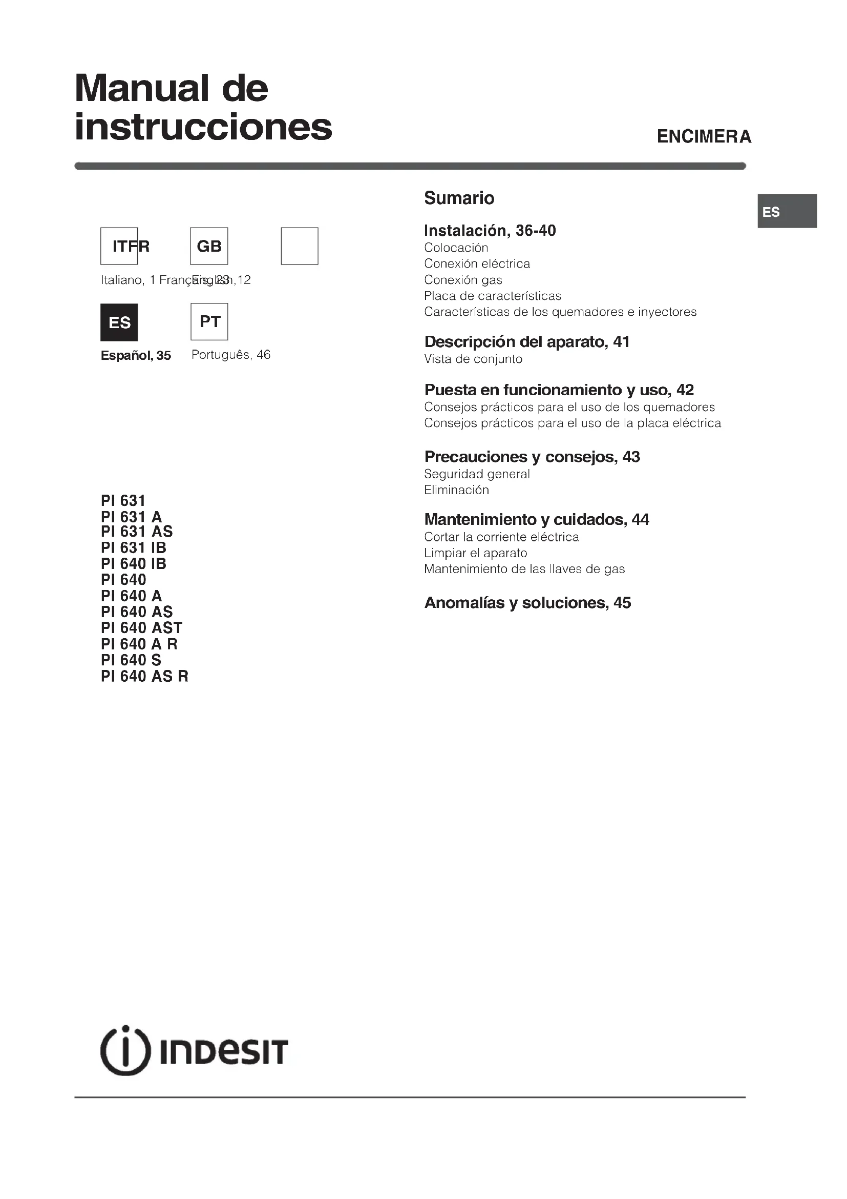 Encuentra gratis el manual del aparato PI 640 AS (AN) R INDESIT en formato PDF.