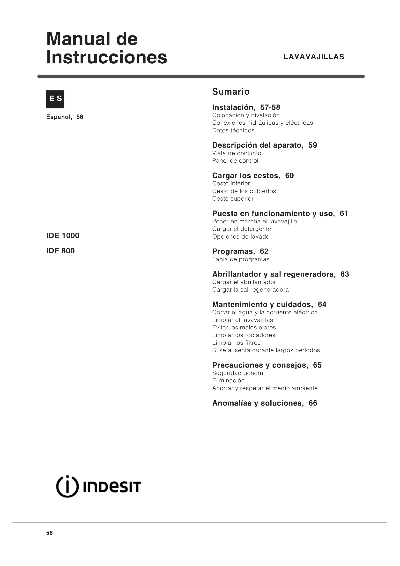 Encuentra gratis el manual del aparato IDE 1000 EU.2 INDESIT en formato PDF.