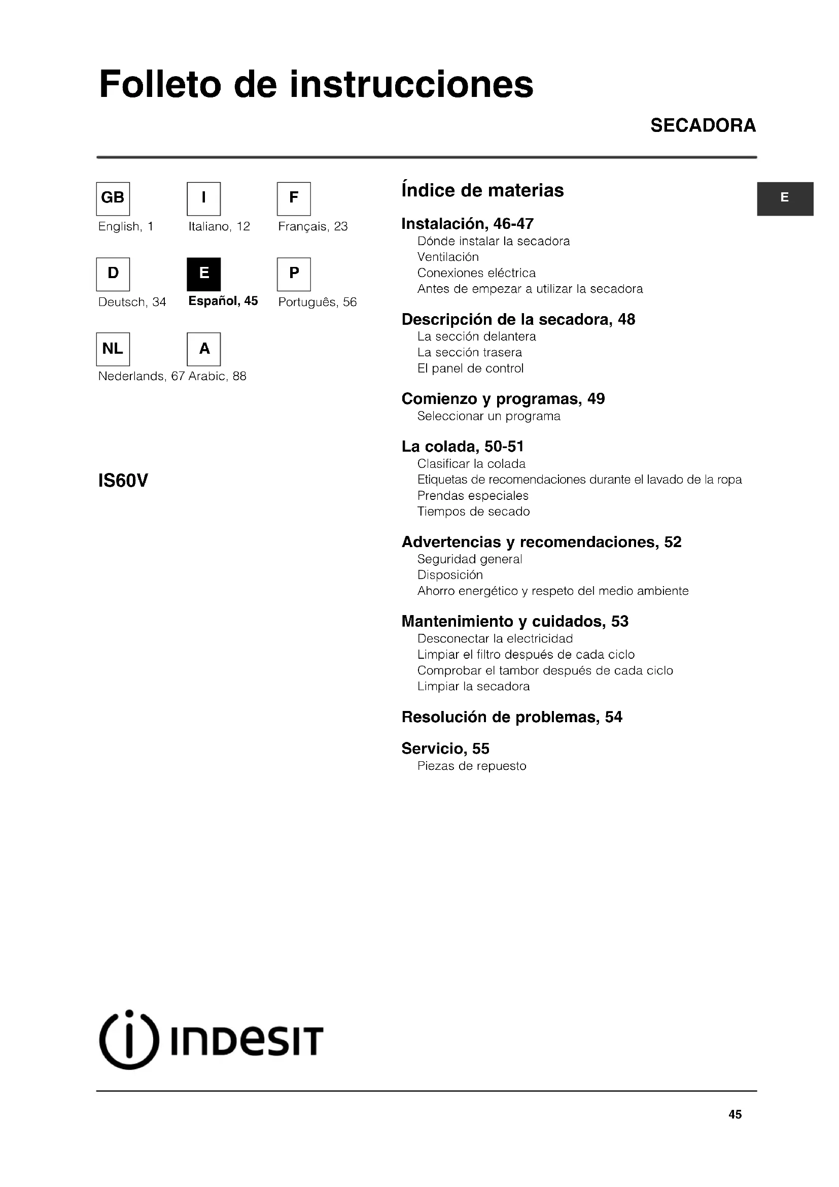 Seriennummer (S/N) Diese Informationen können Sie dem Typenschild an der Türinnenseite der Maschine entnehmen.Índice de materias SECADORA IS60V Folleto de instrucciones Instalación, 46-47 Dónde instalar la secadora Ventilación Conexiones eléctrica Antes de empezar a utilizar la secadora Descripción de la secadora, 48 La sección delantera La sección trasera El panel de control Comienzo y programas, 49 Seleccionar un programa La colada, 50-51 Clasificar la colada Etiquetas de recomendaciones durante el lavado de la ropa Prendas especiales Tiempos de secado Advertencias y recomendaciones, 52 Seguridad general Disposición Ahorro energético y respeto del medio ambiente Mantenimiento y cuidados, 53 Desconectar la electricidad Limpiar el filtro después de cada ciclo Comprobar el tambor después de cada ciclo Limpiar la secadora Resolución de problemas, 54 Servicio, 55 Piezas de repuesto