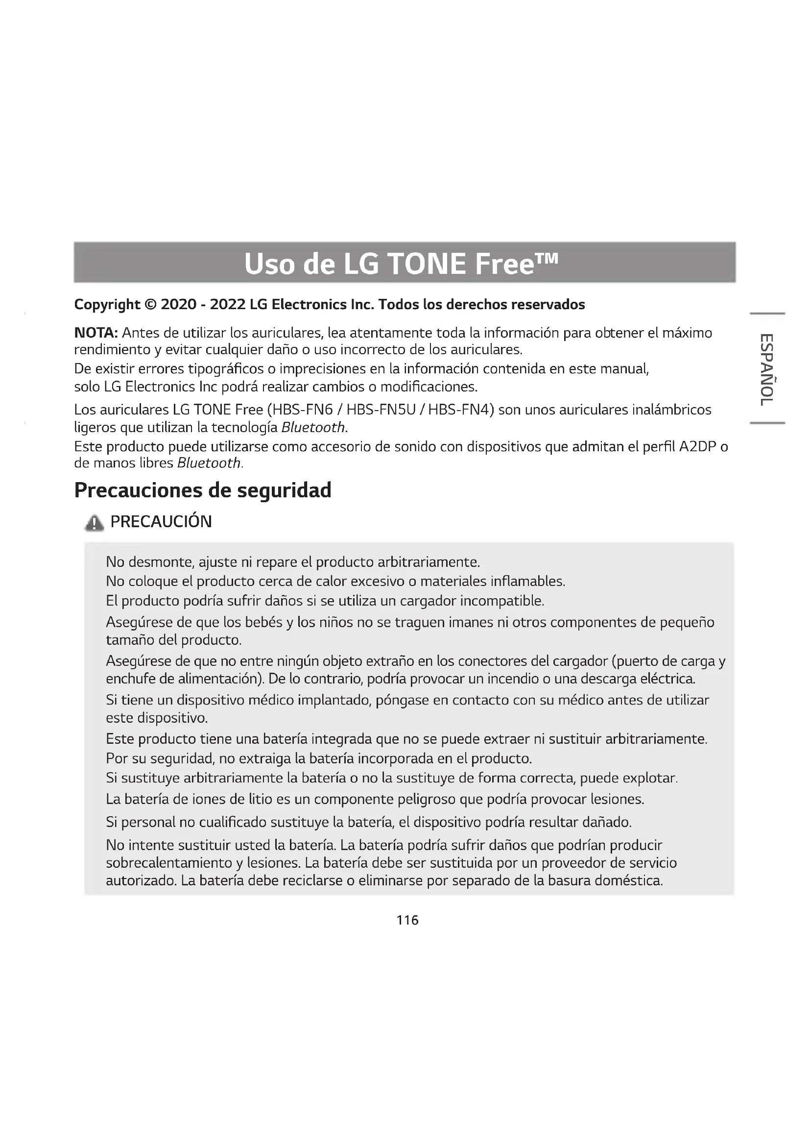 ESPAÑOL Copyright © 2020 - 2022 LG Electronics Inc. Todos los derechos reservados NOTA: Antes de utilizar los auriculares, lea atentamente toda la información para obtener el máximo rendimiento y evitar cualquier daño o uso incorrecto de los auriculares. De existir errores tipográcos o imprecisiones en la información contenida en este manual, solo LG Electronics Inc podrá realizar cambios o modicaciones. Los auriculares LG TONE Free (HBS-FN6 / HBS-FN5U / HBS-FN4) son unos auriculares inalámbricos ligeros que utilizan la tecnología Bluetooth. Este producto puede utilizarse como accesorio de sonido con dispositivos que admitan el perl A2DP o de manos libres Bluetooth. Precauciones de seguridad