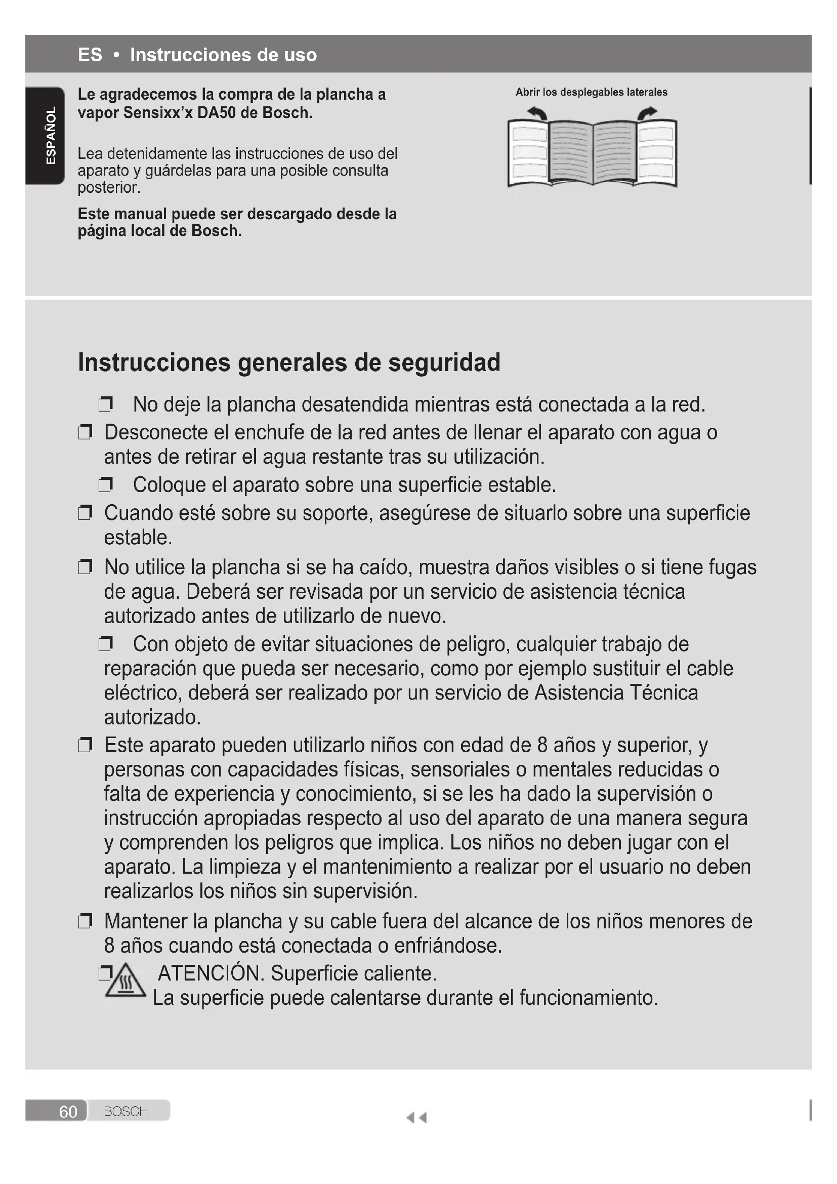 ATENCIÓN. Supercie caliente. La supercie puede calentarse durante el funcionamiento. Le agradecemos la compra de la plancha a vapor Sensixx’x DA50 de Bosch. Lea detenidamente las instrucciones de uso del aparato y guárdelas para una posible consulta posterior. Este manual puede ser descargado desde la página local de Bosch. Abrir los desplegables laterales61 B O S C H