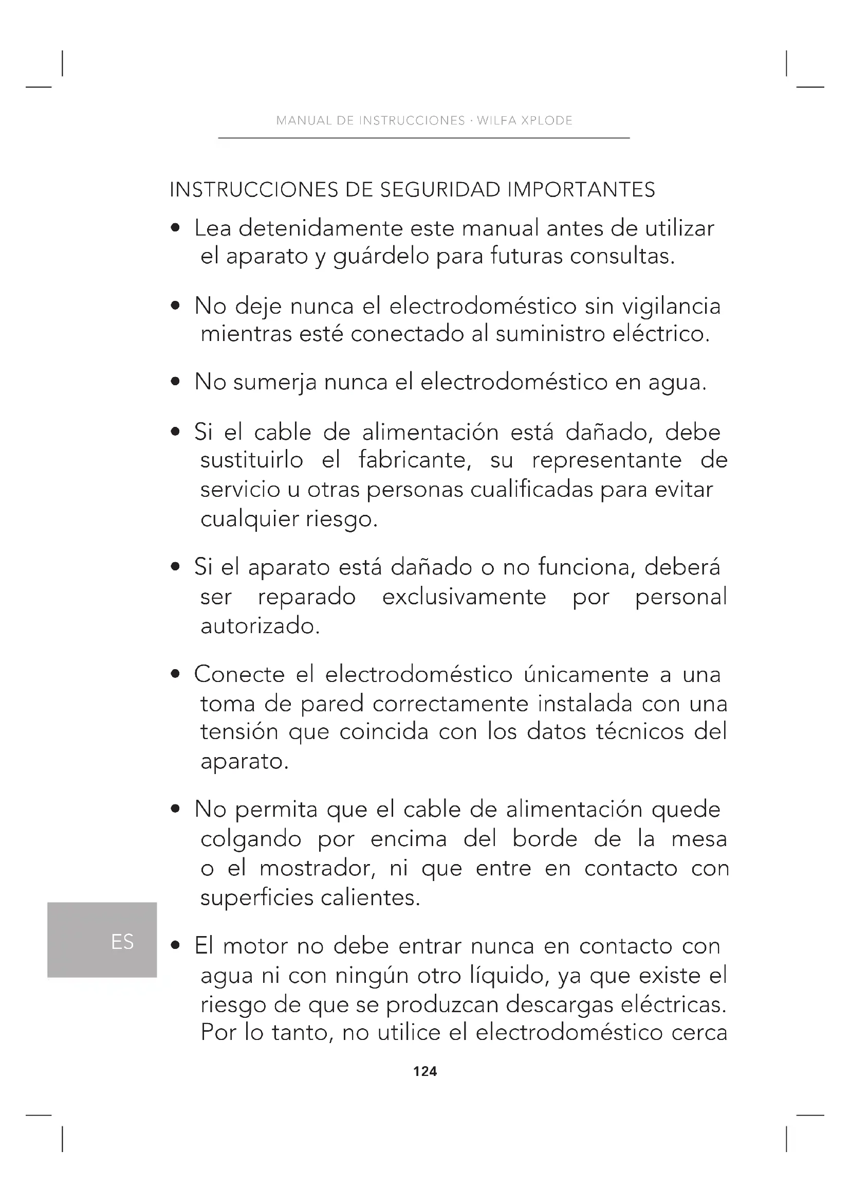 - El motor no debe entrar nunca en contacto con agua ni con ningún otro líquido, ya que existe el riesgo de que se produzcan descargas eléctricas. Por lo tanto, no utilice el electrodoméstico cerca125