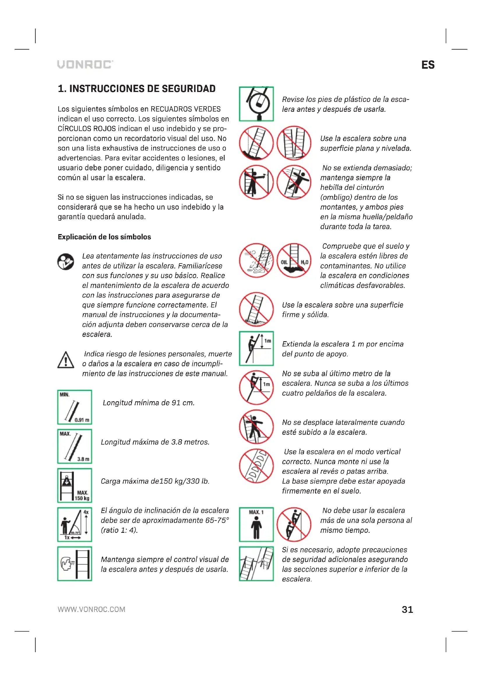 Los siguientes símbolos en RECUADROS VERDES indican el uso correcto. Los siguientes símbolos en CÍRCULOS ROJOS indican el uso indebido y se pro- porcionan como un recordatorio visual del uso. No son una lista exhaustiva de instrucciones de uso o advertencias. Para evitar accidentes o lesiones, el usuario debe poner cuidado, diligencia y sentido común al usar la escalera. Si no se siguen las instrucciones indicadas, se considerará que se ha hecho un uso indebido y la garantía quedará anulada. Explicación de los símbolos Lea atentamente las instrucciones de uso antes de utilizar la escalera. Familiarícese con sus funciones y su uso básico. Realice el mantenimiento de la escalera de acuerdo con las instrucciones para asegurarse de que siempre funcione correctamente. El manual de instrucciones y la documenta- ción adjunta deben conservarse cerca de la escalera. Indica riesgo de lesiones personales, muerte o daños a la escalera en caso de incumpli- miento de las instrucciones de este manual. Longitud mínima de 91 cm. Longitud máxima de 3.8 metros. Carga máxima de150 kg/330 lb. El ángulo de inclinación de la escalera debe ser de aproximadamente 65-75° (ratio 1: 4). Mantenga siempre el control visual de la escalera antes y después de usarla. Revise los pies de plástico de la esca- lera antes y después de usarla. Use la escalera sobre una superficie plana y nivelada. No se extienda demasiado; mantenga siempre la hebilla del cinturón (ombligo) dentro de los montantes, y ambos pies en la misma huella/peldaño durante toda la tarea. Compruebe que el suelo y la escalera estén libres de contaminantes. No utilice la escalera en condiciones climáticas desfavorables. Use la escalera sobre una superficie firme y sólida. Extienda la escalera 1 m por encima del punto de apoyo. No se suba al último metro de la escalera. Nunca se suba a los últimos cuatro peldaños de la escalera. No se desplace lateralmente cuando esté subido a la escalera. Use la escalera en el modo vertical correcto. Nunca monte ni use la escalera al revés o patas arriba. La base siempre debe estar apoyada firmemente en el suelo. No debe usar la escalera más de una sola persona al mismo tiempo. Si es necesario, adopte precauciones de seguridad adicionales asegurando las secciones superior e inferior de la escalera.32