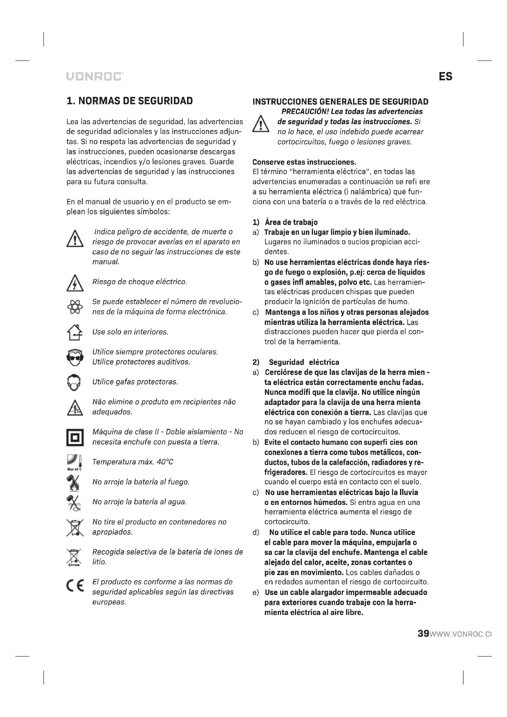 Cualquier aparato eléctrico o electrónico desechado y/o defectuoso tiene que depositarse en los lugares apropiados para ello. Sólo para países CE No deseche las herramientas eléctricas con los resi- duos domésticos. De conformidad con la Directiva Eu- ropea 2012/19/EU sobre residuos de aparatos eléctri- cos y electrónicos y su implementación en el derecho nacional, las herramientas eléctricas que dejen de funcionar deben recogerse por separado y desechar- se de forma respetuosa con el medio ambiente. GARANTÍA Los productos VONROC han sido desarrollados con los más altos estándares de calidad y VONROC garantiza que están exentos de defectos relacio- nados con los materiales y la fabricación durante el periodo legalmente estipulado, a contar desde la fecha de compra original. En caso de que el producto presente defectos relacionados con los materiales y/o la fabricación durante este periodo, póngase directamente en contacto con su distri- buidor VONROC.IT