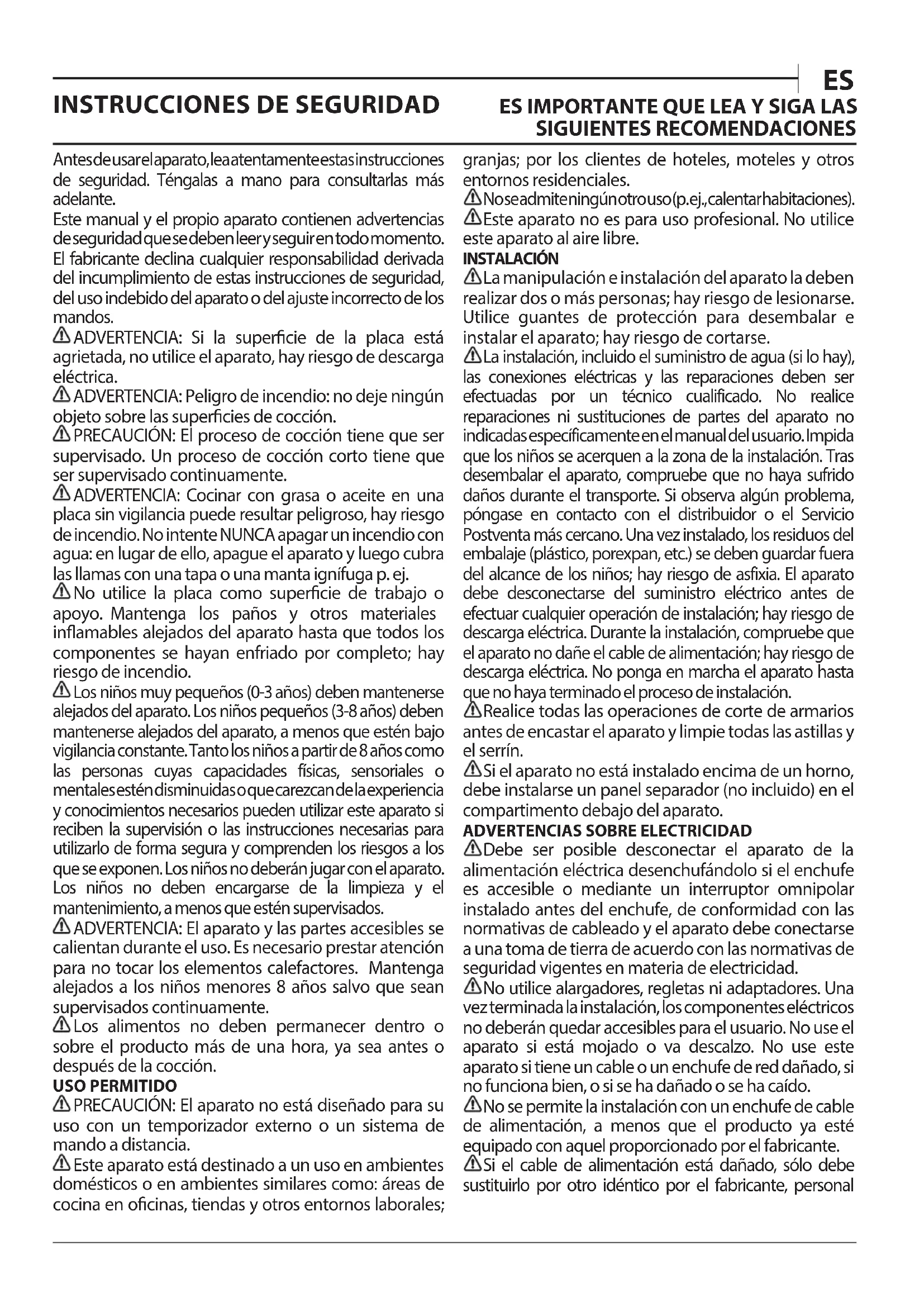 Manuale d'usoAntes de usar el aparato, lea atentamente estas instrucciones de seguridad. Téngalas a mano para consultarlas más adelante. Este manual y el propio aparato contienen advertencias de seguridad que se deben leer y seguir en todo momento. El fabricante declina cualquier responsabilidad derivada del incumplimiento de estas instrucciones de seguridad, del uso indebido del aparato o del ajuste incorrecto de los mandos. ADVERTENCIA: Si la supercie de la placa está agrietada, no utilice el aparato, hay riesgo de descarga eléctrica. ADVERTENCIA: Peligro de incendio: no deje ningún objeto sobre las supercies de cocción. PRECAUCIÓN: El proceso de cocción tiene que ser supervisado. Un proceso de cocción corto tiene que ser supervisado continuamente. ADVERTENCIA: Cocinar con grasa o aceite en una placa sin vigilancia puede resultar peligroso, hay riesgo de incendio. No intente NUNCA apagar un incendio con agua: en lugar de ello, apague el aparato y luego cubra las llamas con una tapa o una manta ignífuga p. ej. No utilice la placa como supercie de trabajo o apoyo. Mantenga los paños y otros materiales inamables alejados del aparato hasta que todos los componentes se hayan enfriado por completo; hay riesgo de incendio. Los niños muy pequeños (0-3años) deben mantenerse alejados del aparato. Los niños pequeños (3-8años) deben mantenerse alejados del aparato, a menos que estén bajo vigilancia constante. Tanto los niños a partir de 8 años como las personas cuyas capacidades físicas, sensoriales o mentales estén disminuidas o que carezcan de la experiencia y conocimientos necesarios pueden utilizar este aparato si reciben la supervisión o las instrucciones necesarias para utilizarlo de forma segura y comprenden los riesgos a los que se exponen. Los niños no deberán jugar con el aparato. Los niños no deben encargarse de la limpieza y el mantenimiento, a menos que estén supervisados. ADVERTENCIA: El aparato y las partes accesibles se calientan durante el uso. Es necesario prestar atención para no tocar los elementos calefactores. Mantenga alejados a los niños menores 8 años salvo que sean supervisados continuamente. Los alimentos no deben permanecer dentro o sobre el producto más de una hora, ya sea antes o después de la cocción. USO PERMITIDO PRECAUCIÓN: El aparato no está diseñado para su uso con un temporizador externo o un sistema de mando a distancia. Este aparato está destinado a un uso en ambientes domésticos o en ambientes similares como: áreas de cocina en ocinas, tiendas y otros entornos laborales; granjas; por los clientes de hoteles, moteles y otros entornos residenciales. No se admite ningún otro uso (p. ej., calentar habitaciones). Este aparato no es para uso profesional. No utilice este aparato al aire libre. INSTALACIÓN La manipulación e instalación del aparato la deben realizar dos o más personas; hay riesgo de lesionarse. Utilice guantes de protección para desembalar e instalar el aparato; hay riesgo de cortarse. La instalación, incluido el suministro de agua (si lo hay), las conexiones eléctricas y las reparaciones deben ser efectuadas por un técnico cualificado. No realice reparaciones ni sustituciones de partes del aparato no indicadas específicamente en el manual del usuario. Impida que los niños se acerquen a la zona de la instalación. Tras desembalar el aparato, compruebe que no haya sufrido daños durante el transporte. Si observa algún problema, póngase en contacto con el distribuidor o el Servicio Postventa más cercano. Una vez instalado, los residuos del embalaje (plástico, porexpan, etc.) se deben guardar fuera del alcance de los niños; hay riesgo de asfixia. El aparato debe desconectarse del suministro eléctrico antes de efectuar cualquier operación de instalación; hay riesgo de descarga eléctrica. Durante la instalación, compruebe que el aparato no dañe el cable de alimentación; hay riesgo de descarga eléctrica. No ponga en marcha el aparato hasta que no haya terminado el proceso de instalación. Realice todas las operaciones de corte de armarios antes de encastar el aparato y limpie todas las astillas y el serrín. Si el aparato no está instalado encima de un horno, debe instalarse un panel separador (no incluido) en el compartimento debajo del aparato.