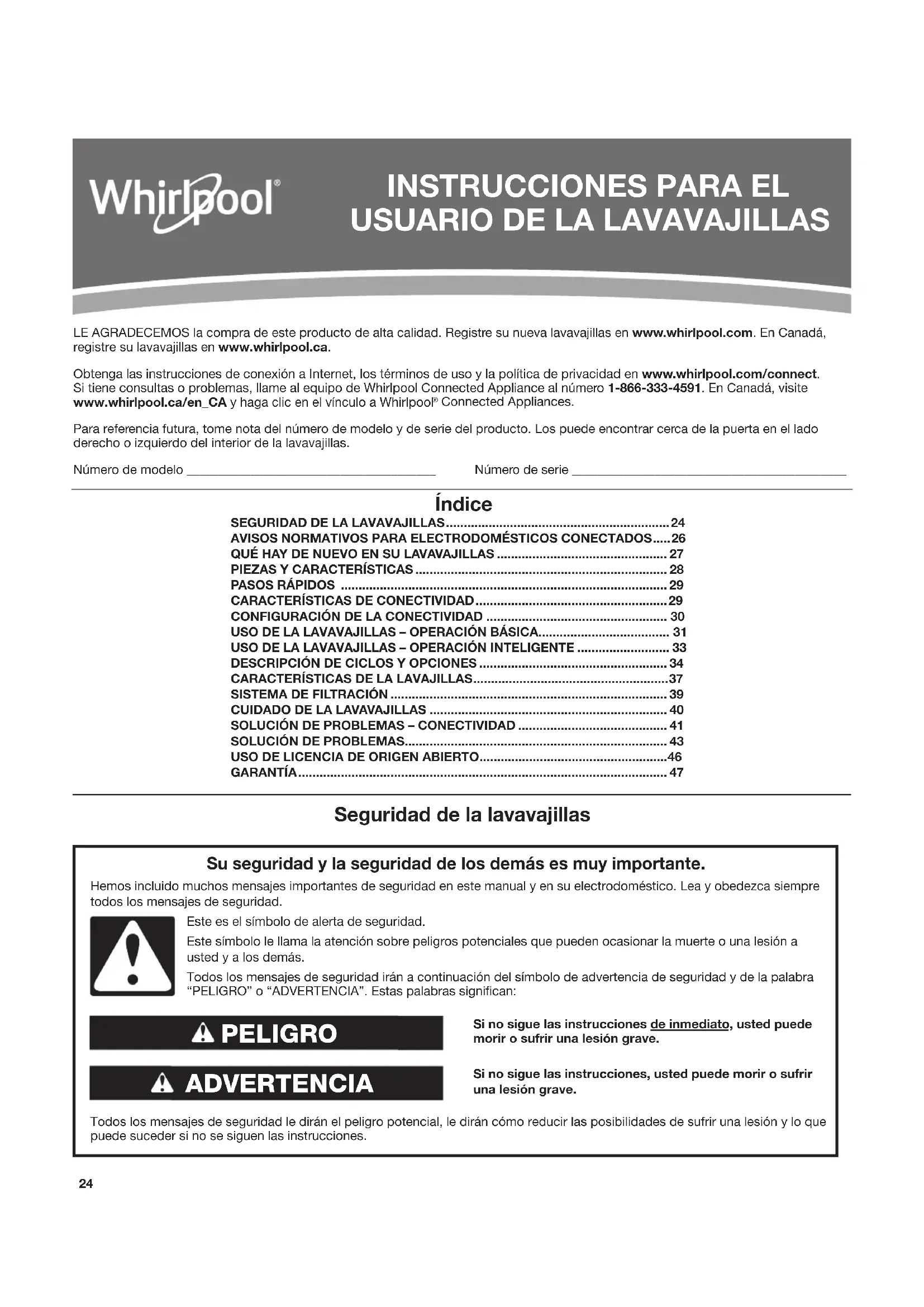 GARANTÍA ........................................................................................................ 47 LE AGRADECEMOS la compra de este producto de alta calidad. Registre su nueva lavavajillas en www.whirlpool.com. En Canadá, registre su lavavajillas en www.whirlpool.ca. Obtenga las instrucciones de conexión a Internet, los términos de uso y la política de privacidad en www.whirlpool.com/connect. Si tiene consultas o problemas, llame al equipo de Whirlpool Connected Appliance al número 1-866-333-4591. En Canadá, visite www.whirlpool.ca/en_CA y haga clic en el vínculo a Whirlpool