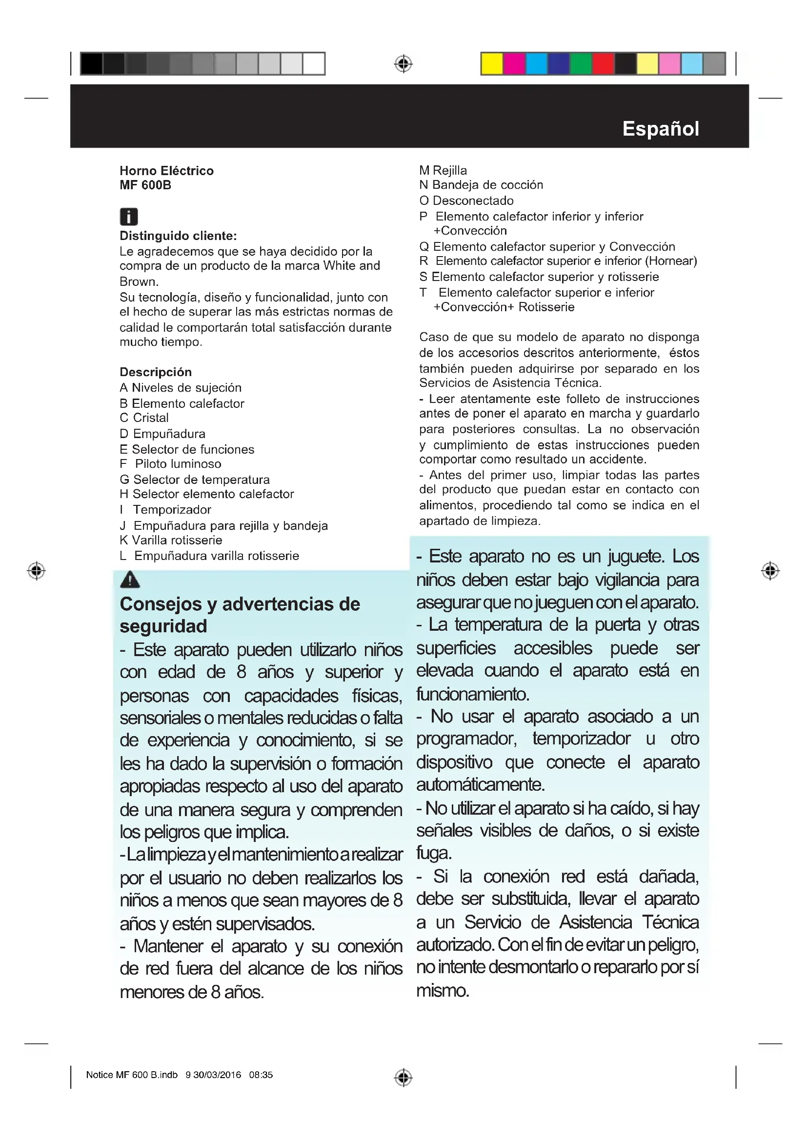 VIANDES - Un léger dégagement de fumée fait partie du processus qui permet de rôtir un aliment. - Cependant, on peut réduire les émissions de fumées en suivant les quelques conseils suivants : - Ne pas couvrir la grille avec du papier aluminium. Ceci provoque fumées et éclaboussures en empêchant les graisses de s’écouler. Cela nuit également à la bonne circulation de l’air dans le four et peut l’endommager. - Placer un récipient rempli d’eau dans le four. Ceci permet de réduire les émissions de fumées. - Pour de meilleurs résultats, décongeler la viande avant de la faire cuire. - Si la viande est très grasse, la débarrasser de ses excédants en la coupant si nécessaire. - Si des éclaboussures de graisse se produisent pendant la cuisson, réduire la température à l’aide du thermostat. - An d’éviter l’accumulation des graisses qui provoque irrémédiablement de désagréables fumées, veiller à nettoyer le four après chaque utilisation. - Utilisez une éponge non abrasive et de l’eau chaude. Lorsque vous avez ni de vous servir de l’appareil : - Arrêtez l´appareil en mettant le bouton sélecteur sur la position 0. - Débrancher l’appareil du secteur. - Nettoyer l’appareil Protecteur thermique de sécurité : - En cas de surchauffe, un dispositif de sécurité thermique se déclenchera et l’appareil s’arrêtera automatiquement. - Si l´appareil se déconnecte et ne se remet pas en marche dans ce cas vous devrez débrancher l´appareil du réseau électrique et attendre environ 15 minutes avant de le rebrancher. Si l´appareil ne fonctionne toujours pas il faudra contacter le service d´assistance technique. Nettoyage - Ce four est équipé de parois intérieures autonettoyantes, à partir de 200 °C lors de la cuisson les graisses sont détruites. - Par précaution il est conseillé tout de même, d’utiliser une éponge humide. - Débrancher l’appareil du secteur et attendre qu’il refroidisse avant toute opération de nettoyage - Retirer la grille et les accessoires - Pour nettoyer les parois extérieures, utiliser un chiffon humide. En cas de tâche résistante, employer une solution non abrasive ou du produit de nettoyage pour vitres. Rincer et essuyer avec un chiffon sec. Ne jamais employer de tampons métalliques qui pourraient abîmer la surface du four. - Les accessoires peuvent se nettoyer de façon classique comme tous les ustensiles de cuisine - Ne pas utiliser de solvants ni de produits à pH acide ou basique tels que l’eau de javel, ni de produits abrasifs pour nettoyer l’appareil. - Ne pas laisser pénétrer de l’eau ni aucun autre liquide par les ouvertures de ventilation an d’éviter d’endommager les parties intérieures de l’appareil. - Ne pas immerger l’appareil dans l’eau ou tout autre liquide, ni le passer sous un robinet. - Cet appareil a été conçu pour vous apporter un maximum de sécurité. Cependant, il est important de le maintenir parfaitement propre, débarrassé de toute graisse ou particules de nourriture - Si l’appareil n’est pas maintenu en bon état de propreté, sa surface peut se dégrader et affecter de façon inexorable la durée de vie de l’appareil et engendrer des situations de danger. - Essuyez toutes les pièces avant de les garder. Anomalies et réparation - En cas de panne, remettre l’appareil à un servi- ce d’assistance technique autorisé. Ne pas tenter de procéder aux réparations ou de démonter l’appareil ; cela implique des risques. Notice MF 600 B.indb 7 30/03/2016 08:35Français Écologie et recyclage du produit - Les matériaux dont l’emballage de cet appareil est constitué intègrent un programme de collecte, de classication et de recyclage. Si vous sou- haitez vous en défaire, veuillez utiliser les con- teneurs publics appropriés pour chaque type de matériel. - Le produit ne contient pas de concentrations de substances considérées comme étant nocives pour l’environnement. Ce symbole signie que si vous sou- haitez vous défaire du produit, une fois que celui-ci n’est plus utilisable, remettez-le, suivant la méthode ap- propriée, à un gestionnaire de dé- chets d’équipements électriques et électroniques (DEEE). Ce symbole indique que la surface peut se chauffer pendant l’usage. Cet appareil est certié conforme à la Directive 2014/35/EC de Basse Tension, de même qu’à la Directive 2014/30/EC en matière de Compatibili- té Électromagnétique, à la Directive 2011/65/EC relative à la limitation de l’utilisation de certaines substances dangereuses dans les équipements électriques et électroniques et à la Directive 2009/125/EC sur les conditions de conception écologique applicable aux produits en rapport avec l’énergie. Notice MF 600 B.indb 8 30/03/2016 08:35Español - Este aparato no es un juguete. Los niños deben estar bajo vigilancia para asegurar que no jueguen con el aparato. - La temperatura de la puerta y otras superficies accesibles puede ser elevada cuando el aparato está en funcionamiento. - No usar el aparato asociado a un programador, temporizador u otro dispositivo que conecte el aparato automáticamente. - No utilizar el aparato si ha caído, si hay señales visibles de daños, o si existe fuga. - Si la conexión red está dañada, debe ser substituida, llevar el aparato a un Servicio de Asistencia Técnica autorizado. Con el fin de evitar un peligro, no intente desmontarlo o repararlo por sí mismo. Horno Eléctrico MF 600B Distinguido cliente: Le agradecemos que se haya decidido por la compra de un producto de la marca White and Brown. Su tecnología, diseño y funcionalidad, junto con el hecho de superar las más estrictas normas de calidad le comportarán total satisfacción durante mucho tiempo. Descripción A Niveles de sujeción B Elemento calefactor C Cristal D Empuñadura E Selector de funciones F Piloto luminoso G Selector de temperatura H Selector elemento calefactor I Temporizador J Emp