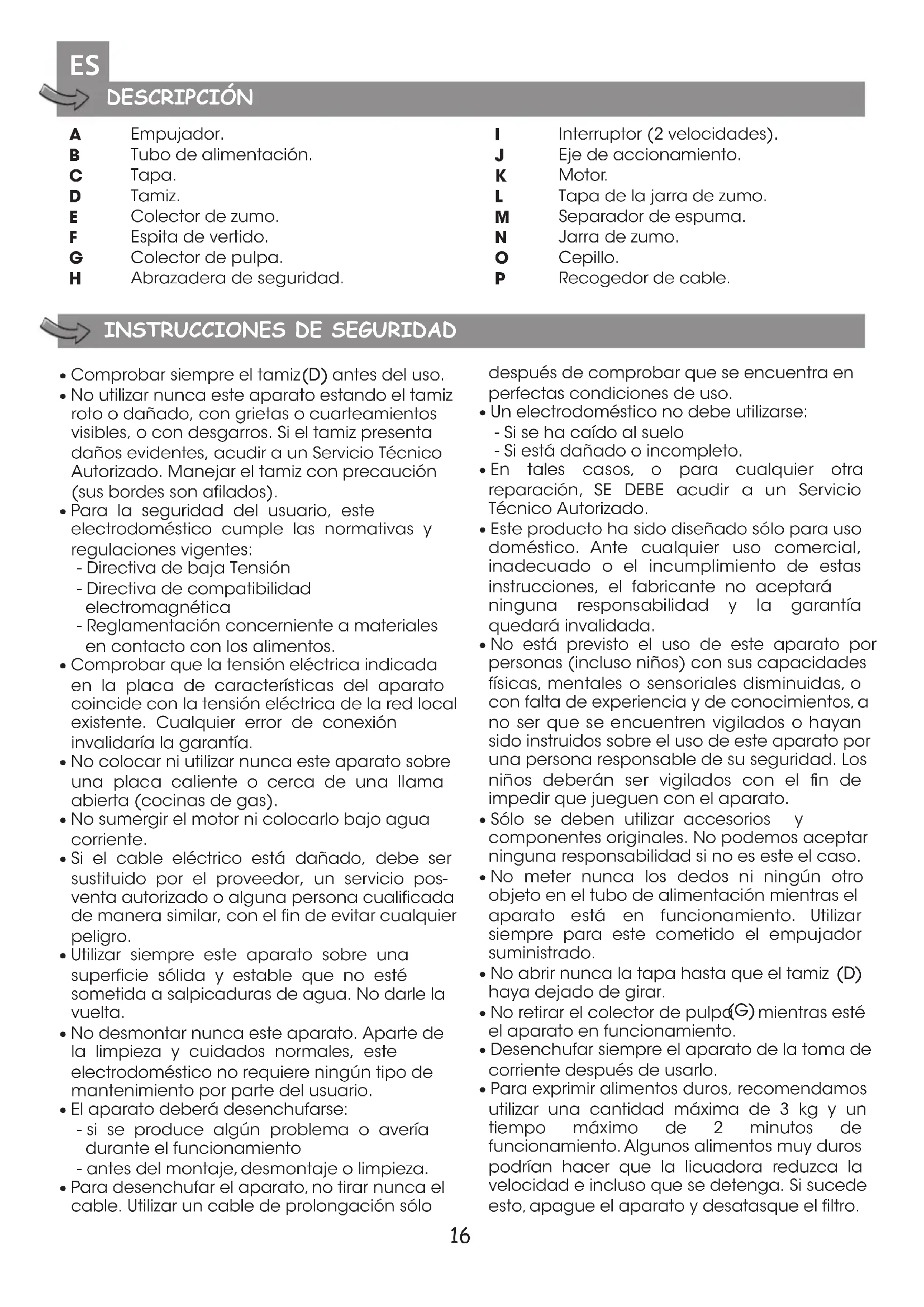 - No meter nunca los dedos ni ningún otro objeto en el tubo de alimentación mientras el aparato está en funcionamiento. Utilizar siempre para este cometido el empujador suministrado.