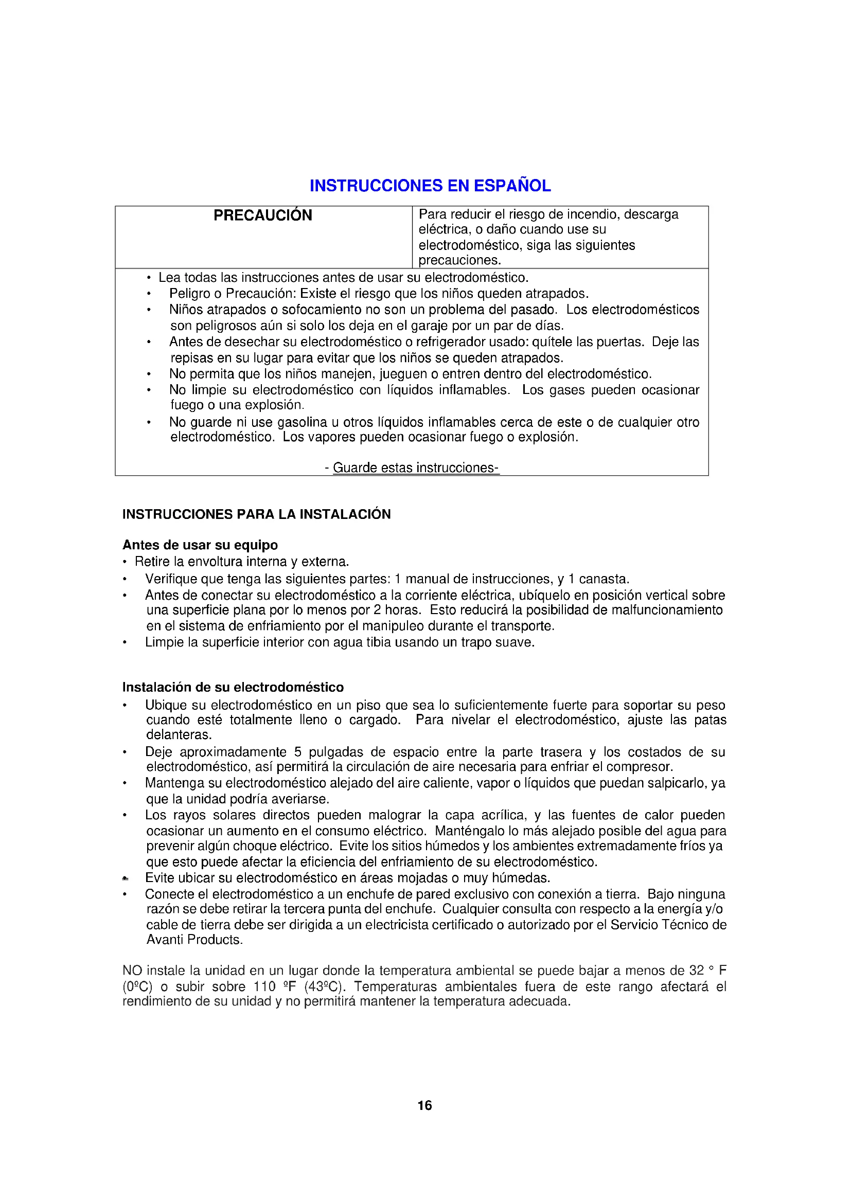 - Conecte el electrodoméstico a un enchufe de pared exclusivo con conexión a tierra. Bajo ninguna razón se debe retirar la tercera punta del enchufe. Cualquier consulta con respecto a la energía y/o cable de tierra debe ser dirigida a un electricista certificado o autorizado por el Servicio Técnico de Avanti Products. NO instale la unidad en un lugar donde la temperatura ambiental se puede bajar a menos de 32 ° F (0ºC) o subir sobre 110 ºF (43ºC). Temperaturas ambientales fuera de este rango afectará el rendimiento de su unidad y no permitirá mantener la temperatura adecuada.