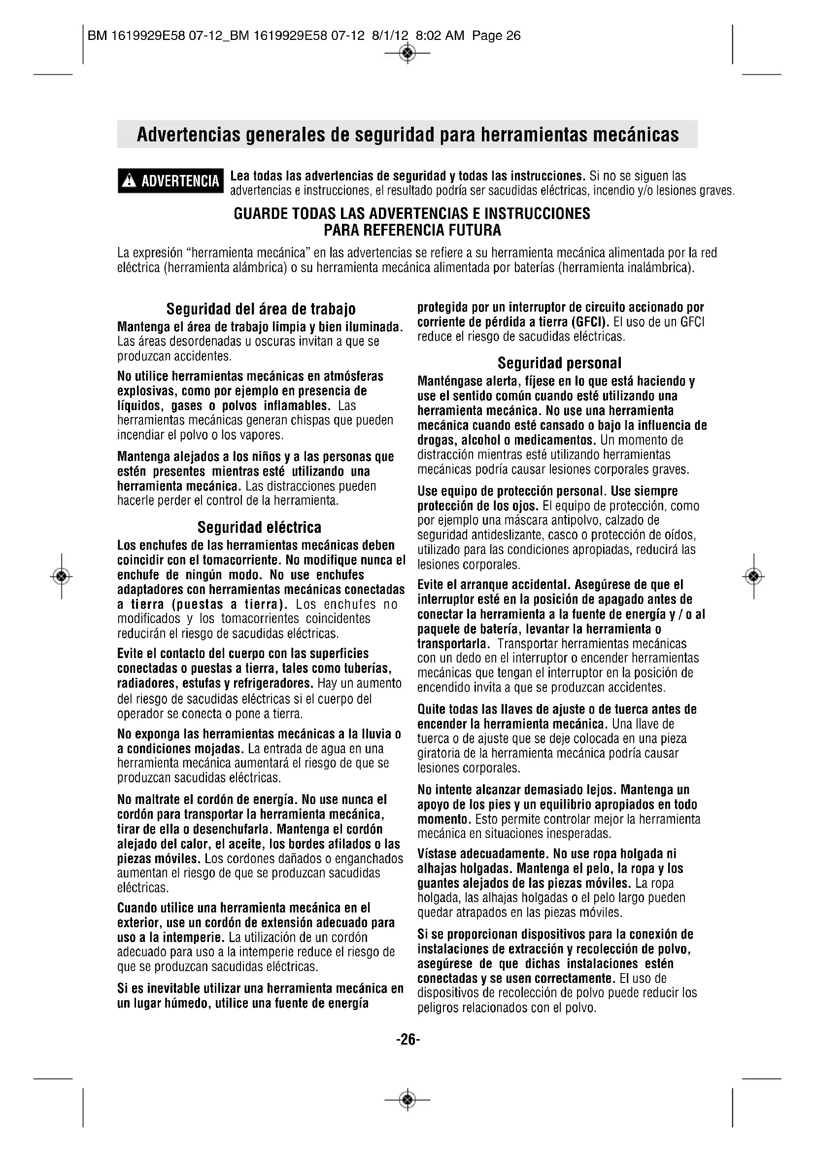 BM 1619929E58 07-12_BM 1619929E58 07-12 8/1/12 8:02 AM Page 25-26- Lea todas las advertencias de seguridad y todas las instrucciones. Si no se siguen las advertencias e instrucciones, el resultado podría ser sacudidas eléctricas, incendio y/o lesiones graves.