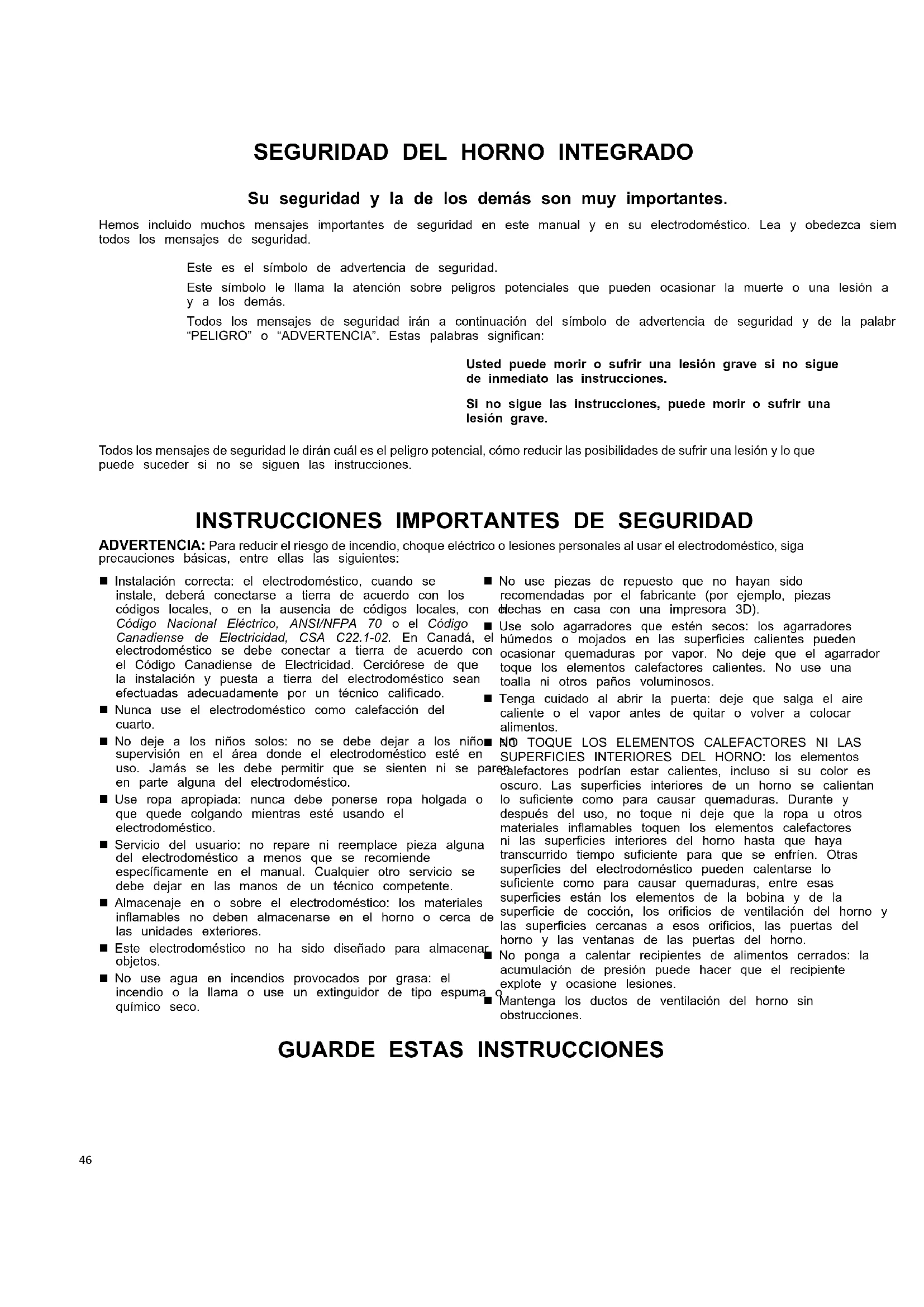 ADVERTENCIA: Para reducir el riesgo de incendio, choque eléctrico o lesiones personales al usar el electrodoméstico, siga precauciones básicas, entre ellas las siguientes: Instalación correcta: el electrodoméstico, cuando se instale, deberá conectarse a tierra de acuerdo con los códigos locales, o en la ausencia de códigos locales, con el Código Nacional Eléctrico, ANSI/NFPA 70 o el Código Canadiense de Electricidad, CSA C22.1-02. En Canadá, el electrodoméstico se debe conectar a tierra de acuerdo con el Código Canadiense de Electricidad. Cerciórese de que la instalación y puesta a tierra del electrodoméstico sean efectuadas adecuadamente por un técnico calificado. Nunca use el electrodoméstico como calefacción del cuarto. No deje a los niños solos: no se debe dejar a los niños sin supervisión en el área donde el electrodoméstico esté en uso. Jamás se les debe permitir que se sienten ni se paren en parte alguna del electrodoméstico. Use ropa apropiada: nunca debe ponerse ropa holgada o que quede colgando mientras esté usando el electrodoméstico. Servicio del usuario: no repare ni reemplace pieza alguna del electrodoméstico a menos que se recomiende específicamente en el manual. Cualquier otro servicio se debe dejar en las manos de un técnico competente. Almacenaje en o sobre el electrodoméstico: los materiales inflamables no deben almacenarse en el horno o cerca de las unidades exteriores. Este electrodoméstico no ha sido diseñado para almacenar objetos. No use agua en incendios provocados por grasa: el incendio o la llama o use un extinguidor de tipo espuma o químico seco. No use piezas de repuesto que no hayan sido recomendadas por el fabricante (por ejemplo, piezas hechas en casa con una impresora 3D). Use solo agarradores que estén secos: los agarradores húmedos o mojados en las superficies calientes pueden ocasionar quemaduras por vapor. No deje que el agarrador toque los elementos calefactores calientes. No use una toalla ni otros paños voluminosos. Tenga cuidado al abrir la puerta: deje que salga el aire caliente o el vapor antes de quitar o volver a colocar alimentos. NO TOQUE LOS ELEMENTOS CALEFACTORES NI LAS SUPERFICIES INTERIORES DEL HORNO: los elementos calefactores podrían estar calientes, incluso si su color es oscuro. Las superficies interiores de un horno se calientan lo suficiente como para causar quemaduras. Durante y después del uso, no toque ni deje que la ropa u otros materiales inflamables toquen los elementos calefactores ni las superficies interiores del horno hasta que haya transcurrido tiempo suficiente para que se enfríen. Otras superficies del electrodoméstico pueden calentarse lo suficiente como para causar quemaduras, entre esas superficies están los elementos de la bobina y de la superficie de cocción, los orificios de ventilación del horno y las superficies cercanas a esos orificios, las puertas del horno y las ventanas de las puertas del horno. No ponga a calentar recipientes de alimentos cerrados: la acumulación de presión puede hacer que el recipiente explote y ocasione lesiones. Mantenga los ductos de ventilación del horno sin obstrucciones.