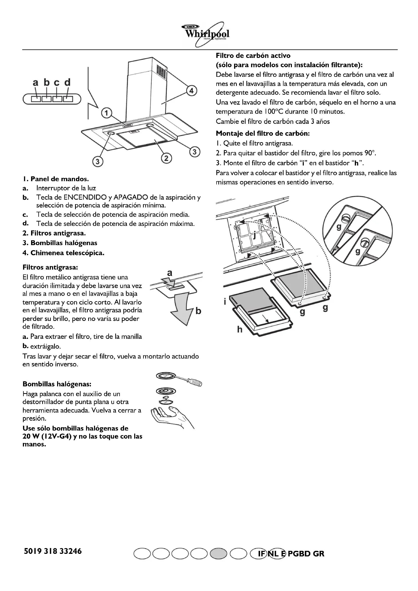 extráigalo. Tras lavar y dejar secar el filtro, vuelva a montarlo actuando en sentido inverso. Bombillas halógenas: Haga palanca con el auxilio de un destornillador de punta plana u otra herramienta adecuada. Vuelva a cerrar a presión. Use sólo bombillas halógenas de 20 W (12V-G4) y no las toque con las manos. Filtro de carbón activo (sólo para modelos con instalación filtrante): Debe lavarse el filtro antigrasa y el filtro de carbón una vez al mes en el lavavajillas a la temperatura más elevada, con un detergente adecuado. Se recomienda lavar el filtro solo. Una vez lavado el filtro de carbón, séquelo en el horno a una temperatura de 100ºC durante 10 minutos. Cambie el filtro de carbón cada 3 años Montaje del filtro de carbón: