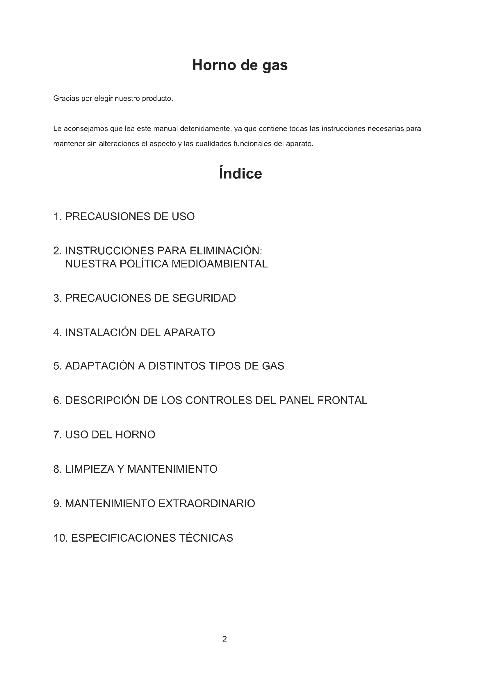 ES2 Horno de gas Gracias por elegir nuestro producto. Le aconsejamos que lea este manual detenidamente, ya que contiene todas las instrucciones necesarias para mantener sin alteraciones el aspecto y las cualidades funcionales del aparato. Índice