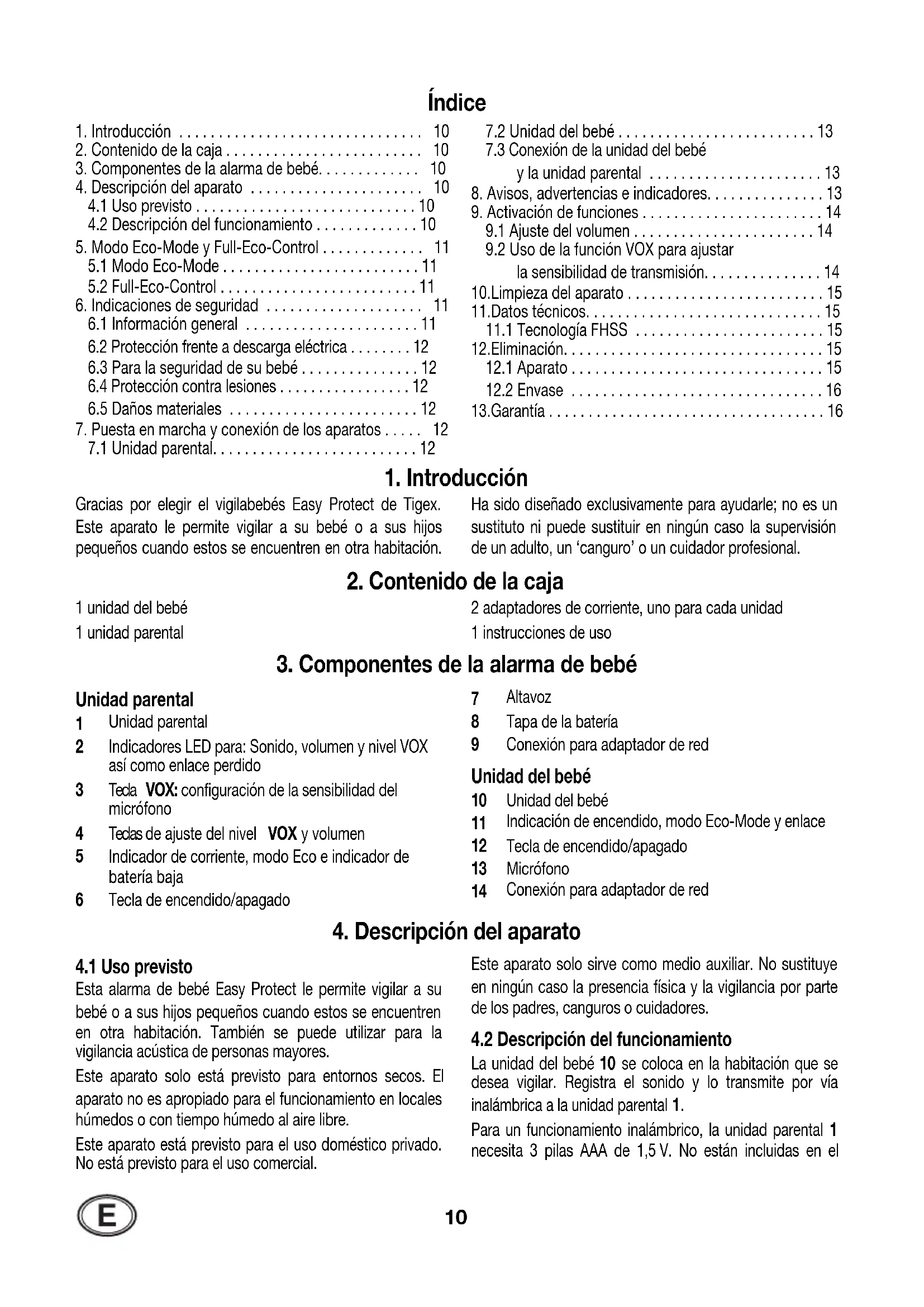 Gracias por elegir el vigilabebés Easy Protect de Tigex. Este aparato le permite vigilar a su bebé o a sus hijos pequeños cuando estos se encuentren en otra habitación. Ha sido diseñado exclusivamente para ayudarle; no es un sustituto ni puede sustituir en ningún caso la supervisión de un adulto, un ‘canguro’ o un cuidador profesional.