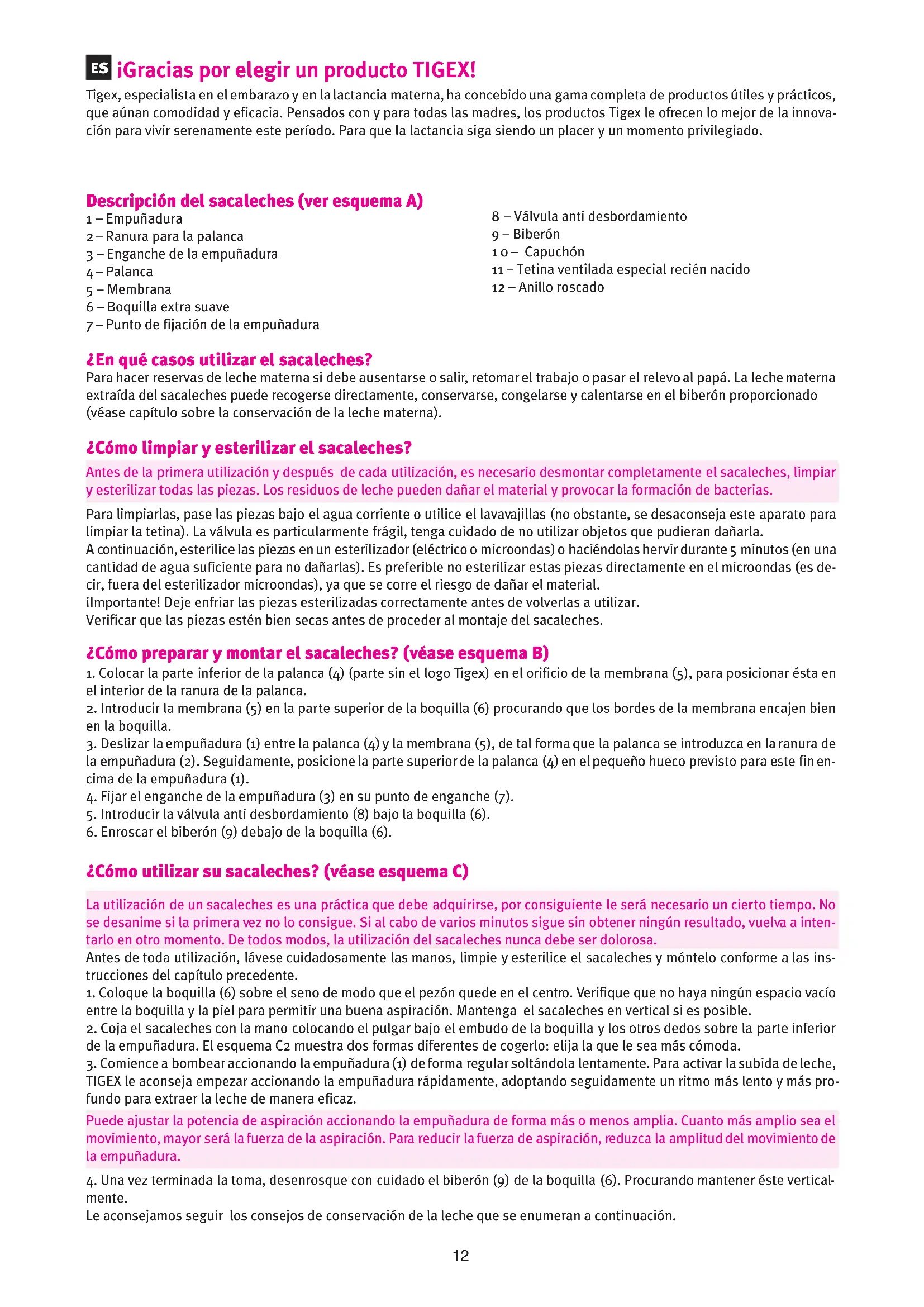 - The wide-based teat Tigex has to be used with wide-based bottles Tigex INTUITION and MULTIFLOW.12 ¿En qué casos utilizar el sacaleches? Para hacer reservas de leche materna si debe ausentarse o salir, retomar el trabajo o pasar el relevo al papá. La leche materna extraída del sacaleches puede recogerse directamente, conservarse, congelarse y calentarse en el biberón proporcionado (véase capítulo sobre la conservación de la leche materna). ¿Cómo limpiar y esterilizar el sacaleches? Antes de la primera utilización y después de cada utilización, es necesario desmontar completamente el sacaleches, limpiar y esterilizar todas las piezas. Los residuos de leche pueden dañar el material y provocar la formación de bacterias. Para limpiarlas, pase las piezas bajo el agua corriente o utilice el lavavajillas (no obstante, se desaconseja este aparato para limpiar la tetina). La válvula es particularmente frágil, tenga cuidado de no utilizar objetos que pudieran dañarla. A continuación, esterilice las piezas en un esterilizador (eléctrico o microondas) o haciéndolas hervir durante 5 minutos (en una cantidad de agua suficiente para no dañarlas). Es preferible no esterilizar estas piezas directamente en el microondas (es de- cir, fuera del esterilizador microondas), ya que se corre el riesgo de dañar el material. ¡Importante! Deje enfriar las piezas esterilizadas correctamente antes de volverlas a utilizar. Verificar que las piezas estén bien secas antes de proceder al montaje del sacaleches. ¿Cómo preparar y montar el sacaleches? (véase esquema B) 1. Colocar la parte inferior de la palanca (4) (parte sin el logo Tigex) en el orificio de la membrana (5), para posicionar ésta en el interior de la ranura de la palanca. 2. Introducir la membrana (5) en la parte superior de la boquilla (6) procurando que los bordes de la membrana encajen bien en la boquilla. 3. Deslizar la empuñadura (1) entre la palanca (4) y la membrana (5), de tal forma que la palanca se introduzca en la ranura de la empuñadura (2). Seguidamente, posicione la parte superior de la palanca (4) en el pequeño hueco previsto para este fin en- cima de la empuñadura (1).