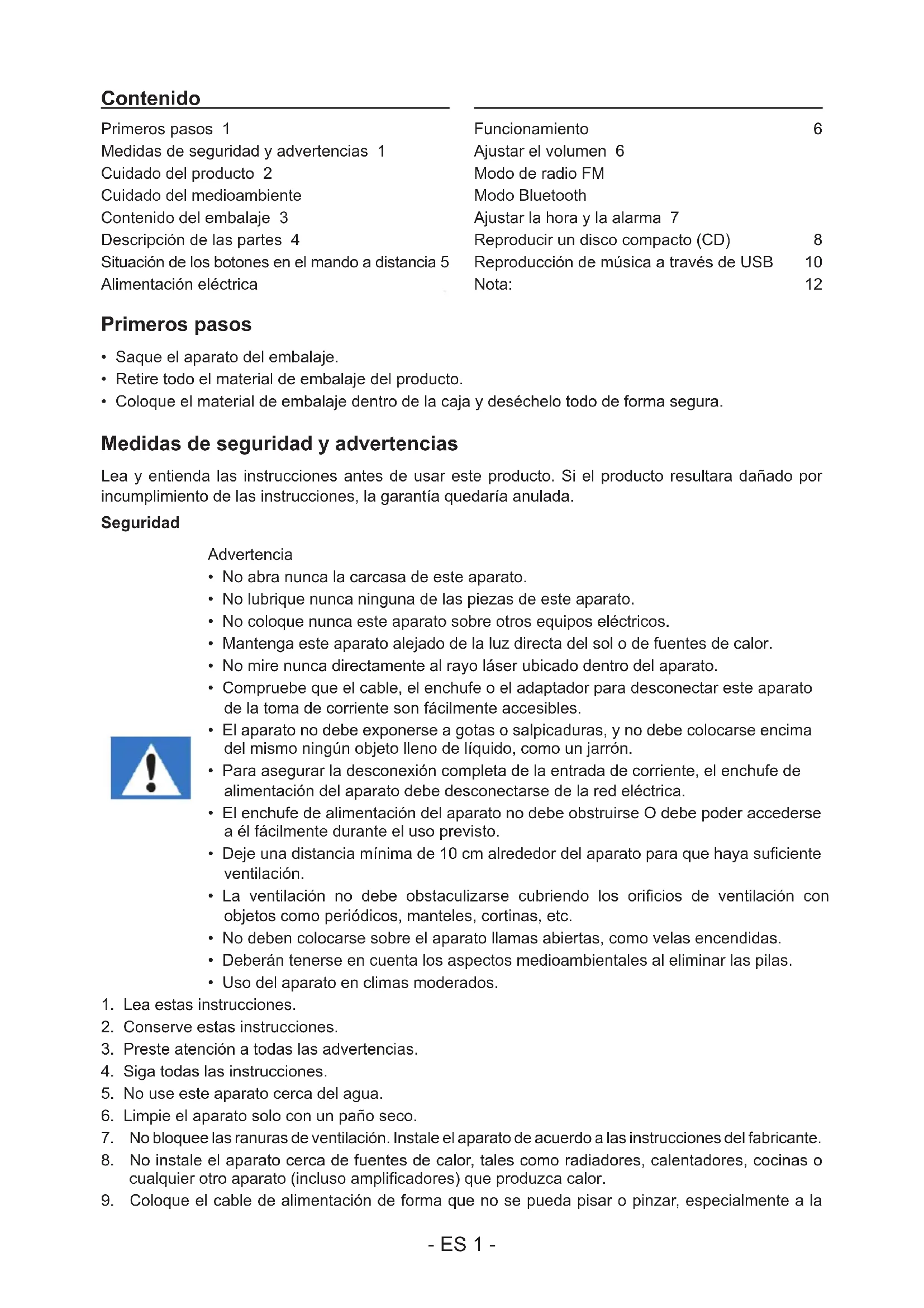 Primeros pasos 1 Medidas de seguridad y advertencias 1 Cuidado del producto 2 Cuidado del medioambiente 2 Contenido del embalaje 3 Descripción de las partes 4 Situación de los botones en el mando a distancia 5 Alimentación eléctrica 5 Funcionamiento 6 Ajustar el volumen 6 Modo de radio FM 6 Modo Bluetooth 6 Ajustar la hora y la alarma 7 Reproducir un disco compacto (CD) 8 Reproducción de música a través de USB 10 Nota: 12 Contenido- ES 2 - altura de los enchufes, tomas de corriente y otros puntos de salida del aparato.