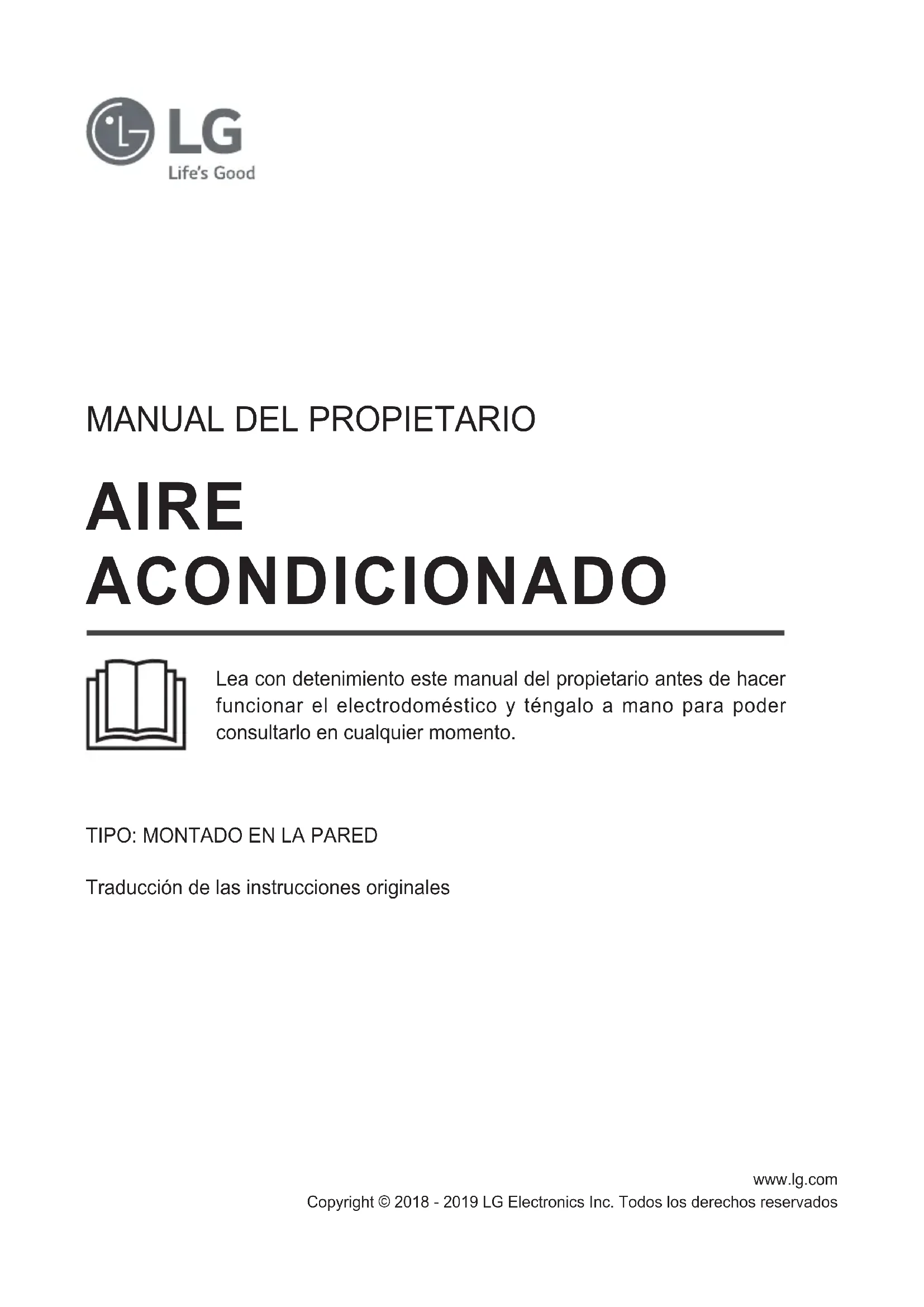 Lea con detenimiento este manual del propietario antes de hacer funcionar el electrodoméstico y téngalo a mano para poder consultarlo en cualquier momento. Traducción de las instrucciones originalesÍNDICE Este manual puede contener imágenes o contenido diferente del modelo que haya adquirido. Este manual está sujeto a revisión por parte del fabricante. Información del aviso de software de código abierto Para obtener el código fuente correspondiente GPL, LGPL, MPL y otras licencias de código abierto que contiene este producto, visite http://opensource.lge.com. Además del código fuente, podrá descargar las condiciones de las licencias, exención de responsabilidad de la garantía y avisos de copyright. LG Electronics también le proporcionará código abierto en CD-ROM por un importe que cubre los gastos de su distribución (como el soporte, el envío y la manipulación) previa solicitud por correo electrónico a opensource@lge.com. Esta oferta es válida durante un periodo de tres años a partir del último envío de este producto. Esta oferta es válida para cualquier persona que reciba esta información.