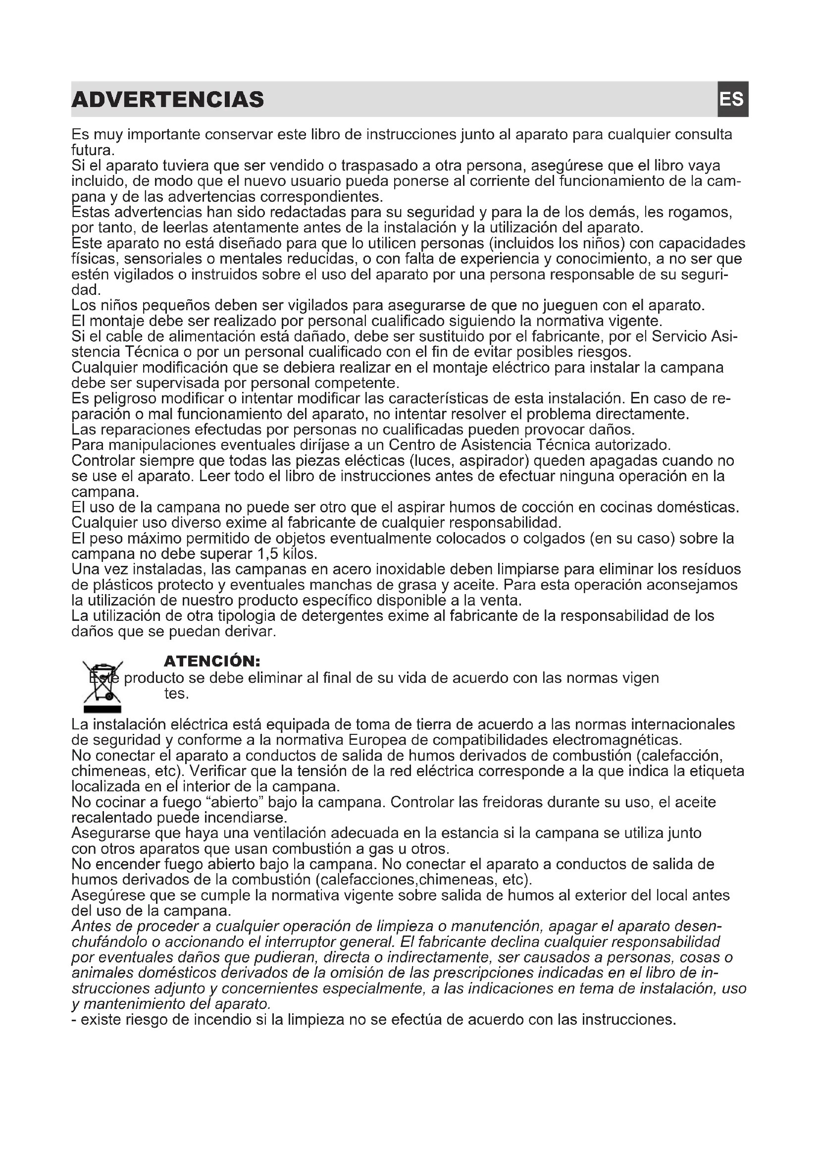 Controlar siempre que todas las piezas electrolyticas (luces, aspirador) queden apagadas cuando no se use el aparato. Leer todo el libro de instructuciones antes de efectuar ninguna operación en la campana.