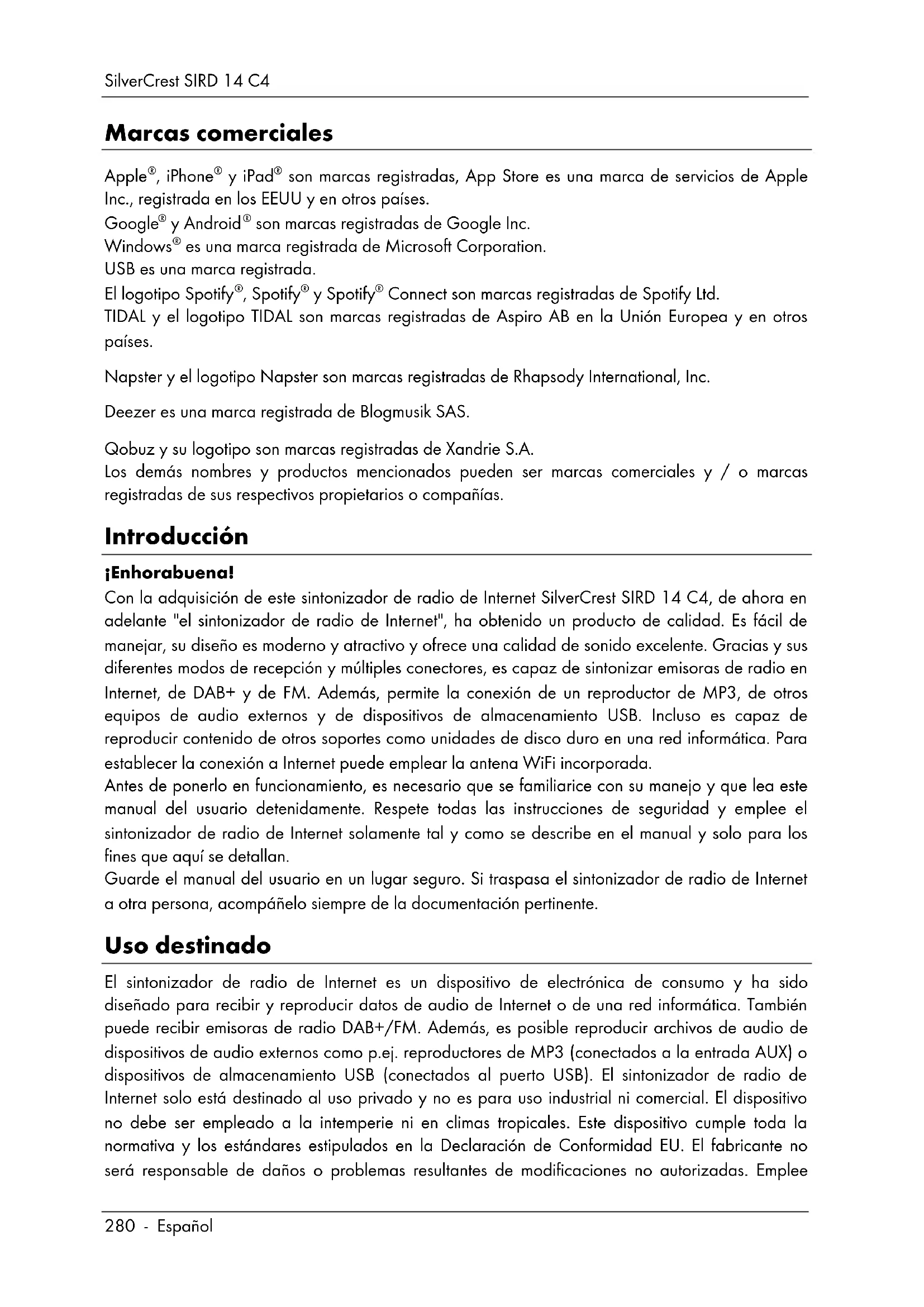 Connect son marcas registradas de Spotify Ltd. TIDAL y el logotipo TIDAL son marcas registradas de Aspiro AB en la Unión Europea y en otros países. Napster y el logotipo Napster son marcas registradas de Rhapsody International, Inc. Deezer es una marca registrada de Blogmusik SAS. Qobuz y su logotipo son marcas registradas de Xandrie S.A. Los demás nombres y productos mencionados pueden ser marcas comerciales y / o marcas registradas de sus respectivos propietarios o compañías. Introducción ¡Enhorabuena! Con la adquisición de este sintonizador de radio de Internet SilverCrest SIRD 14 C4, de ahora en adelante "el sintonizador de radio de Internet", ha obtenido un producto de calidad. Es fácil de manejar, su diseño es moderno y atractivo y ofrece una calidad de sonido excelente. Gracias y sus diferentes modos de recepción y múltiples conectores, es capaz de sintonizar emisoras de radio en Internet, de DAB+ y de FM. Además, permite la conexión de un reproductor de MP3, de otros equipos de audio externos y de dispositivos de almacenamiento USB. Incluso es capaz de reproducir contenido de otros soportes como unidades de disco duro en una red informática. Para establecer la conexión a Internet puede emplear la antena WiFi incorporada. Antes de ponerlo en funcionamiento, es necesario que se familiarice con su manejo y que lea este manual del usuario detenidamente. Respete todas las instrucciones de seguridad y emplee el sintonizador de radio de Internet solamente tal y como se describe en el manual y solo para los fines que aquí se detallan. Guarde el manual del usuario en un lugar seguro. Si traspasa el sintonizador de radio de Internet a otra persona, acompáñelo siempre de la documentación pertinente. Uso destinado El sintonizador de radio de Internet es un dispositivo de electrónica de consumo y ha sido diseñado para recibir y reproducir datos de audio de Internet o de una red informática. También puede recibir emisoras de radio DAB+/FM. Además, es posible reproducir archivos de audio de dispositivos de audio externos como p.ej. reproductores de MP3 (conectados a la entrada AUX) o dispositivos de almacenamiento USB (conectados al puerto USB). El sintonizador de radio de Internet solo está destinado al uso privado y no es para uso industrial ni comercial. El dispositivo no debe ser empleado a la intemperie ni en climas tropicales. Este dispositivo cumple toda la normativa y los estándares estipulados en la Declaración de Conformidad EU. El fabricante no será responsable de daños o problemas resultantes de modificaciones no autorizadas. EmpleeSilverCrest SIRD 14 C4 Español - 281 solo complementos y accesorios recomendados por el fabricante. Debe respetar y cumplir la legislación y las directivas del país donde emplee el producto. Recuerde que, según los países, pueden existir normas nacionales diferentes en cuanto a las bandas de frecuencias que pueda sintonizar. Está prohibido utilizar información procedente de bandas de frecuencias fuera de las de acceso gratuito y permitido para un uso explícitamente público, y no se puede divulgar su contenido a terceros. Contenido del paquete Desembale el dispositivo y todos los accesorios. Retire el material de embalaje y compruebe que no falte nada y que ninguna pieza presente daños de transporte. En caso de que alguna pieza faltase o estuviera dañada, póngase en contacto con el fabricante. A Sintonizador de radio de Internet SilverCrest SIRD 14 C4 B Mando a distancia C 2 pilas del tipo AAA/LR03, de 1,5 V D Cable de audio 3,5 mm (con conector de tipo clavija) E Adaptador de alimentación F Estas instrucciones de uso (ilustración dibujada)SilverCrest SIRD 14 C4