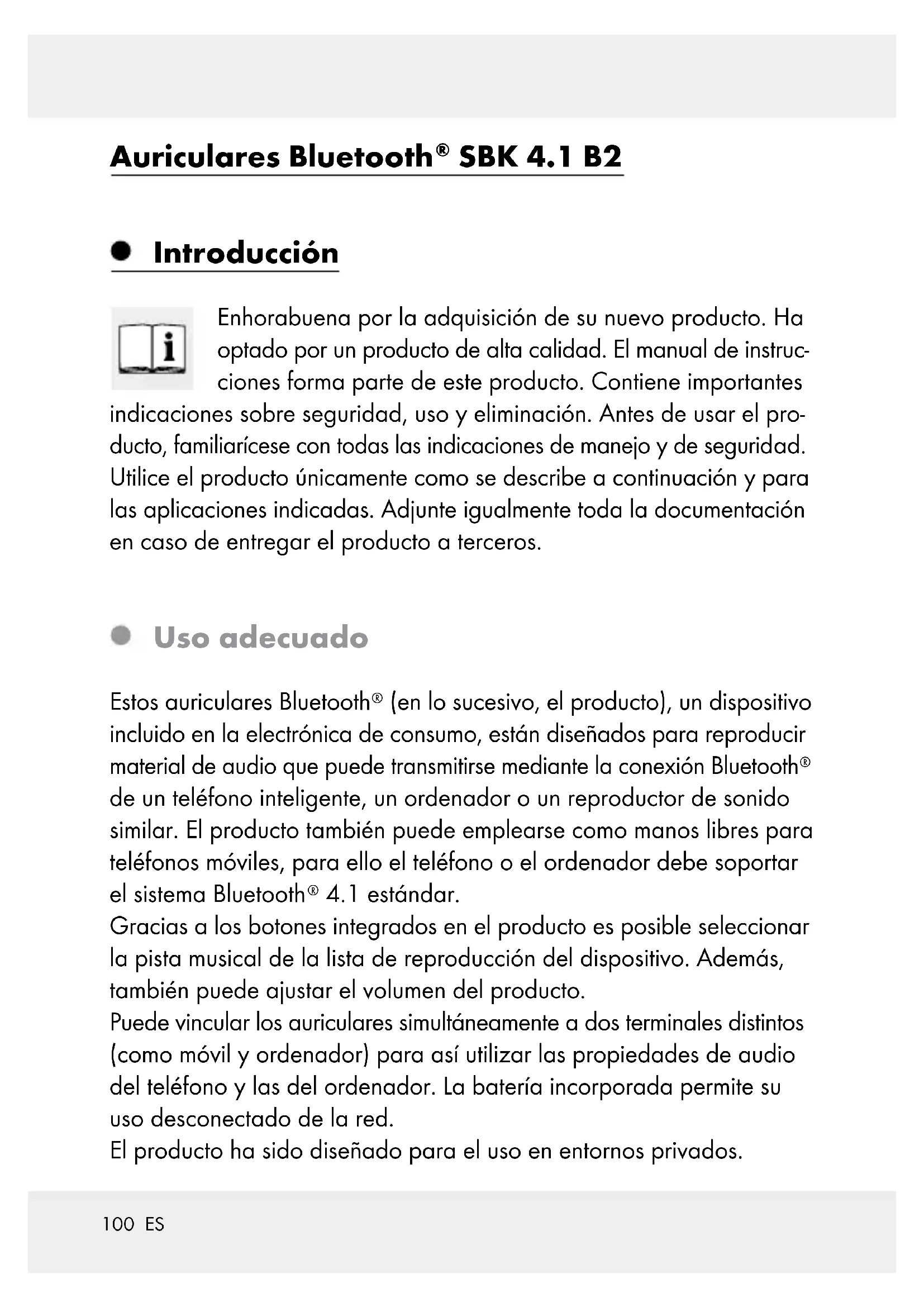 SBK 4.1 B2 Introducción Enhorabuena por la adquisición de su nuevo producto. Ha optado por un producto de alta calidad. El manual de instruc- ciones forma parte de este producto. Contiene importantes indicaciones sobre seguridad, uso y eliminación. Antes de usar el pro- ducto, familiarícese con todas las indicaciones de manejo y de segurid ad. Utilice el producto únicamente como se describe a continuación y para las aplicaciones indicadas. Adjunte igualmente toda la documentación en caso de entregar el producto a terceros. Uso adecuado Estos auriculares Bluetooth